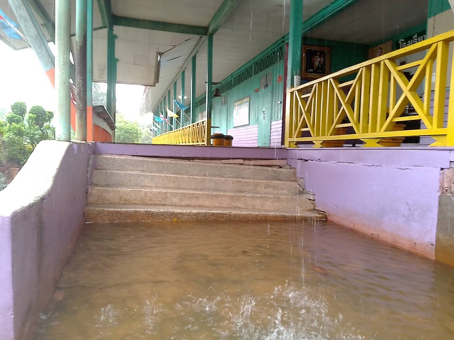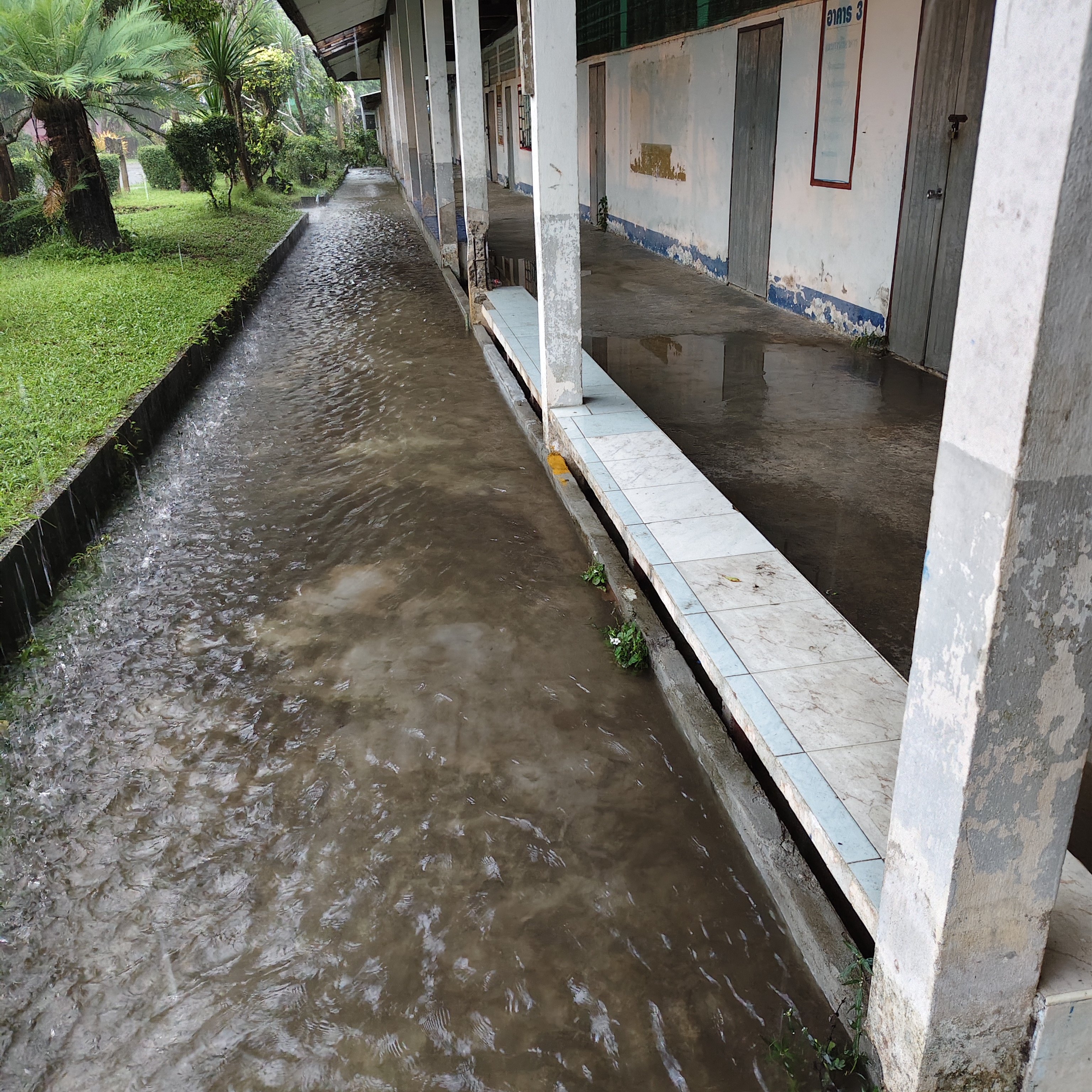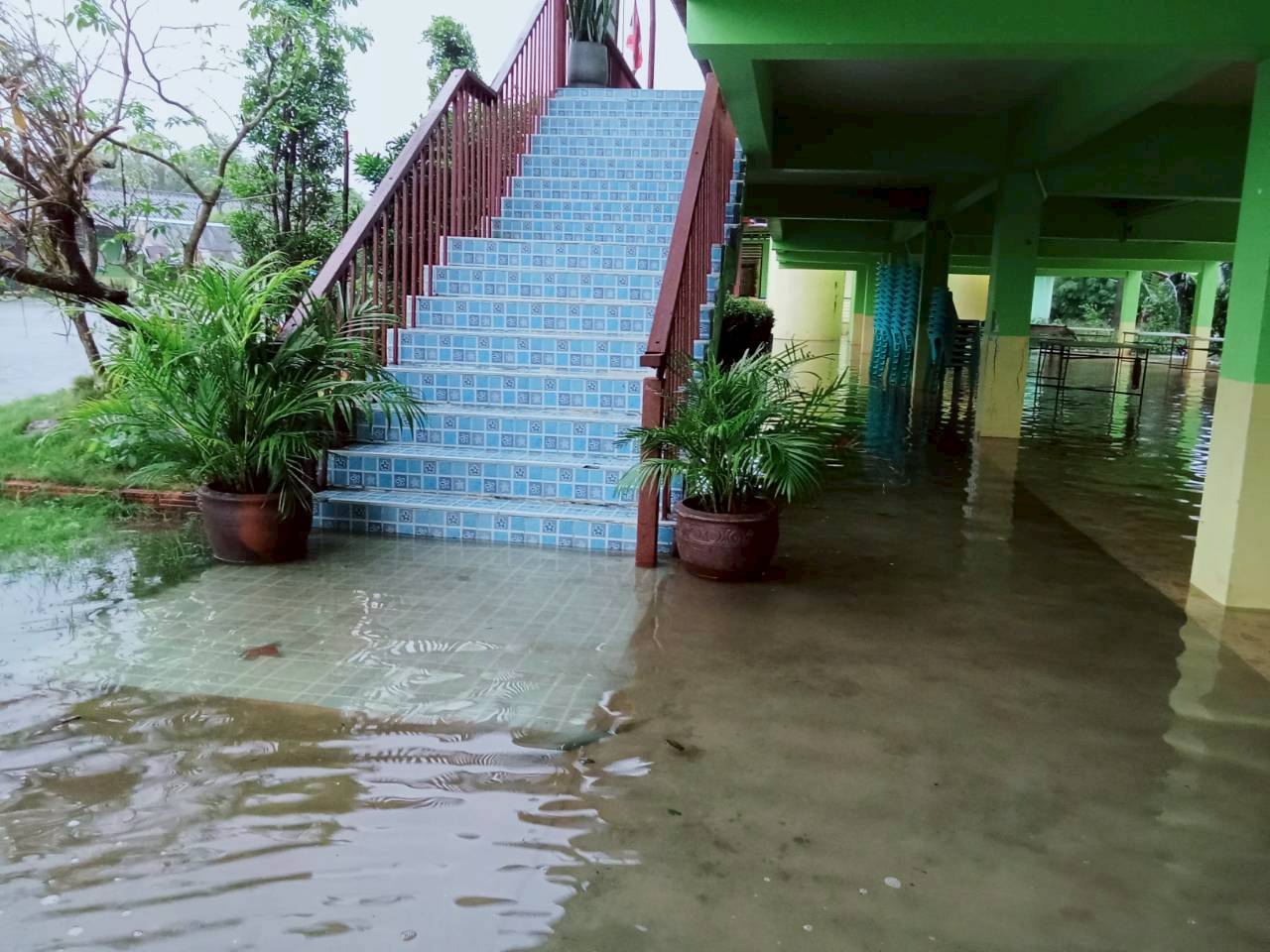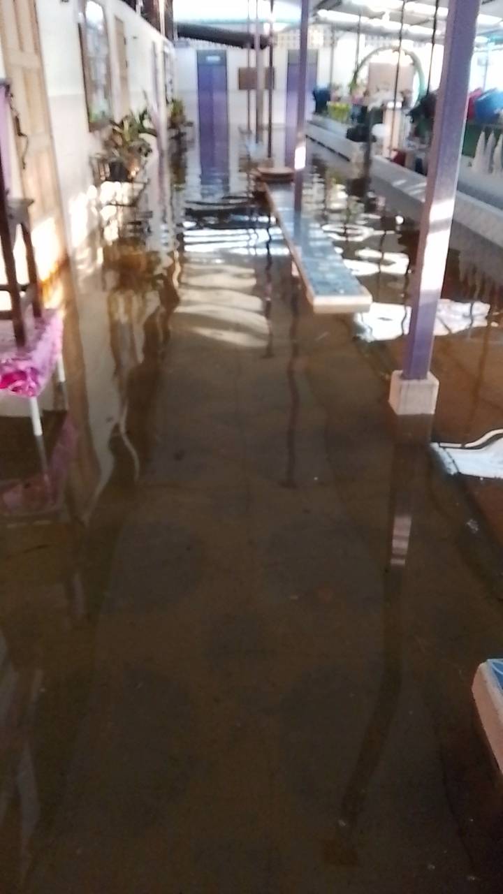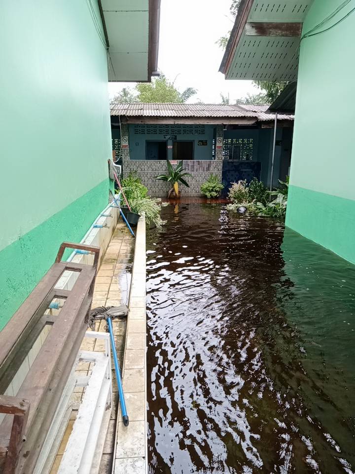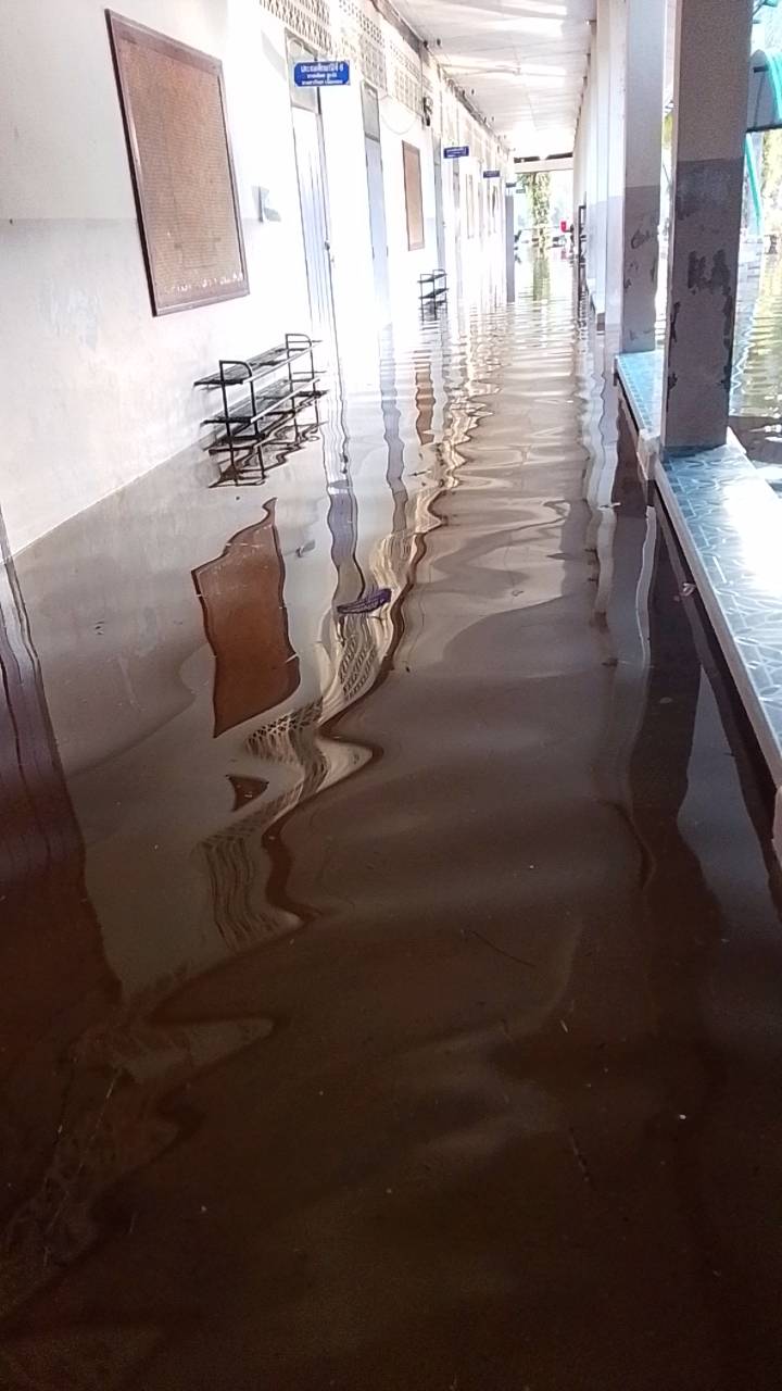 ฝนตกต่อเนื่อง มีน้ำท่วมขังบริเวณหน้าโรงเรียน อาคารเรียน น้ำเข้าห้องเรียน ห้องสมุด ห้องวิทยาศาสตร์ ห้องประชุม