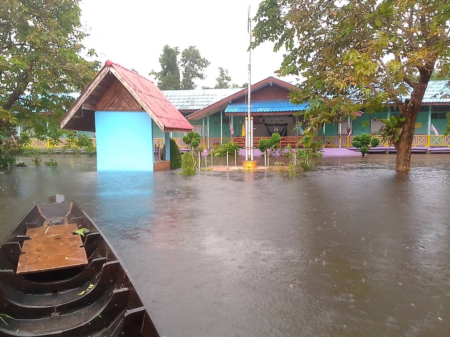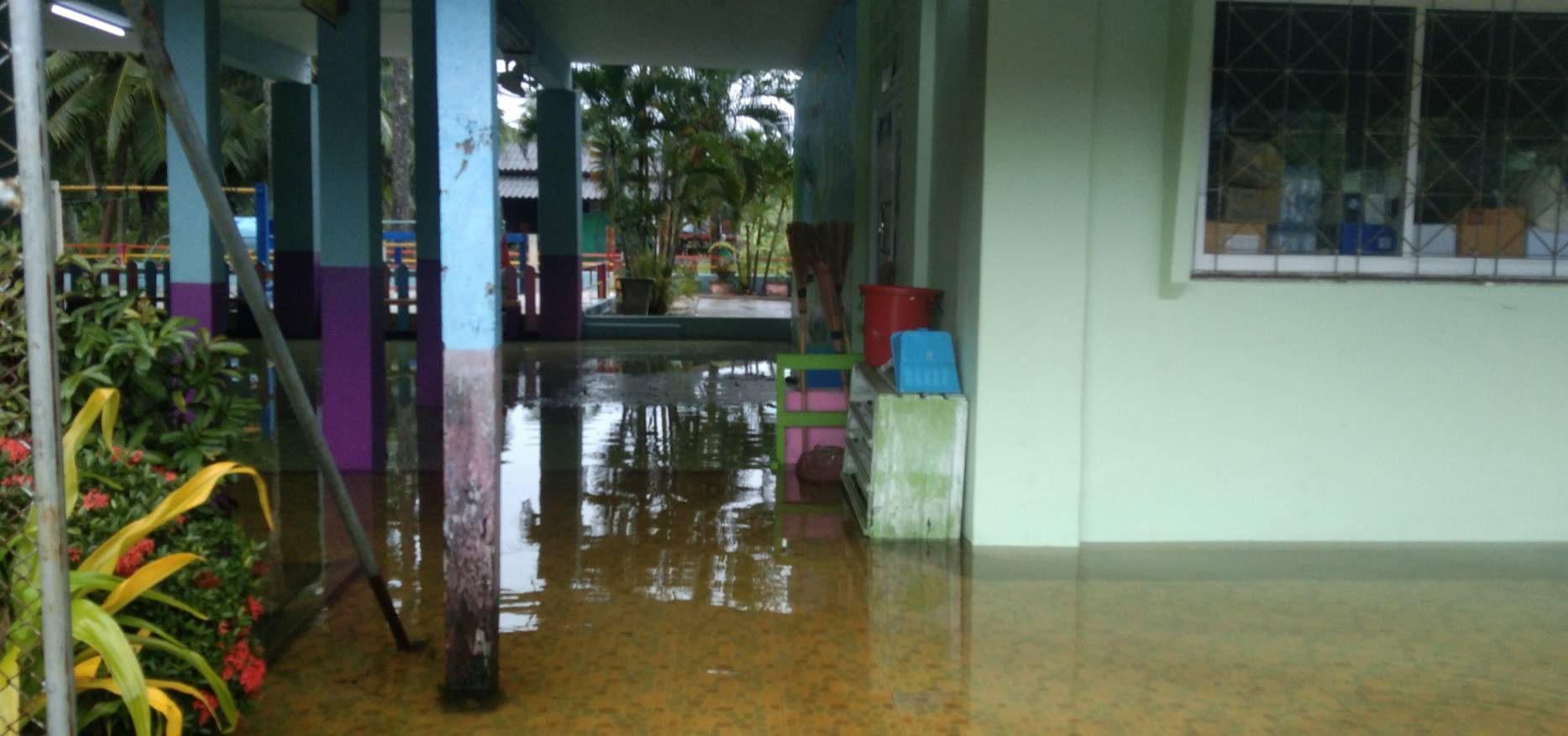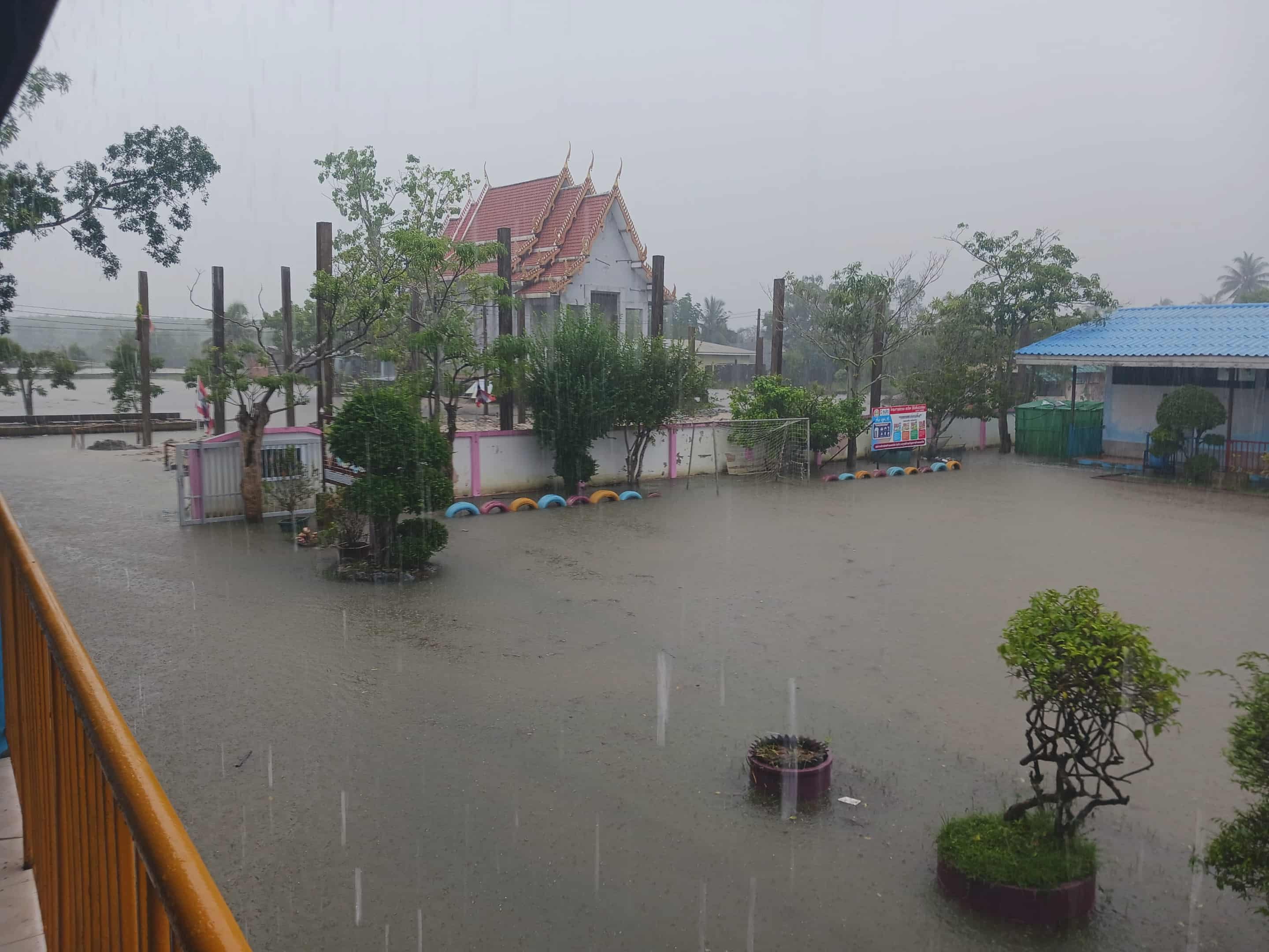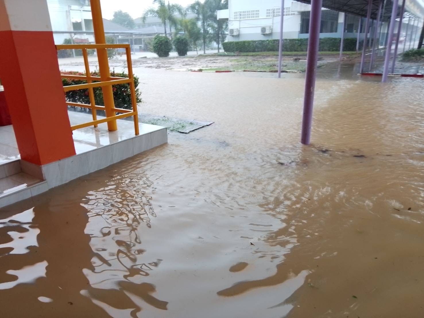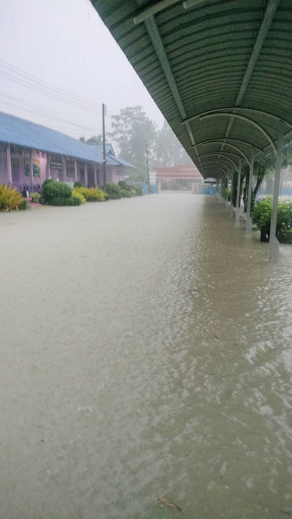 ฝนตกต่อเนื่อง มีน้ำท่วมขังบริเวณหน้าโรงเรียน อาคารเรียน น้ำเข้าห้องเรียน ห้องสมุด ห้องวิทยาศาสตร์ ห้องประชุม
