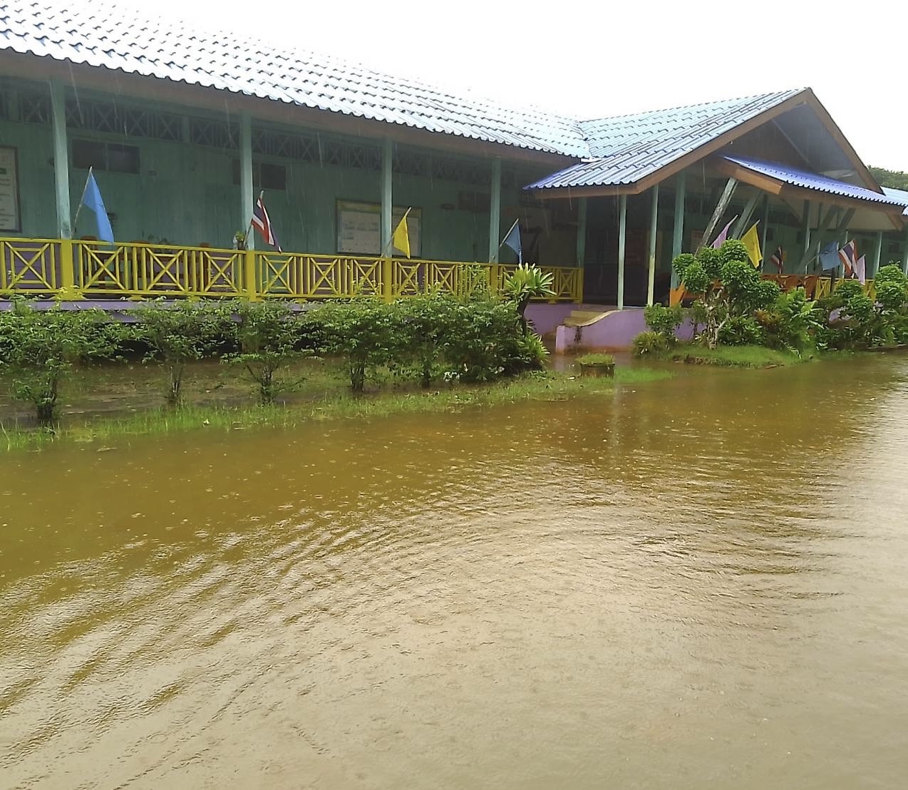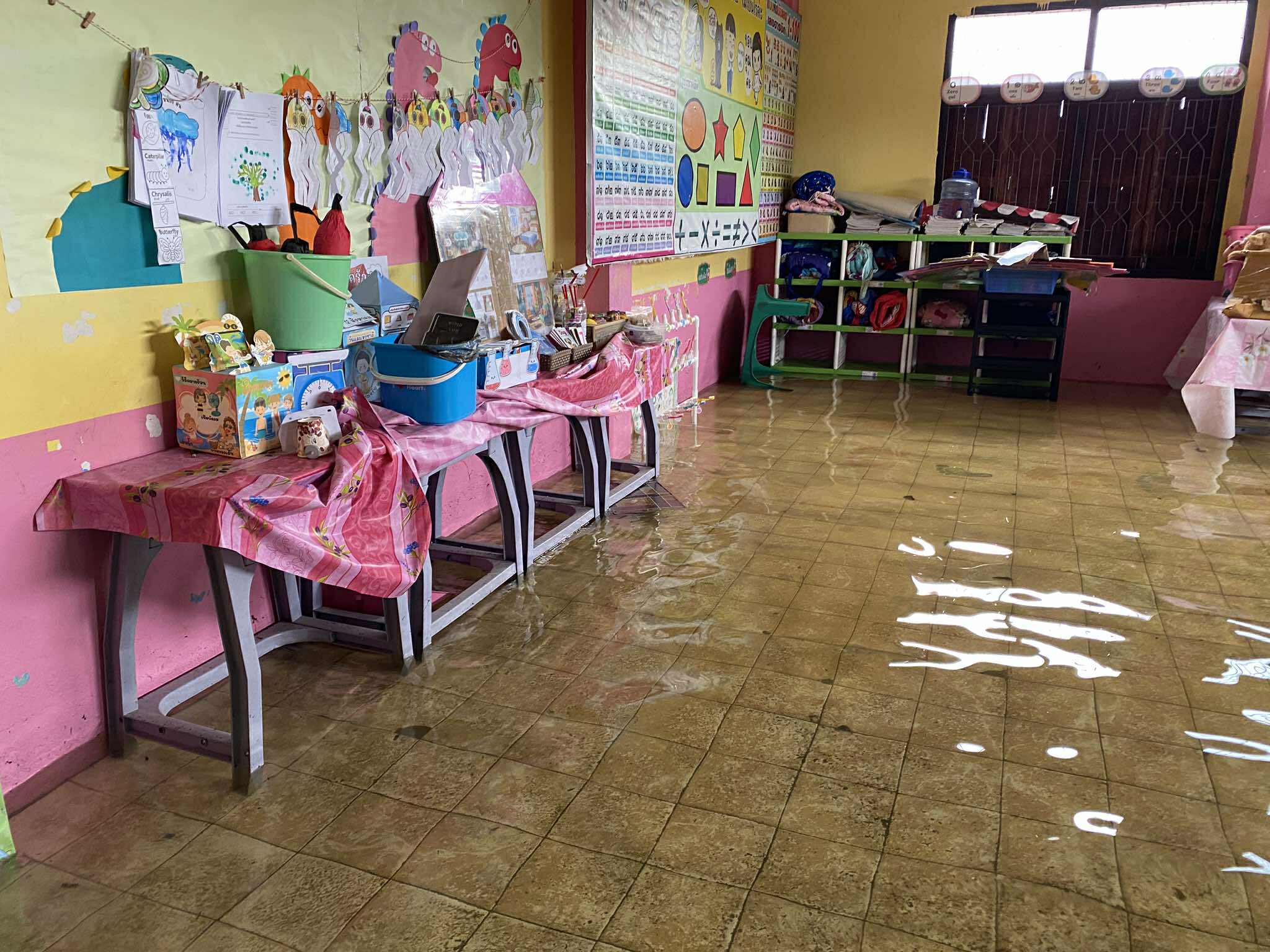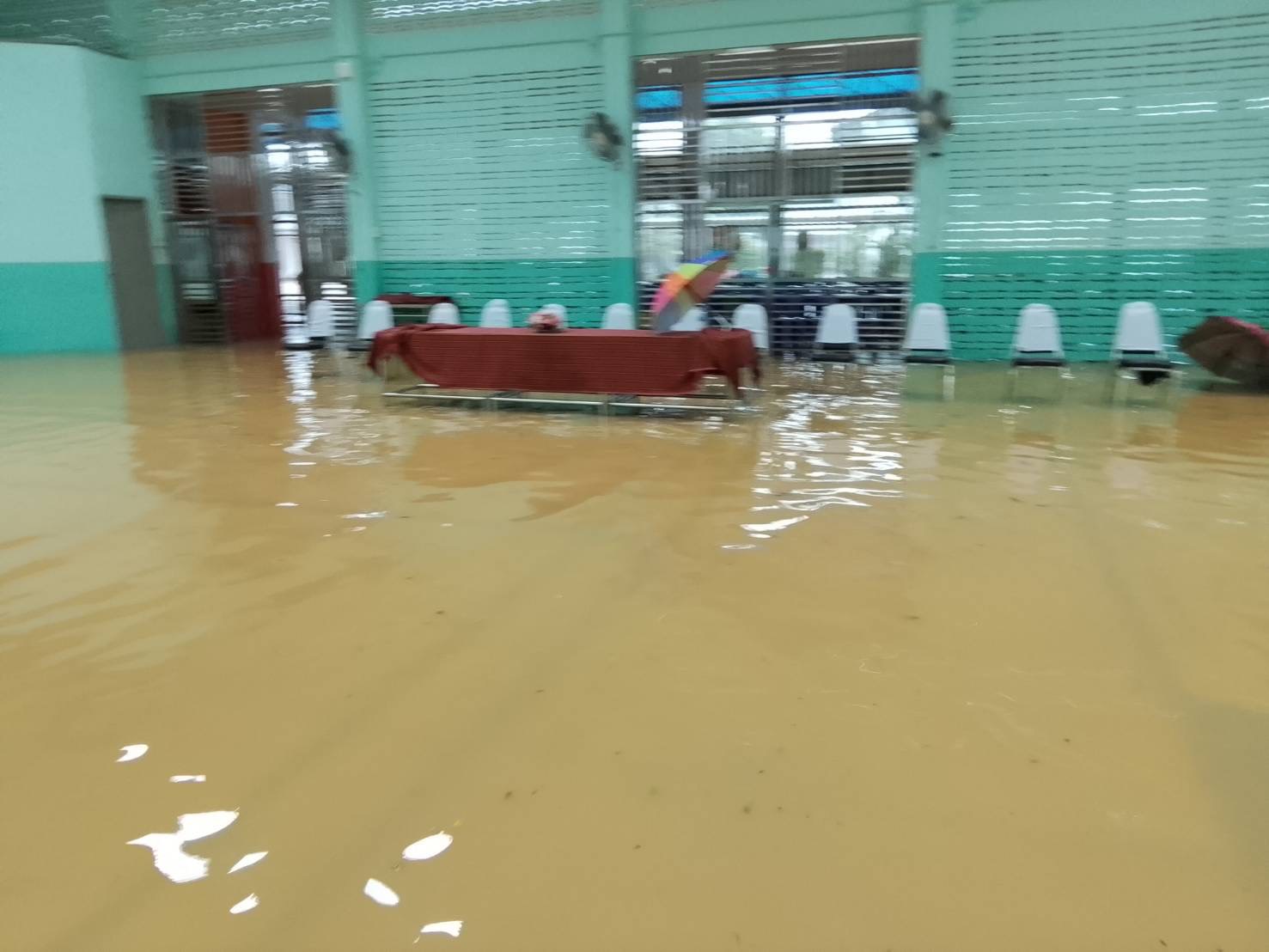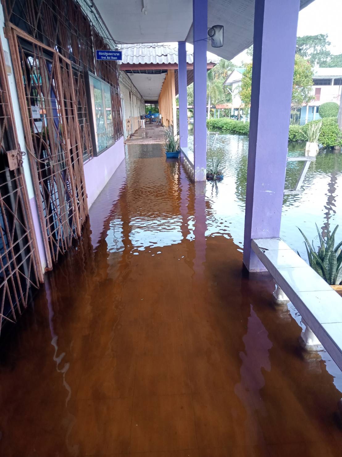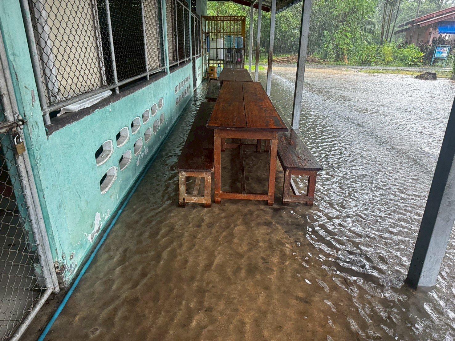 ฝนตกต่อเนื่อง มีน้ำท่วมขังบริเวณหน้าโรงเรียน อาคารเรียน น้ำเข้าห้องเรียน ห้องสมุด ห้องวิทยาศาสตร์ ห้องประชุม