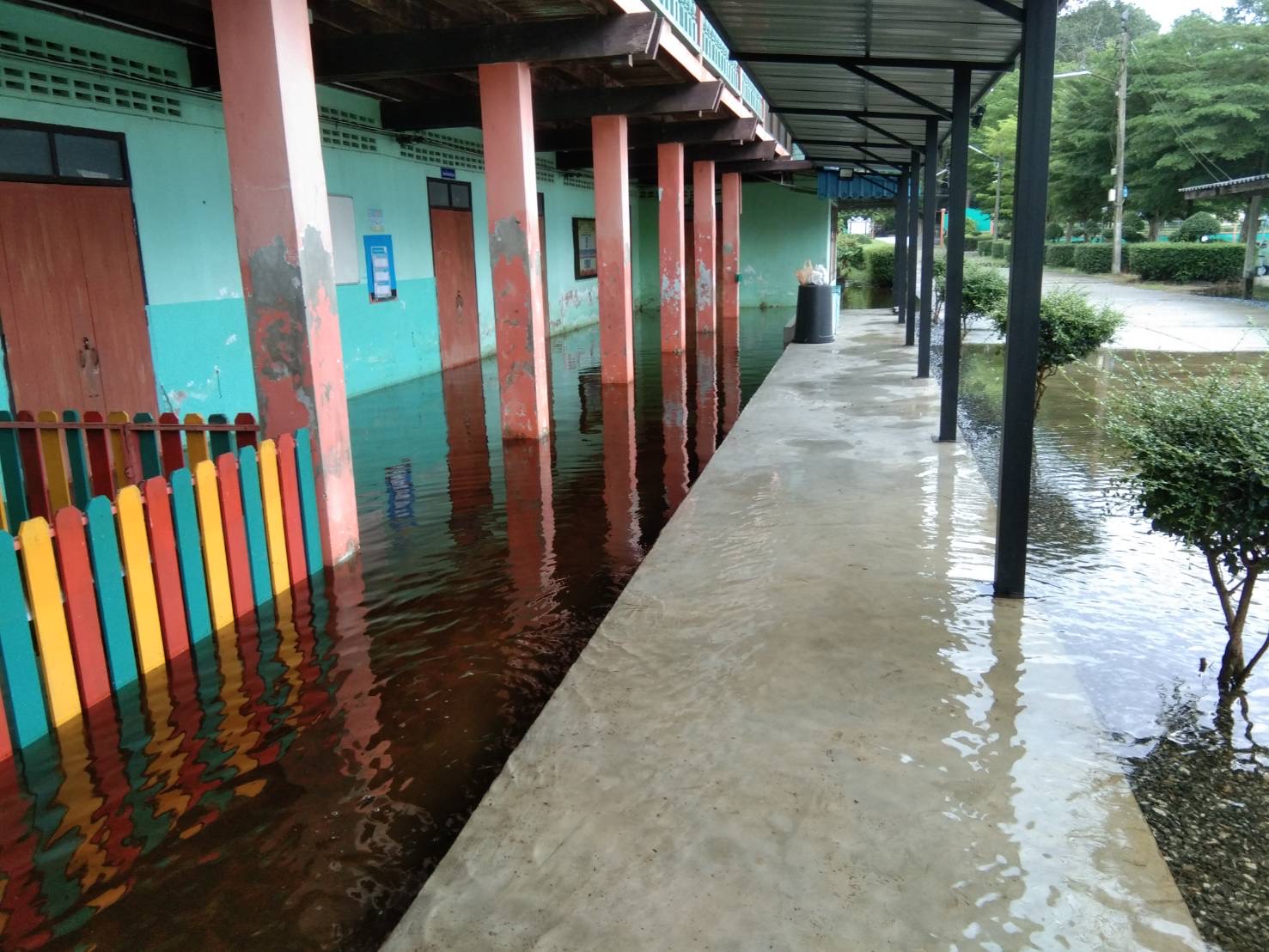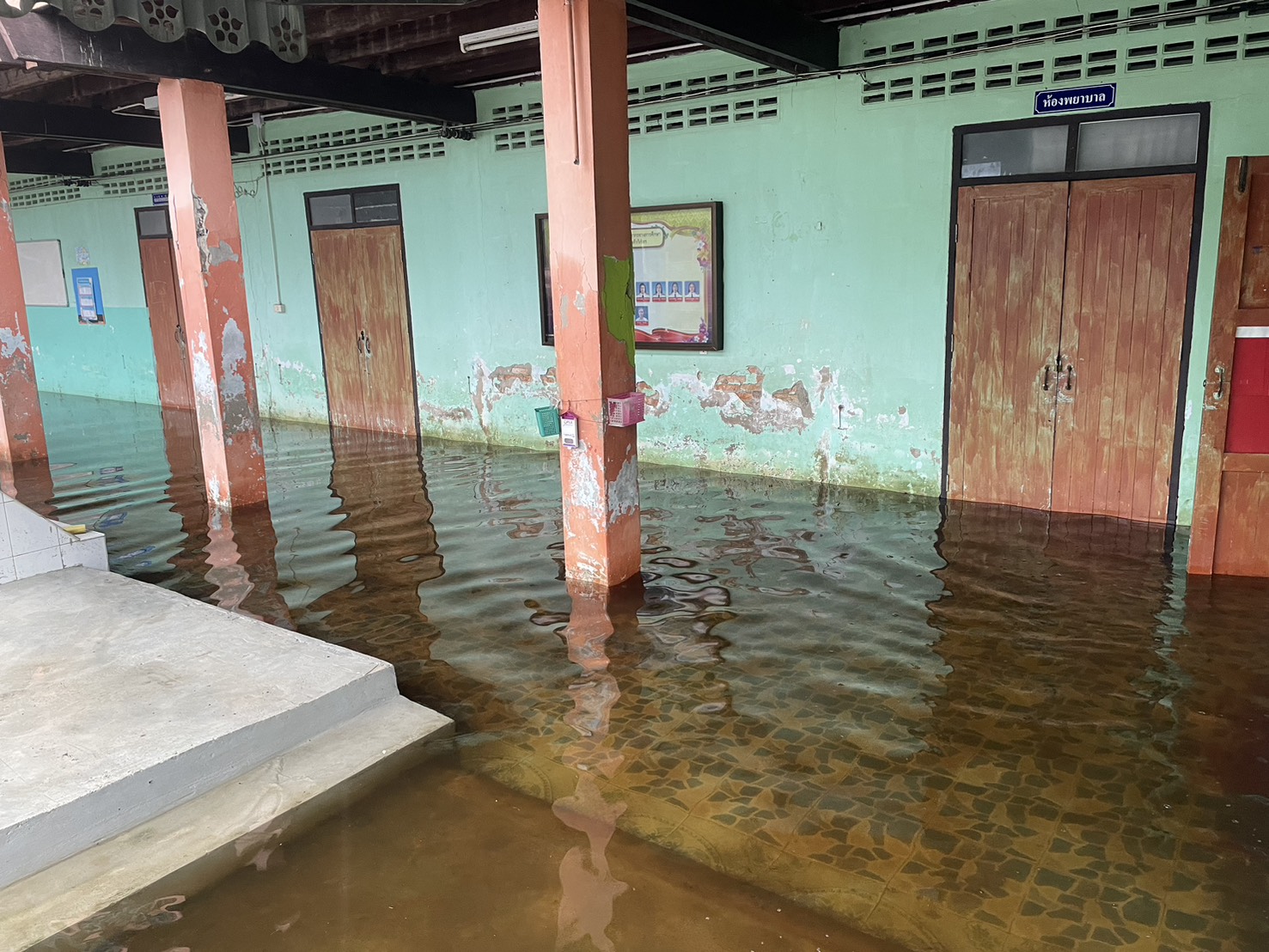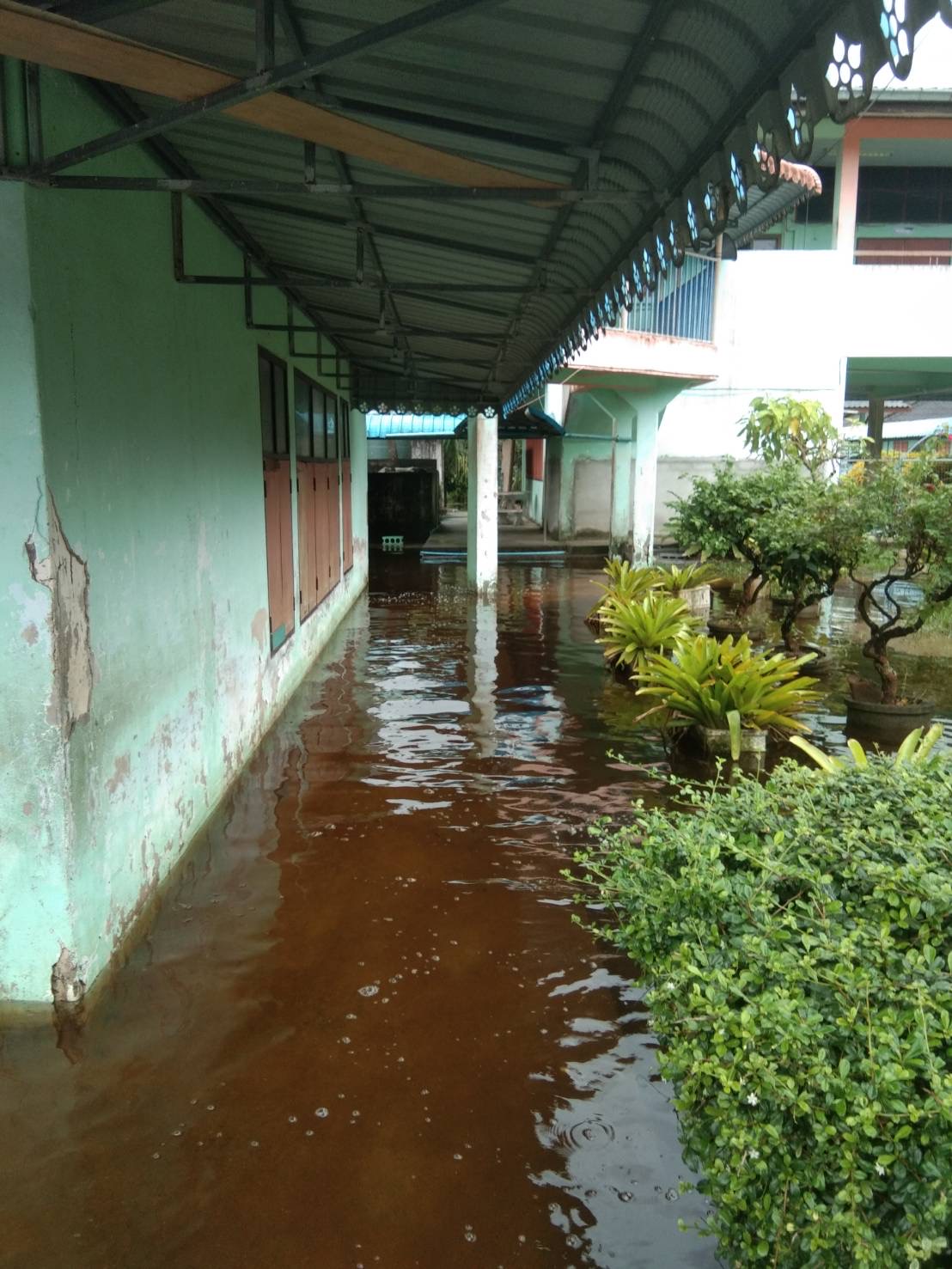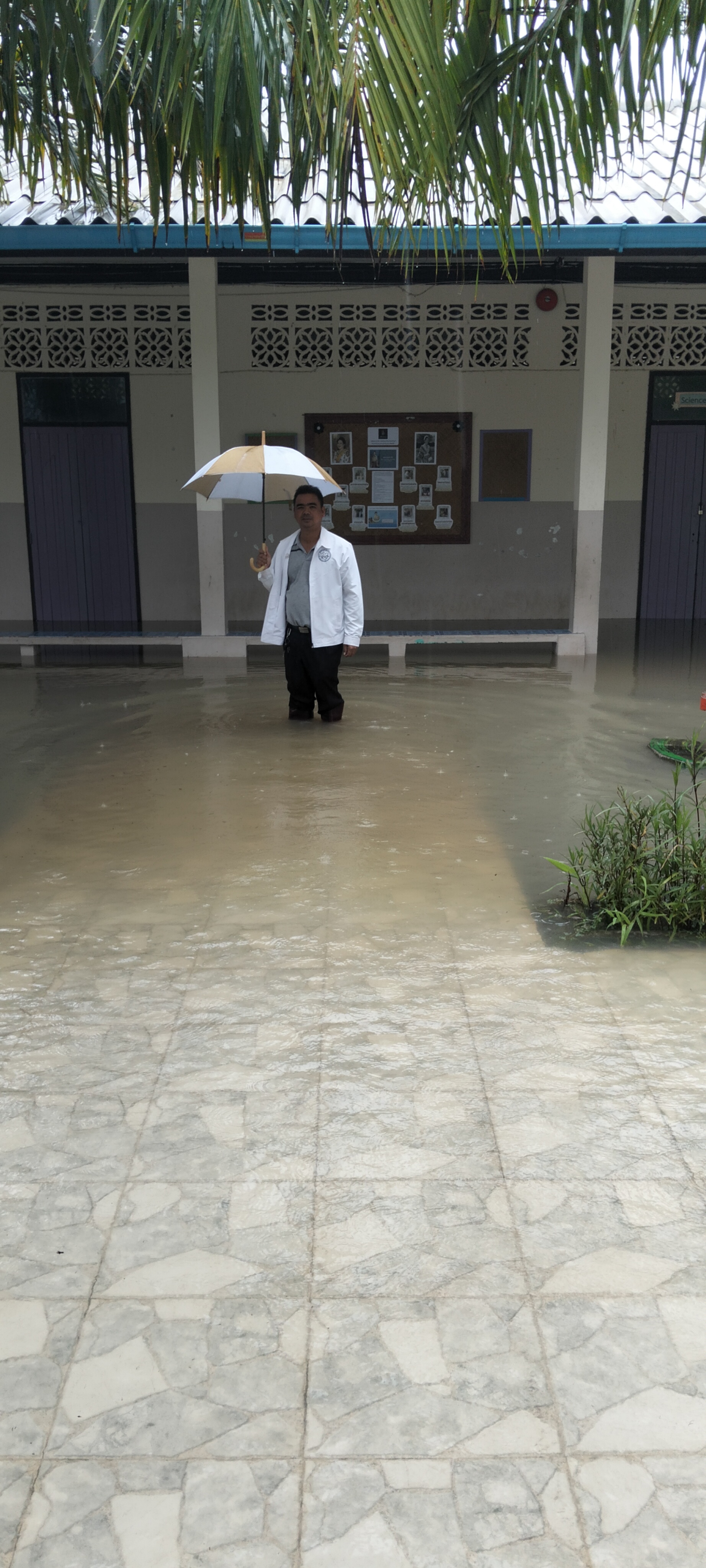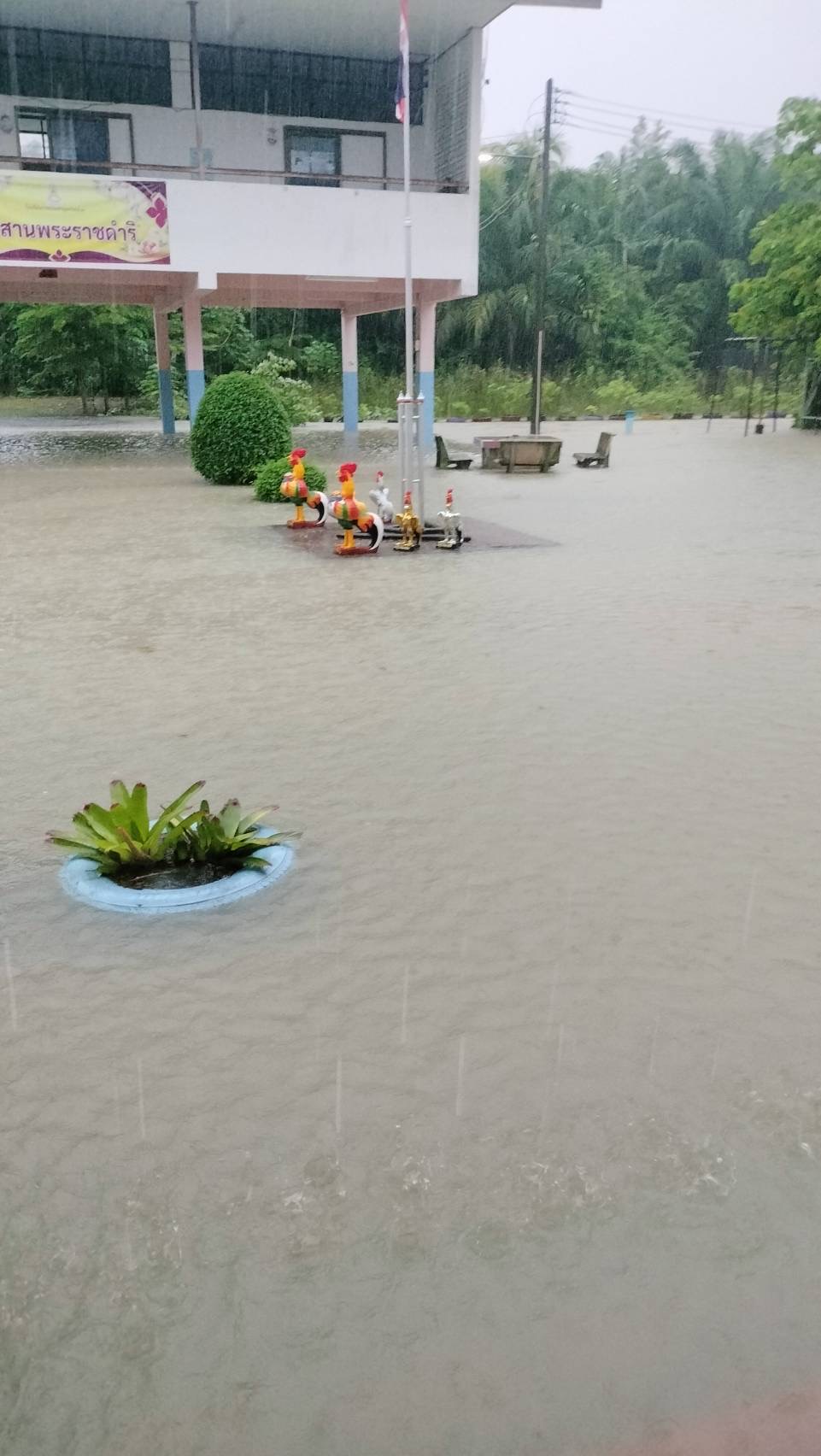 ฝนตกต่อเนื่อง มีน้ำท่วมขังบริเวณหน้าโรงเรียน อาคารเรียน น้ำเข้าห้องเรียน ห้องสมุด ห้องวิทยาศาสตร์ ห้องประชุม
