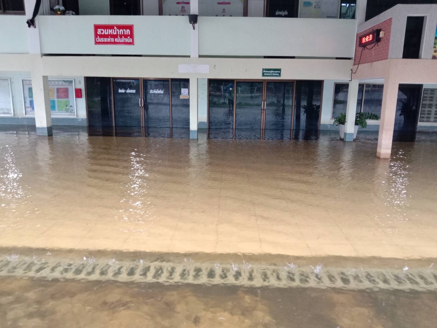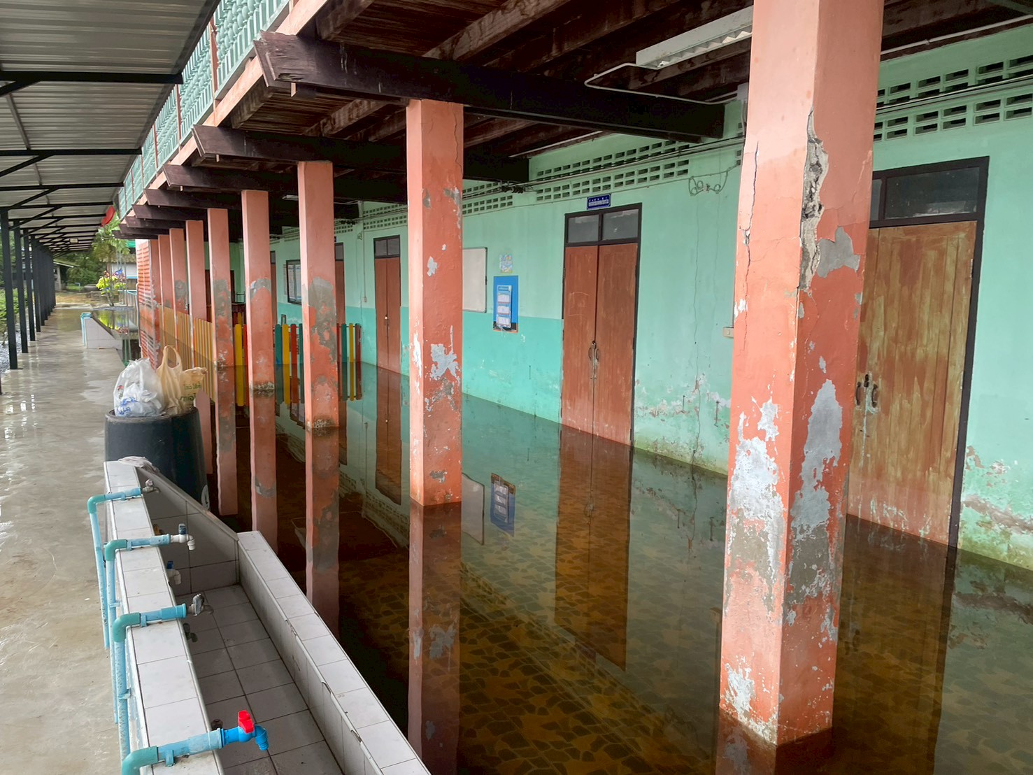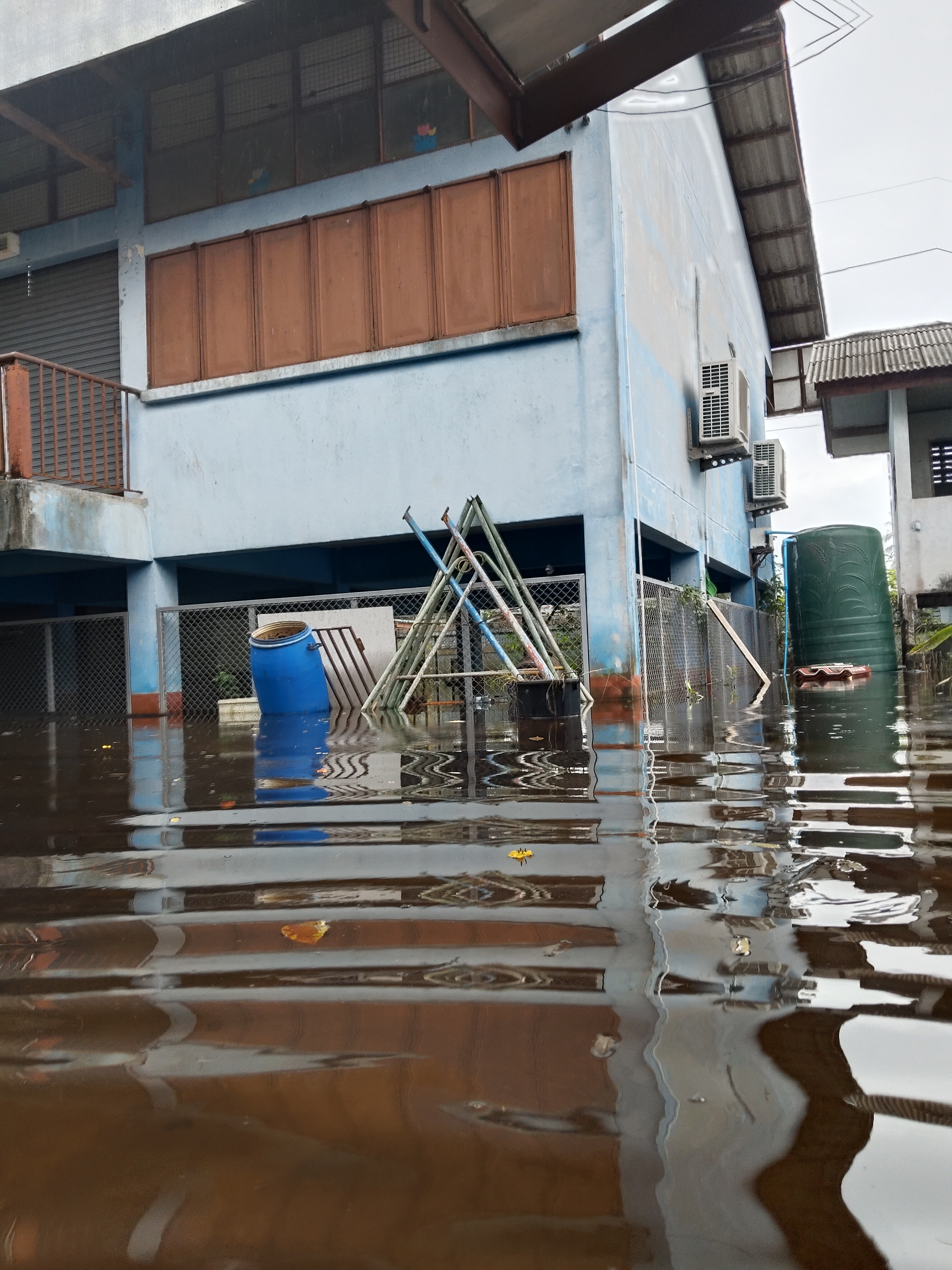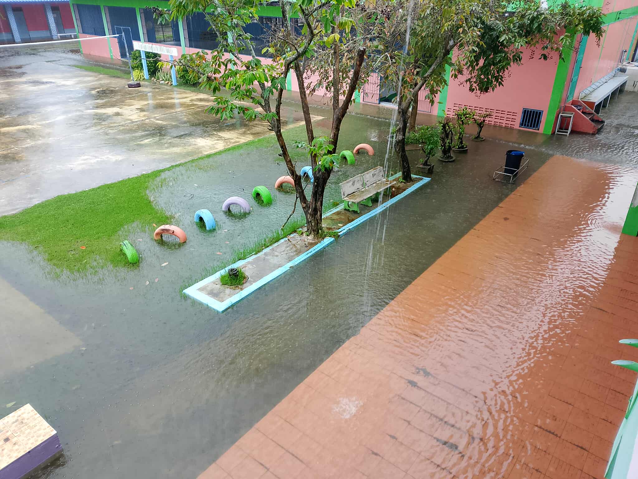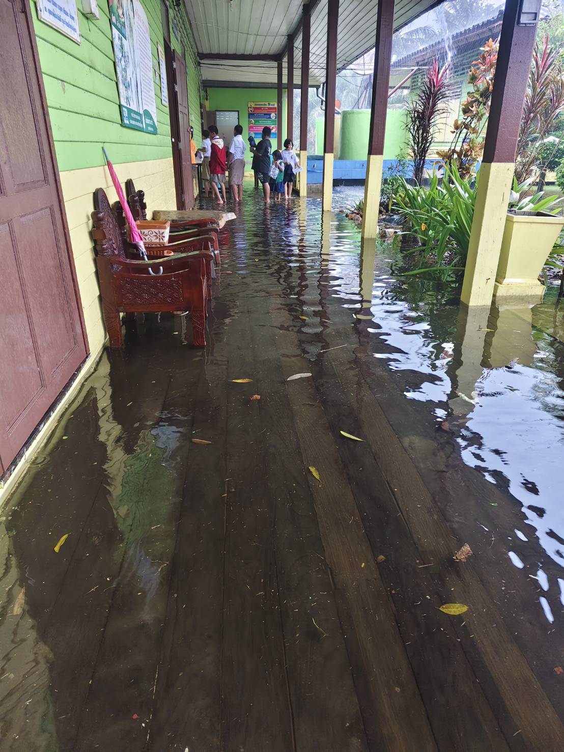 ฝนตกต่อเนื่อง มีน้ำท่วมขังบริเวณหน้าโรงเรียน อาคารเรียน น้ำเข้าห้องเรียน ห้องสมุด ห้องวิทยาศาสตร์ ห้องประชุม