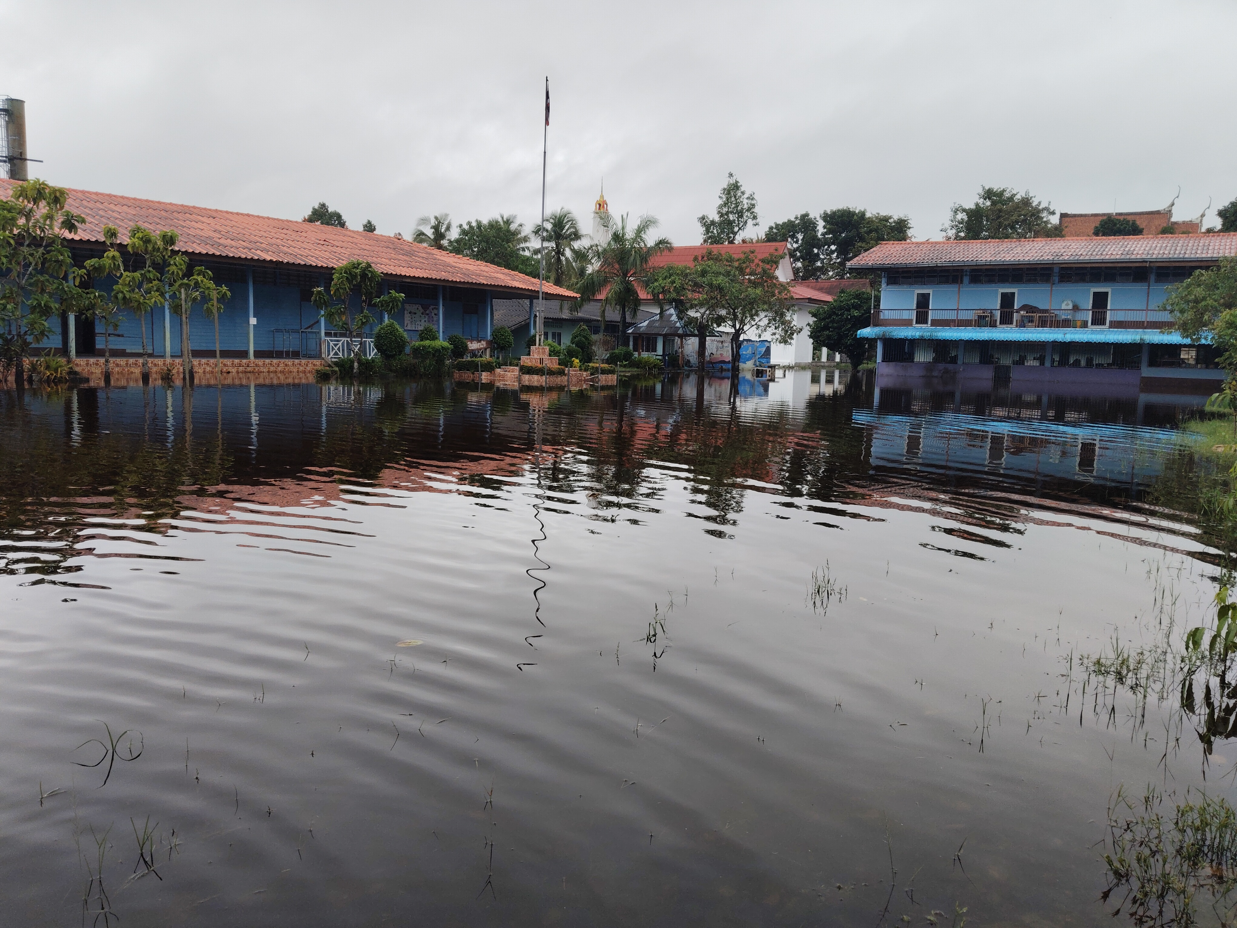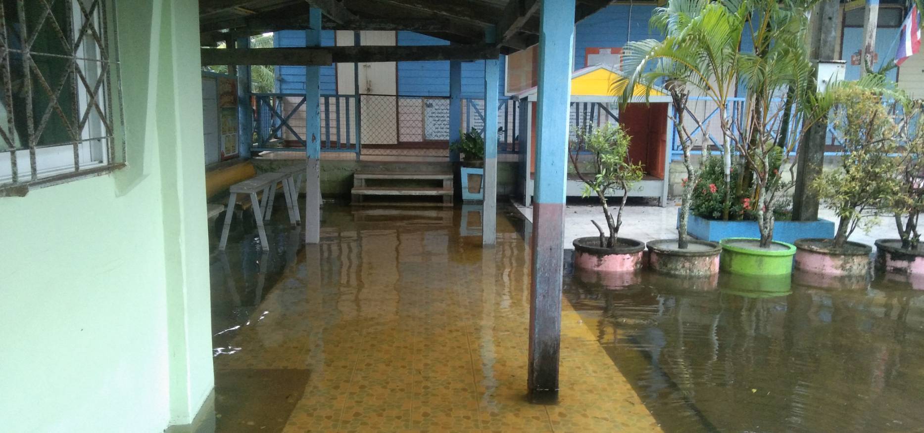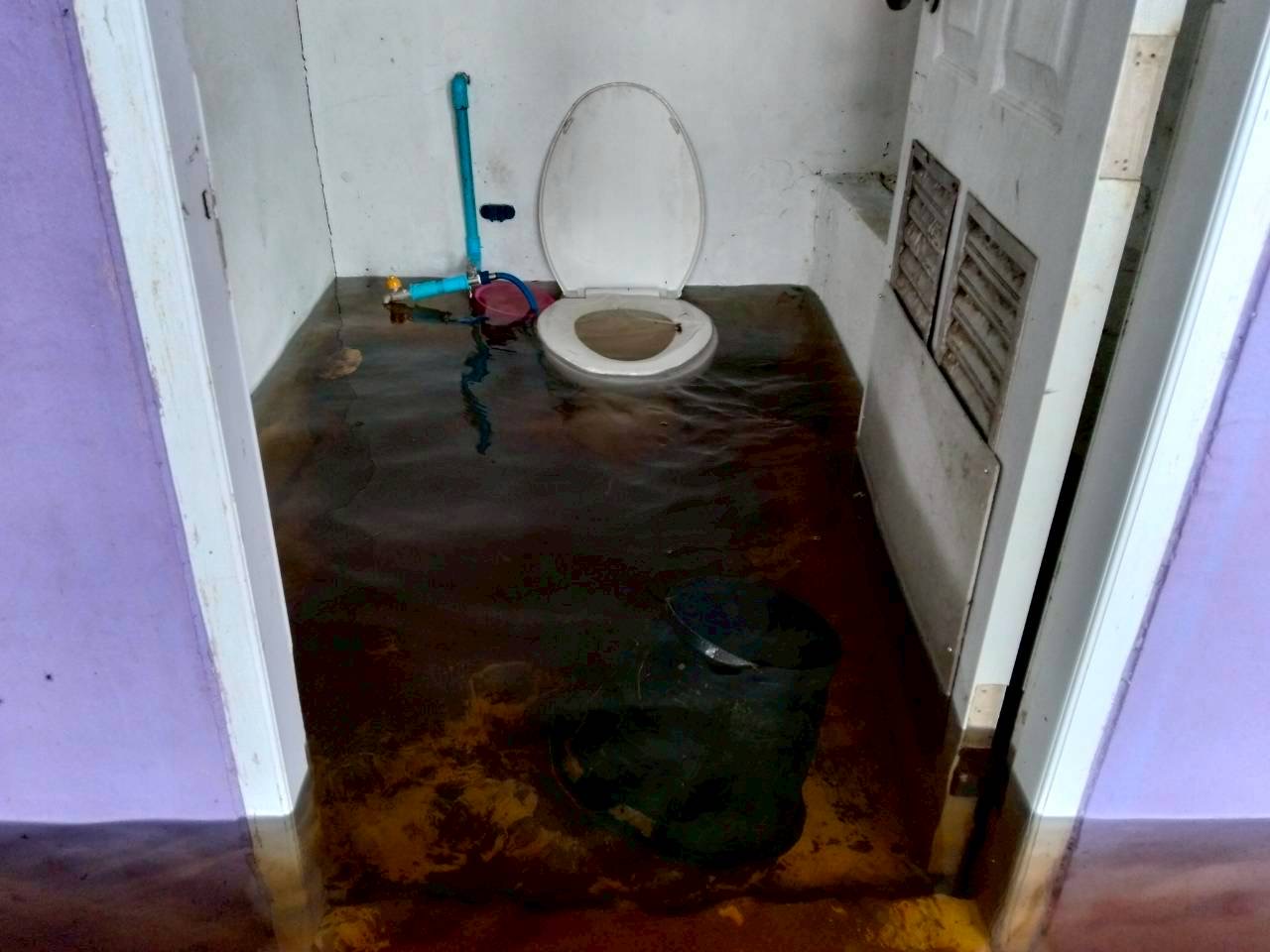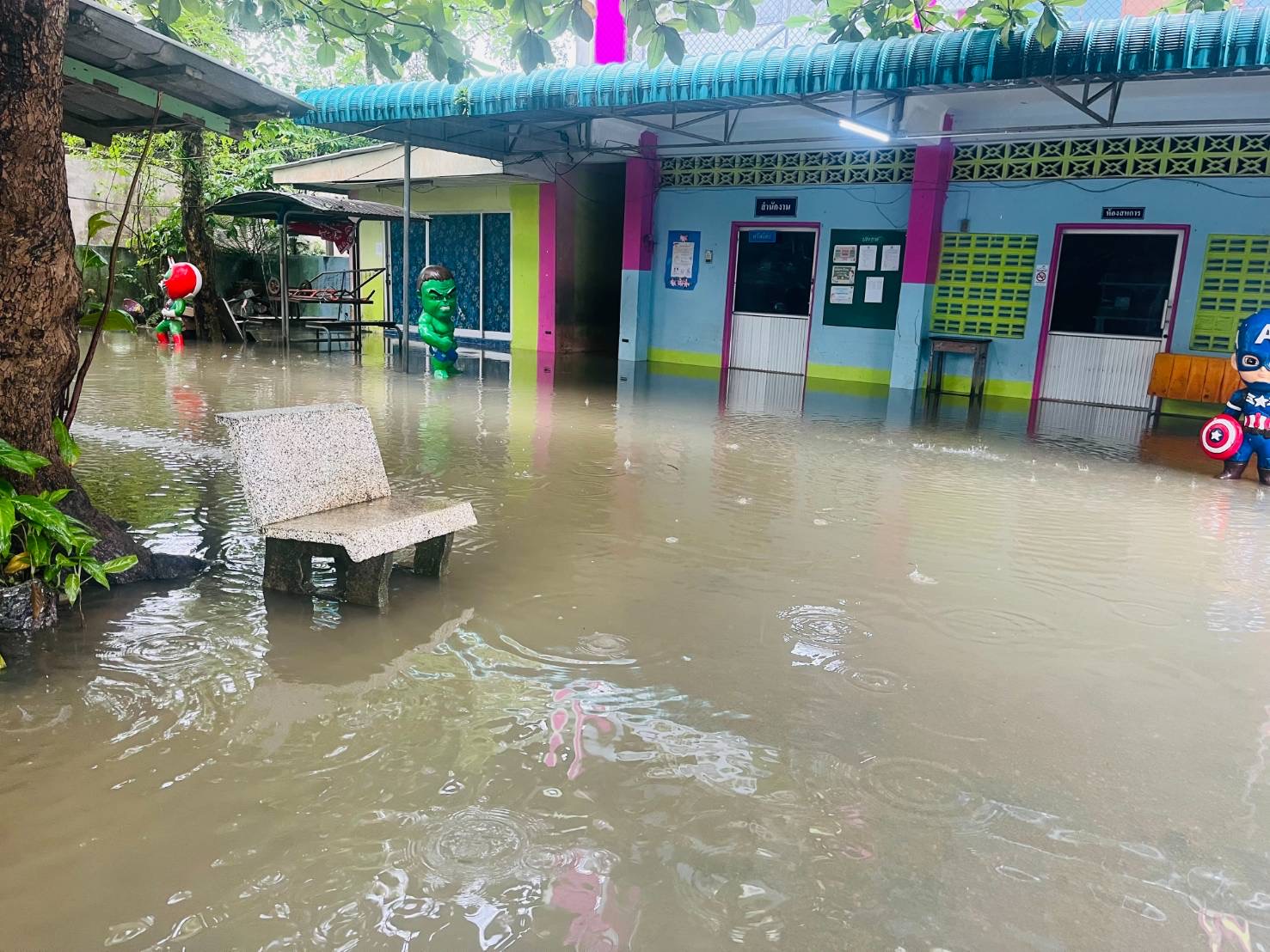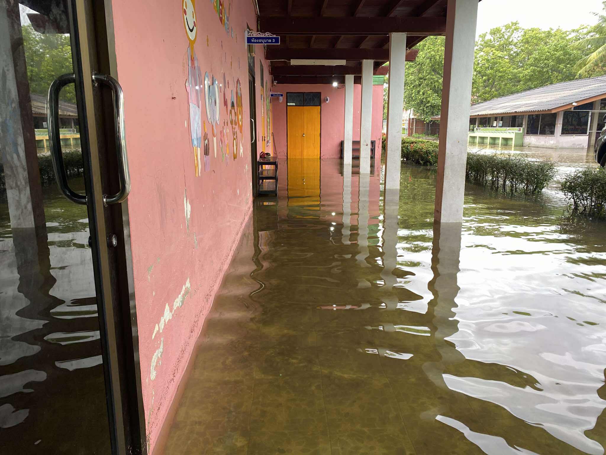 ฝนตกต่อเนื่อง มีน้ำท่วมขังบริเวณหน้าโรงเรียน อาคารเรียน น้ำเข้าห้องเรียน ห้องสมุด ห้องวิทยาศาสตร์ ห้องประชุม