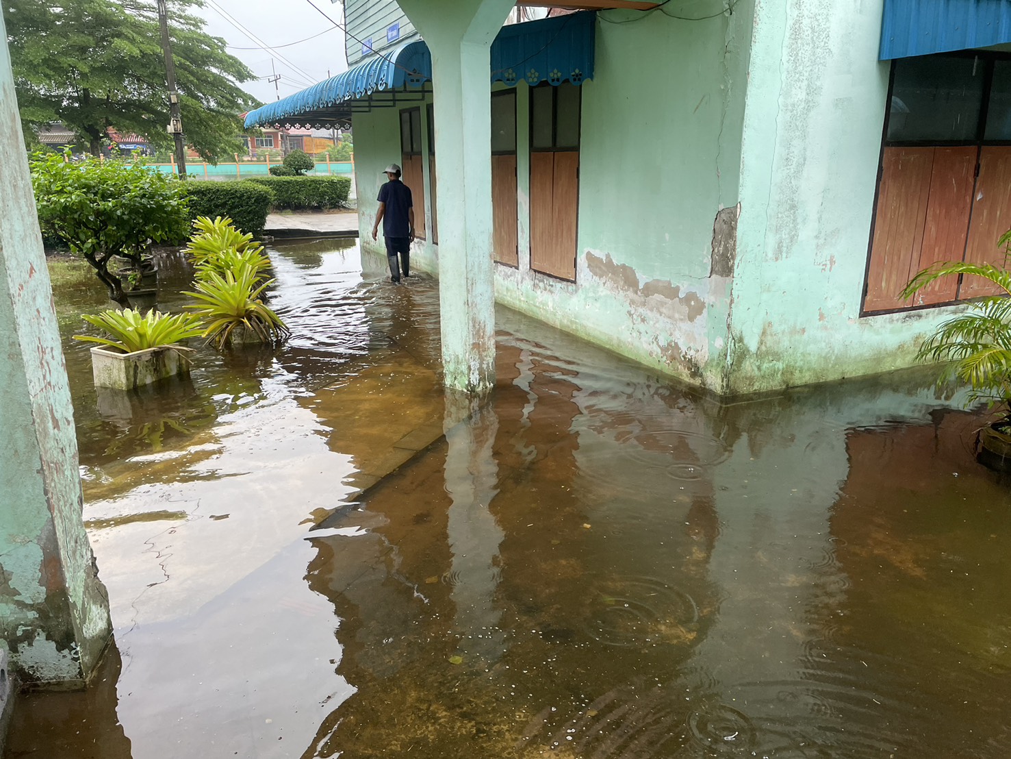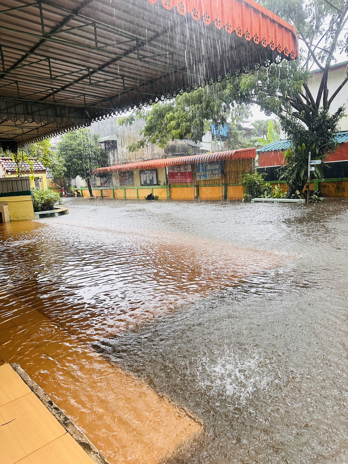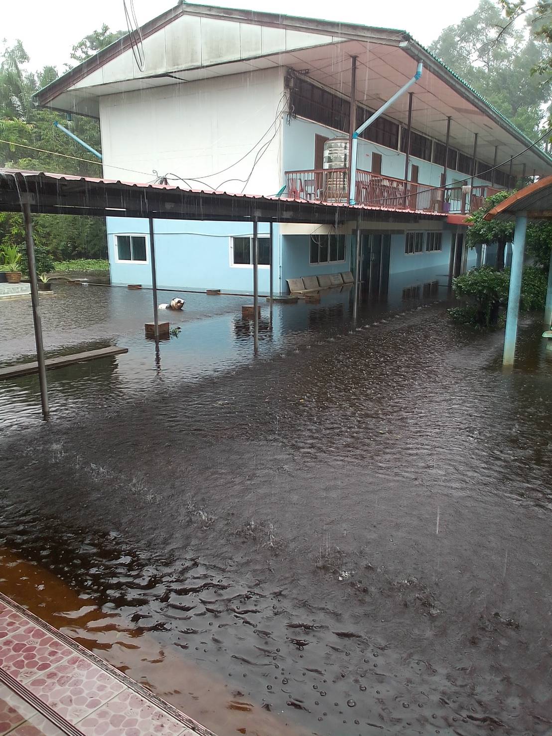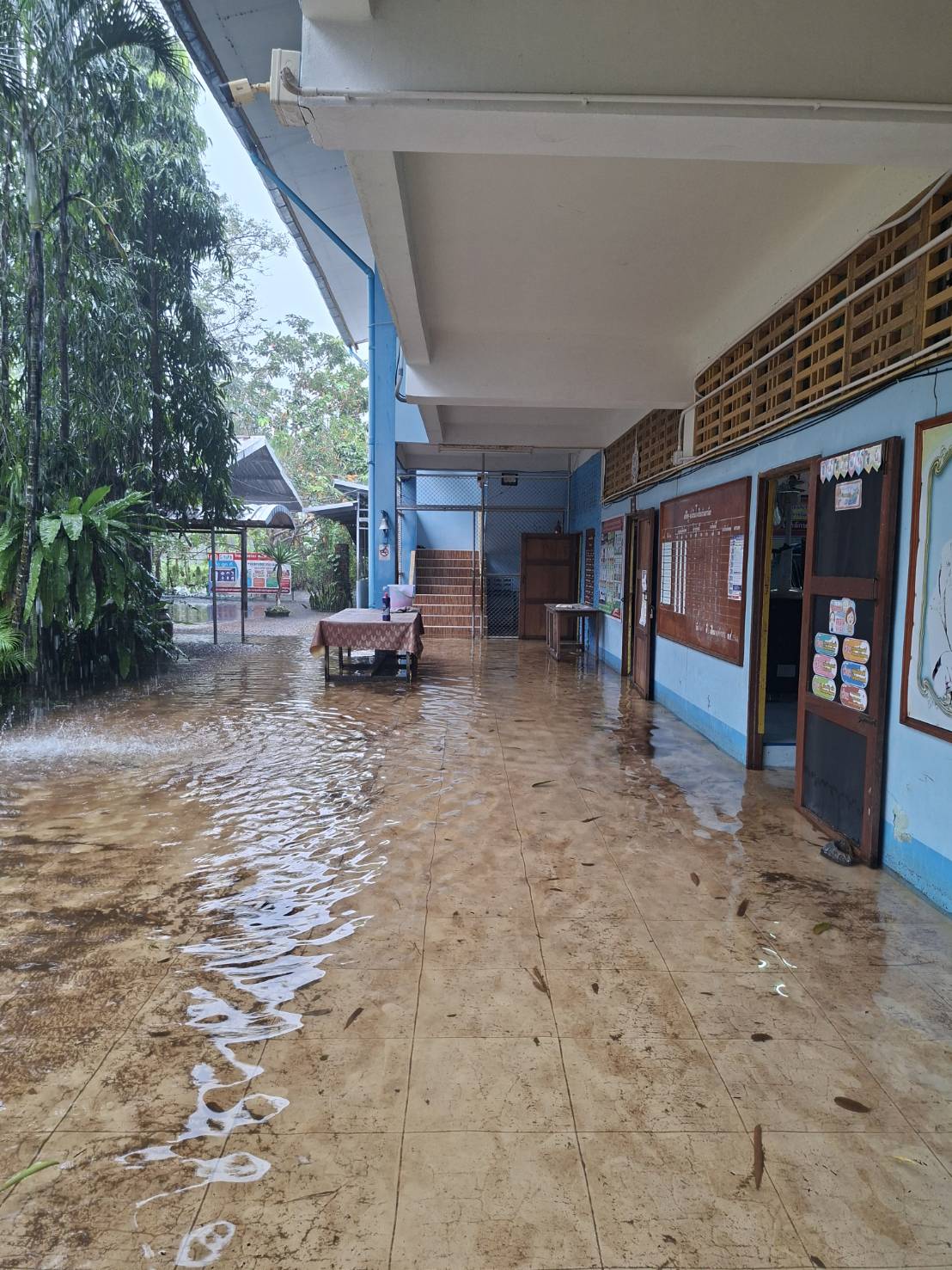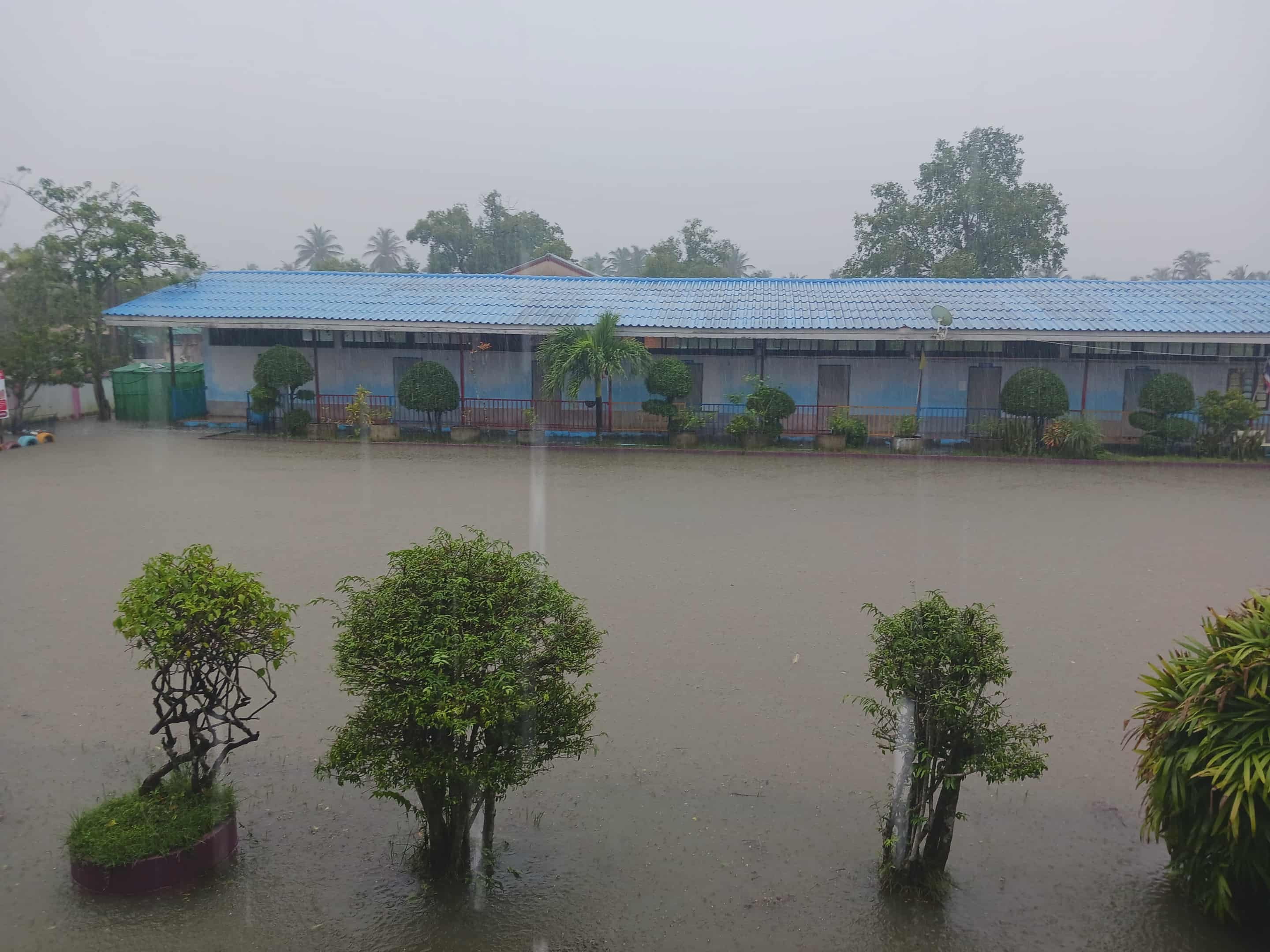 ฝนตกต่อเนื่อง มีน้ำท่วมขังบริเวณหน้าโรงเรียน อาคารเรียน น้ำเข้าห้องเรียน ห้องสมุด ห้องวิทยาศาสตร์ ห้องประชุม