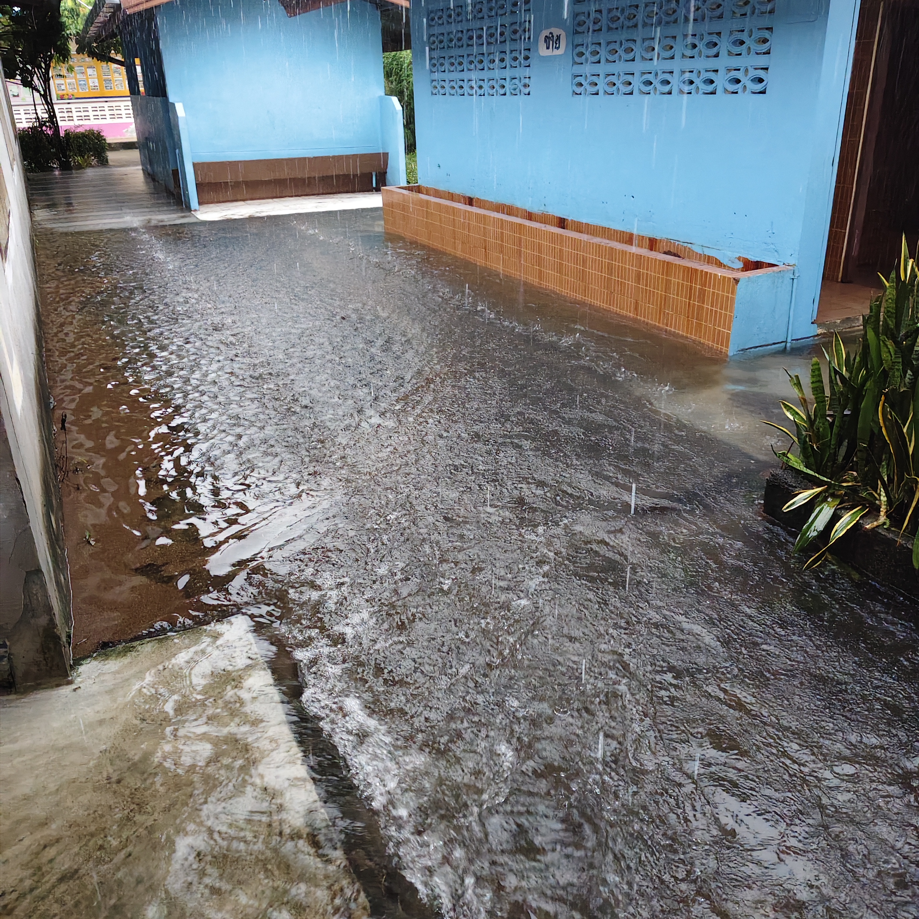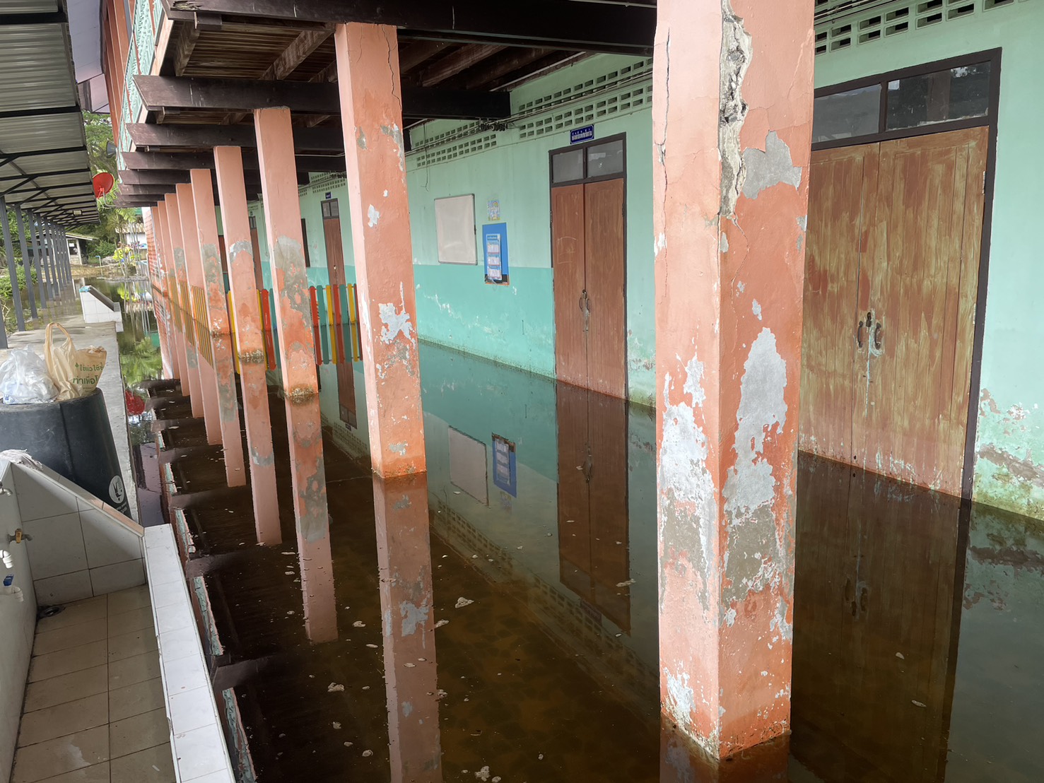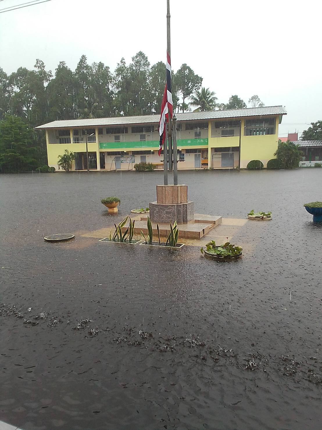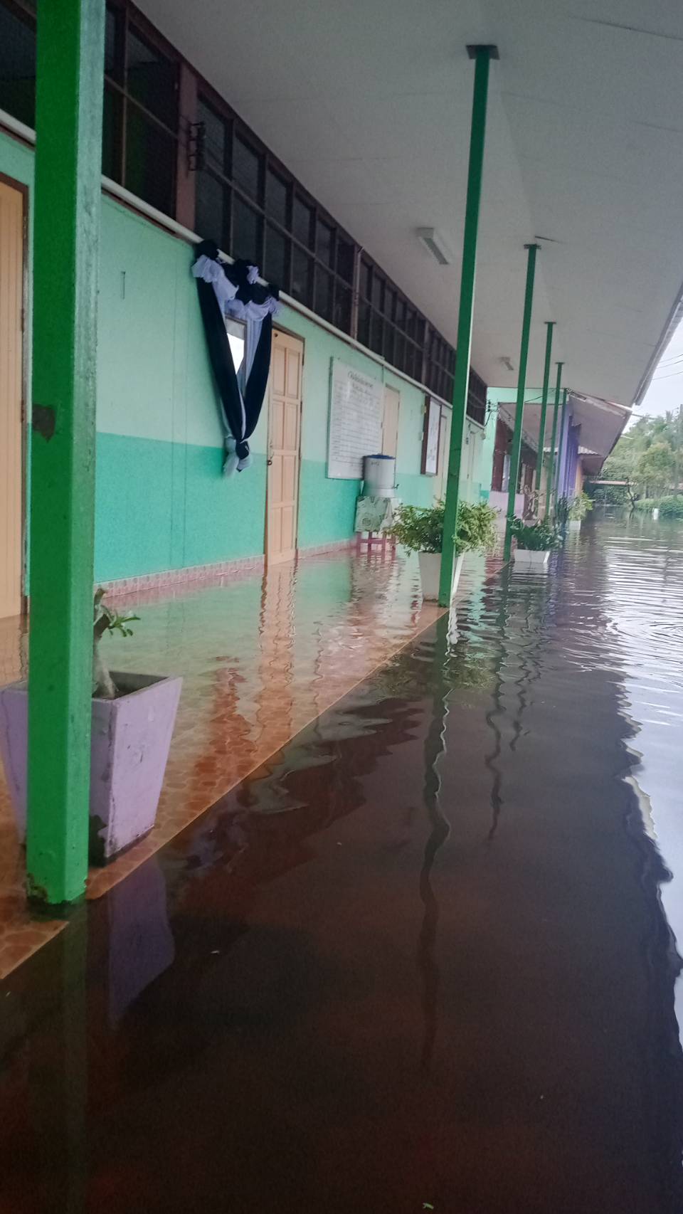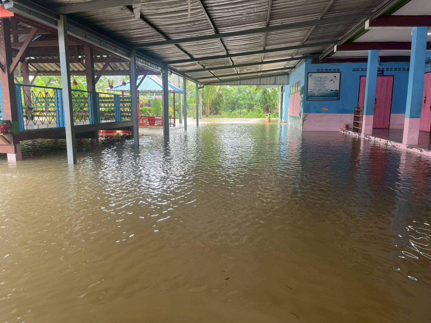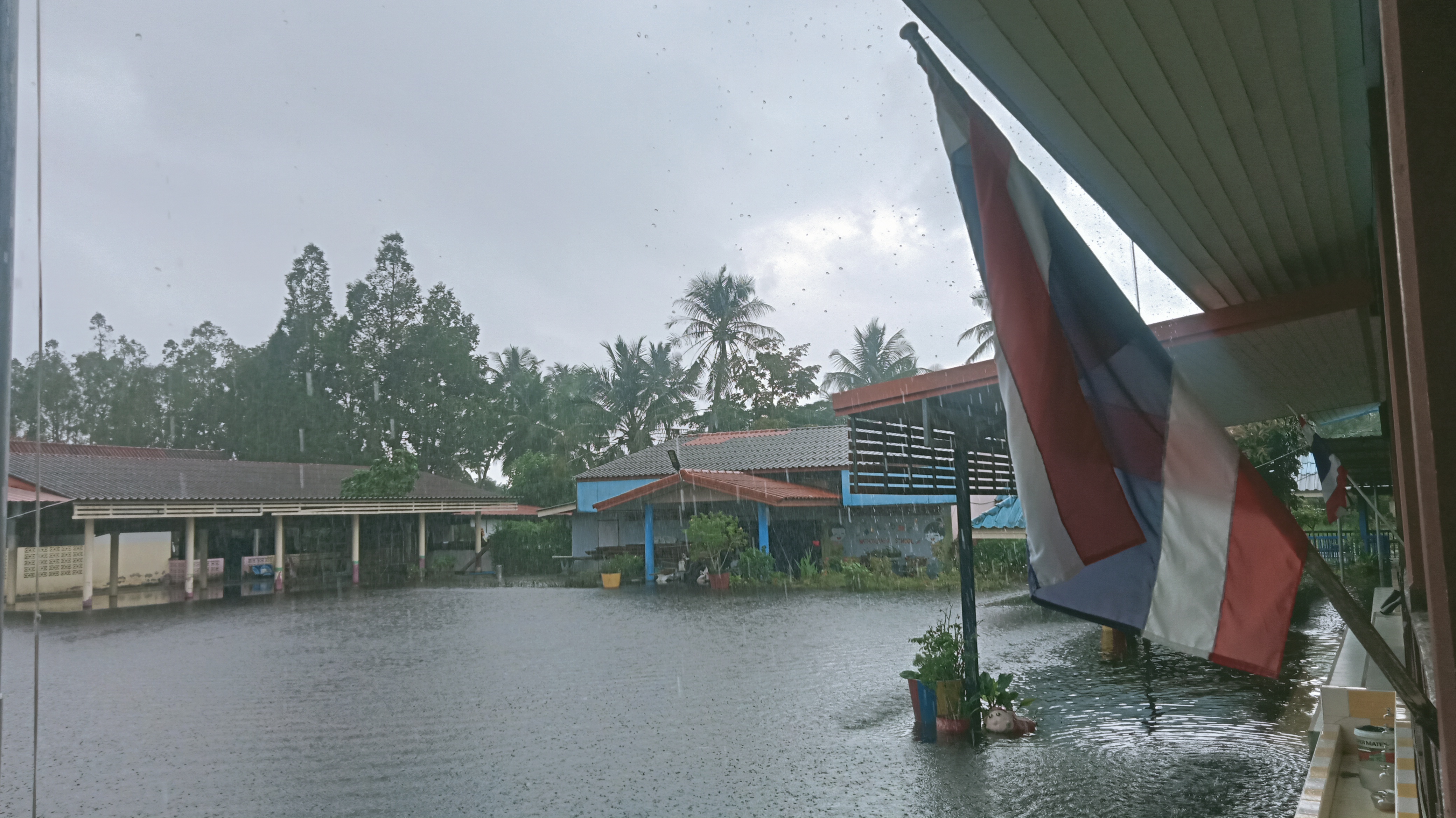 ฝนตกต่อเนื่อง มีน้ำท่วมขังบริเวณหน้าโรงเรียน อาคารเรียน น้ำเข้าห้องเรียน ห้องสมุด ห้องวิทยาศาสตร์ ห้องประชุม