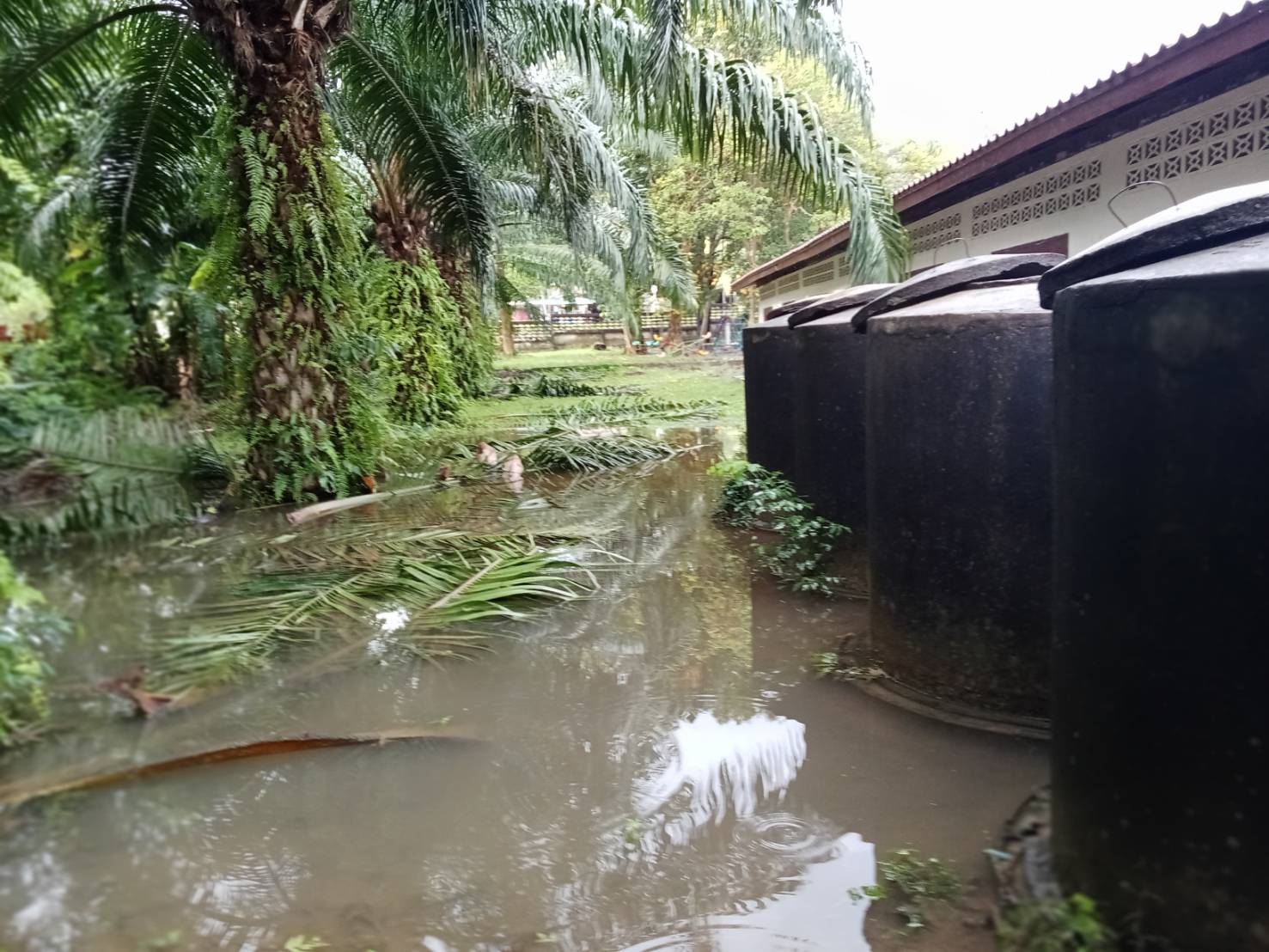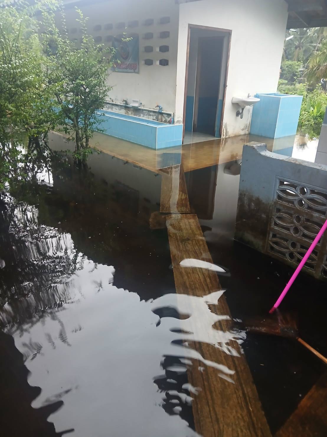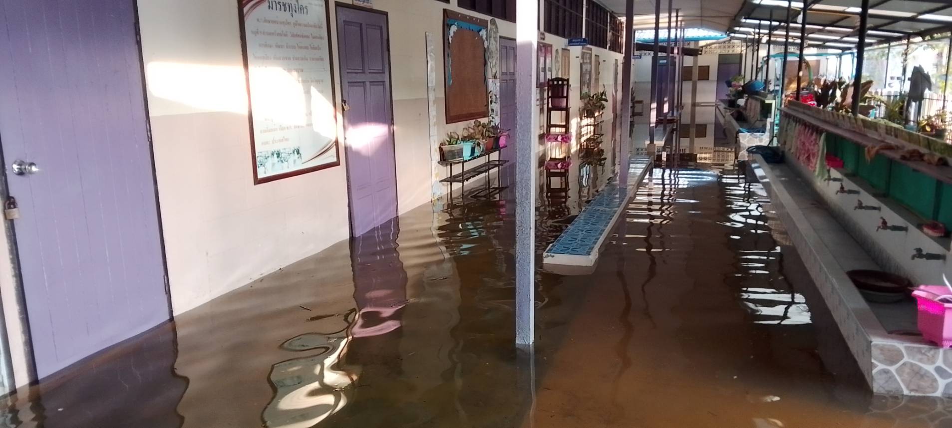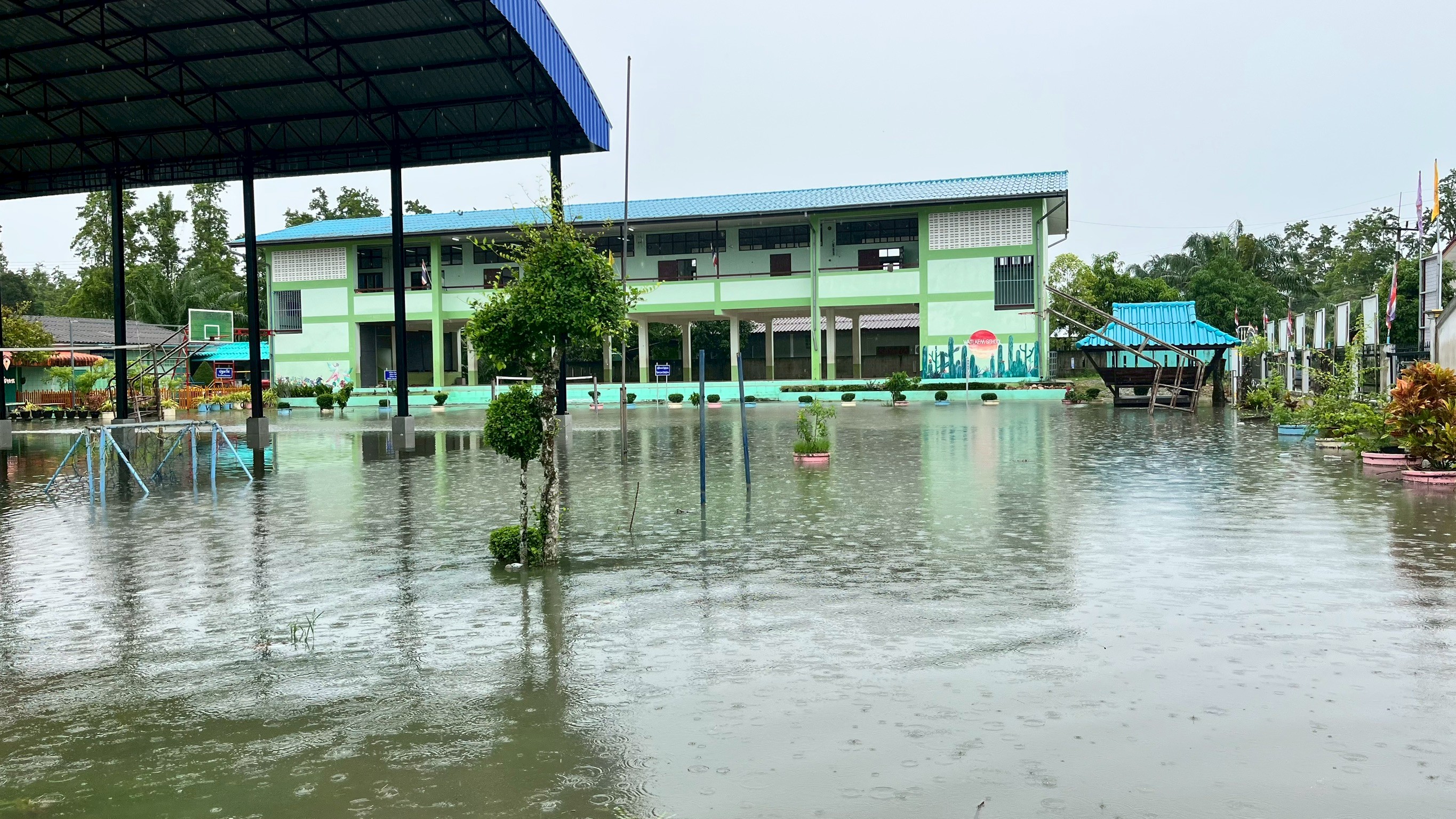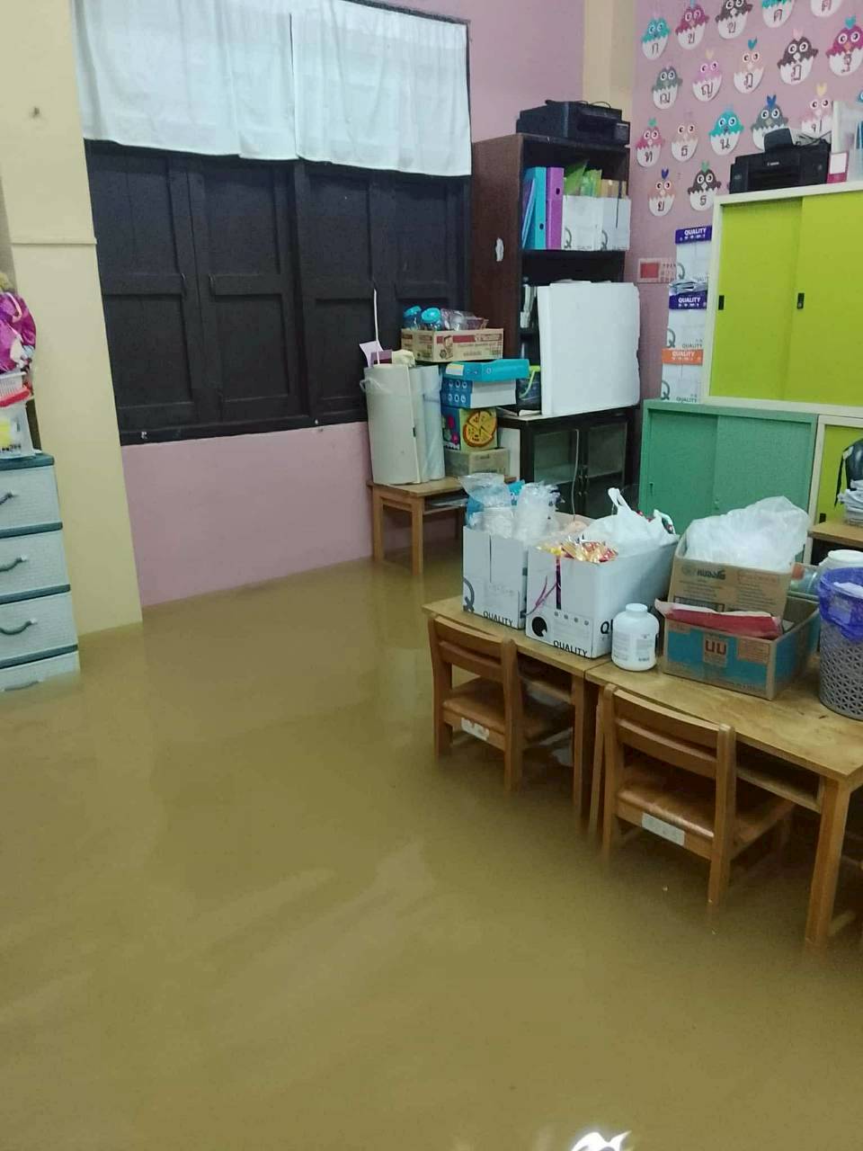 ฝนตกต่อเนื่อง มีน้ำท่วมขังบริเวณหน้าโรงเรียน อาคารเรียน น้ำเข้าห้องเรียน ห้องสมุด ห้องวิทยาศาสตร์ ห้องประชุม