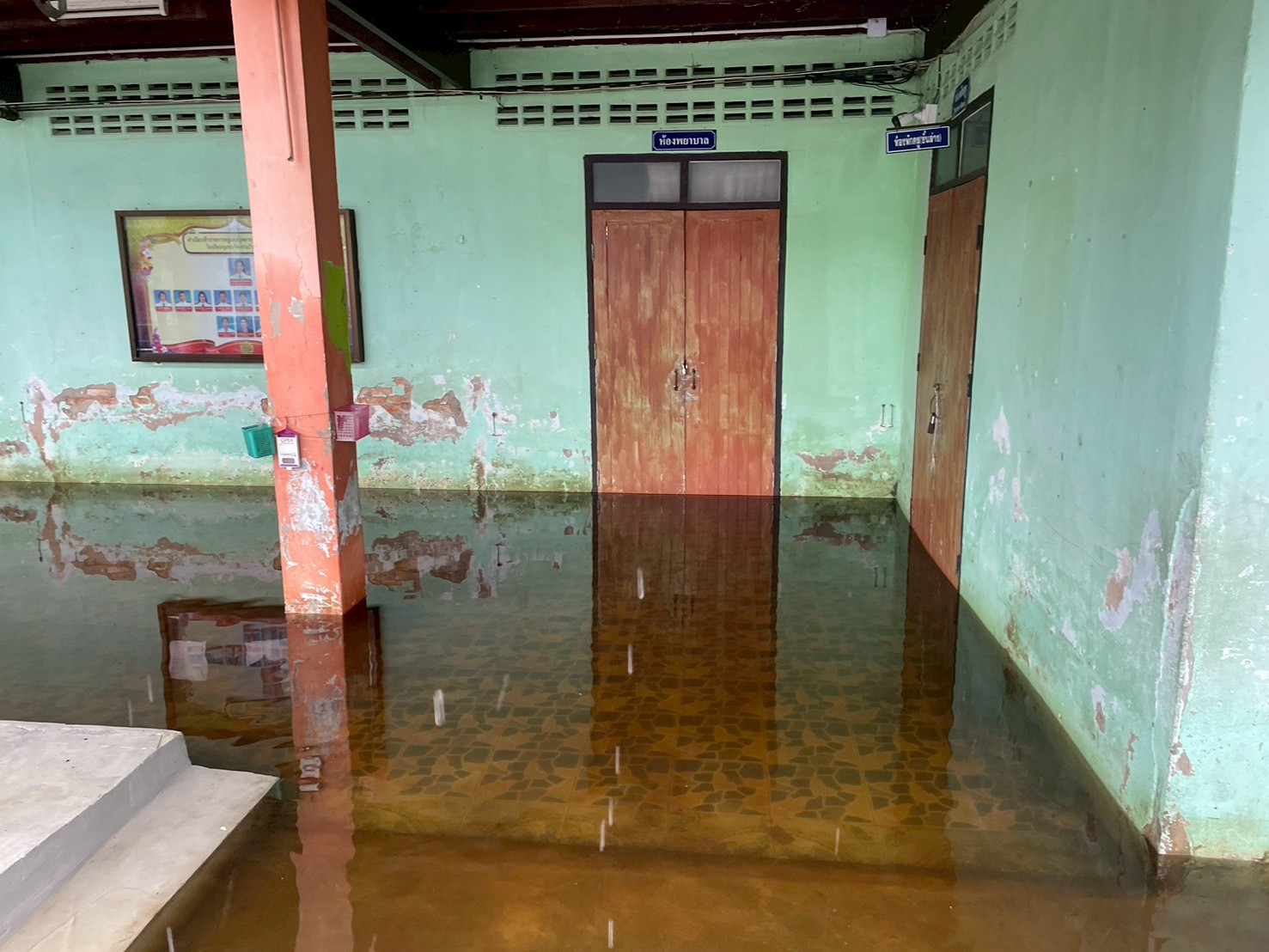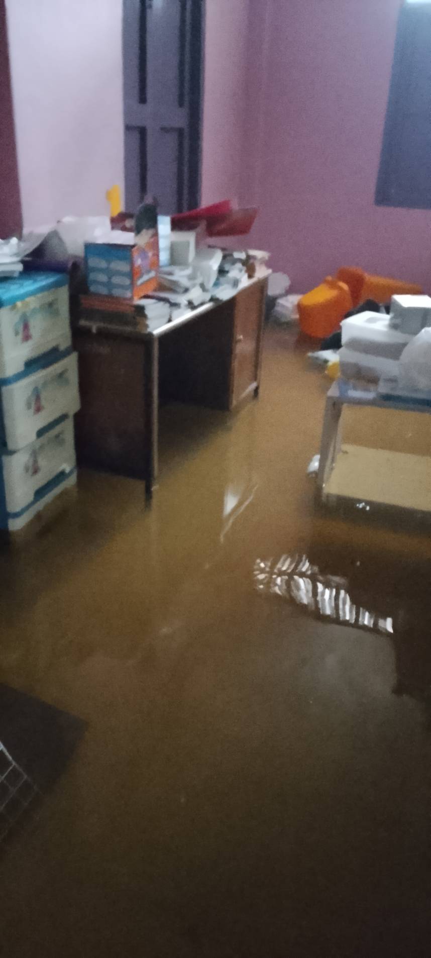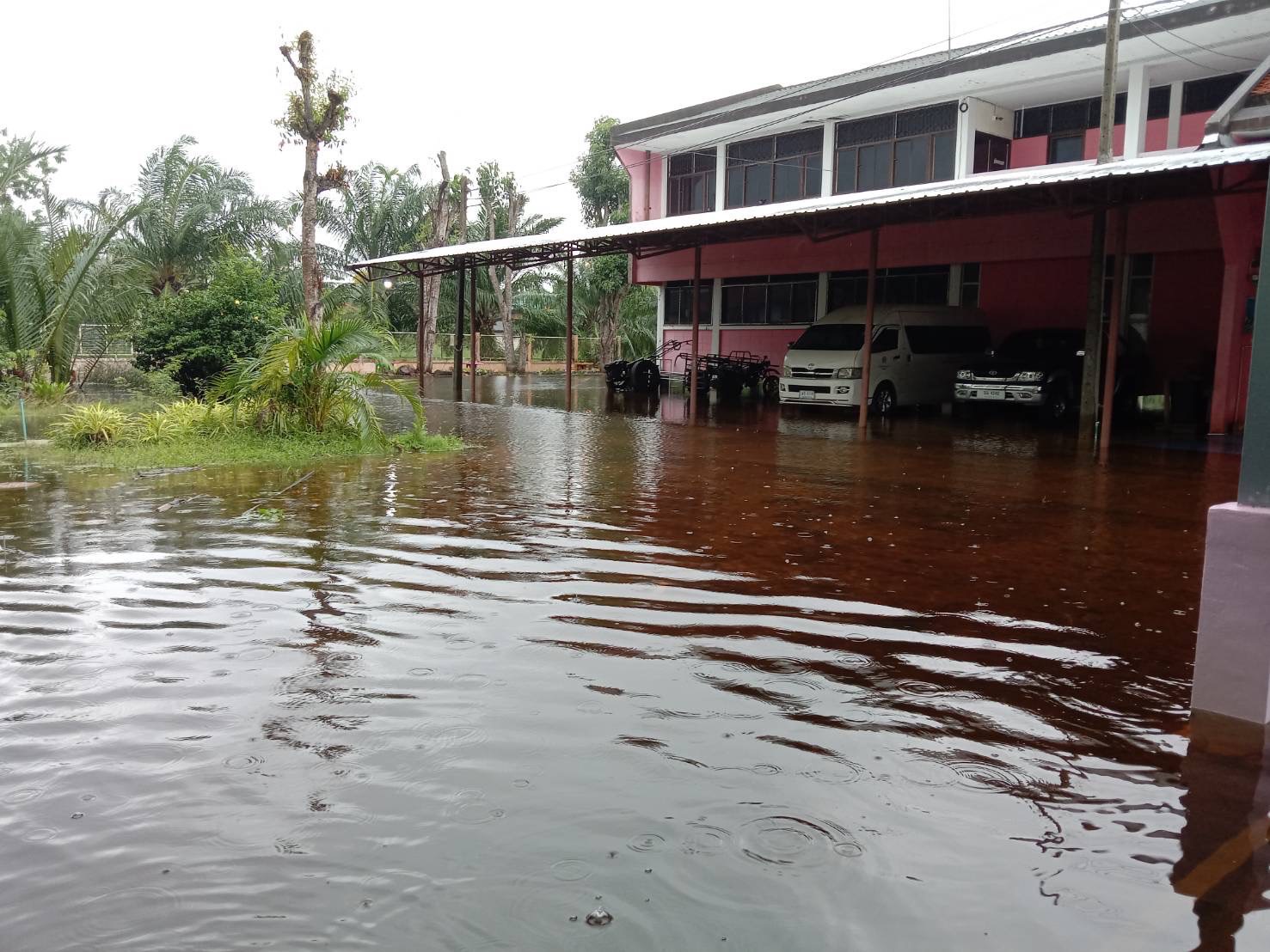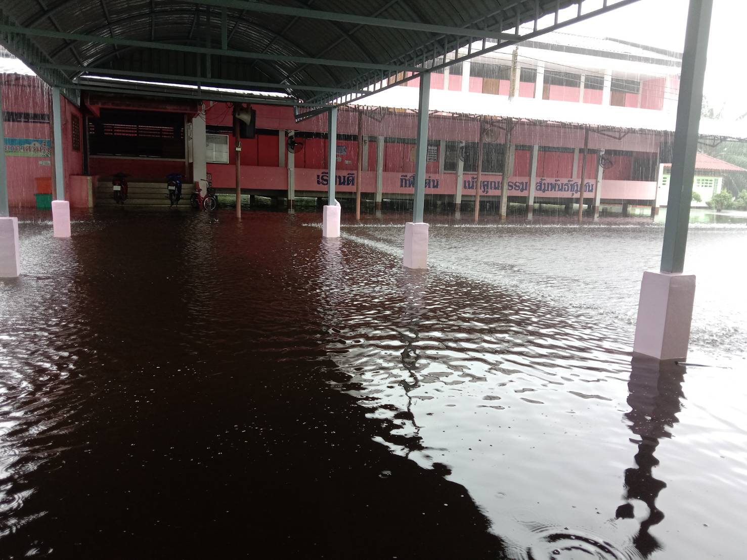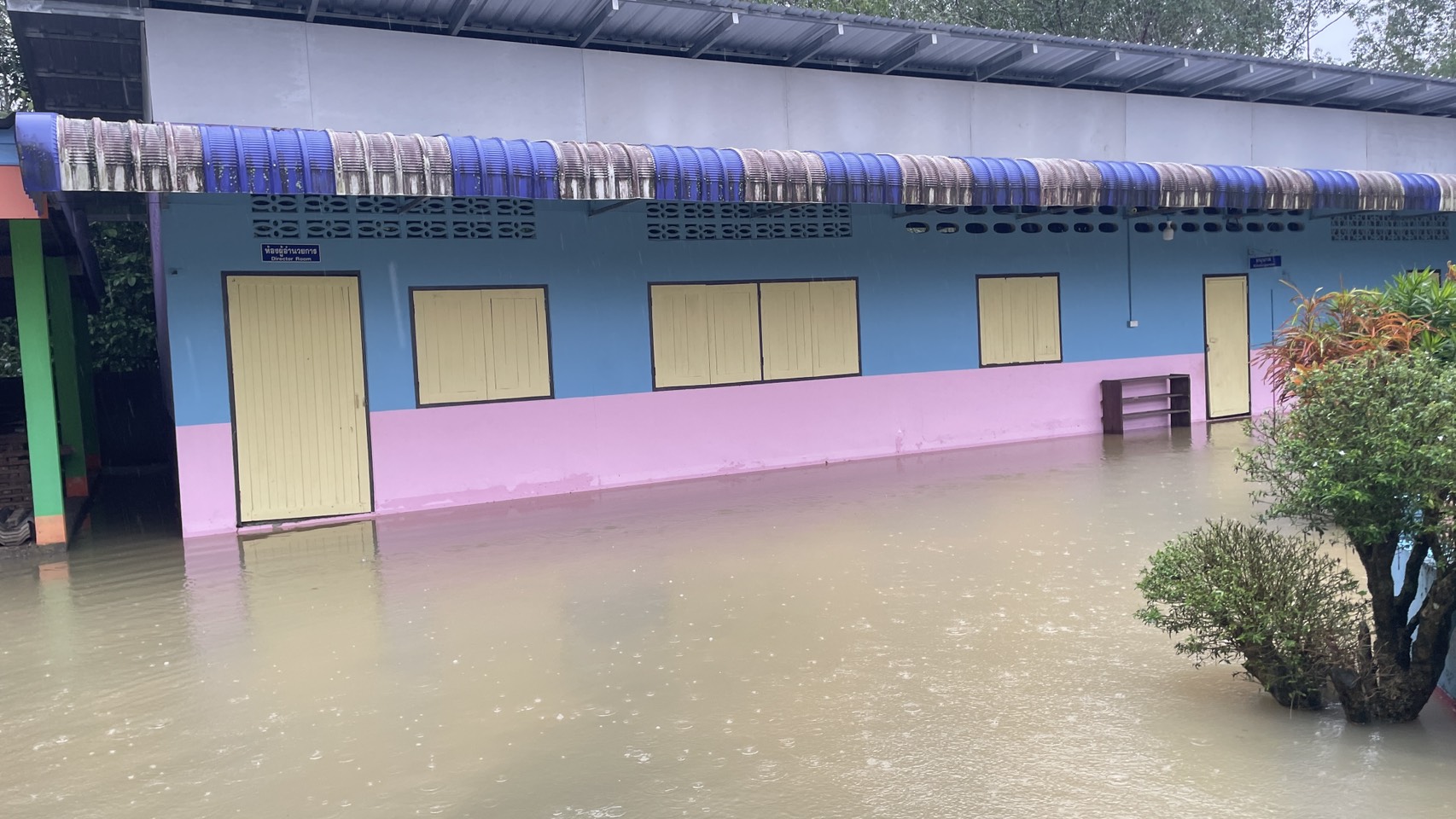 ฝนตกต่อเนื่อง มีน้ำท่วมขังบริเวณหน้าโรงเรียน อาคารเรียน น้ำเข้าห้องเรียน ห้องสมุด ห้องวิทยาศาสตร์ ห้องประชุม