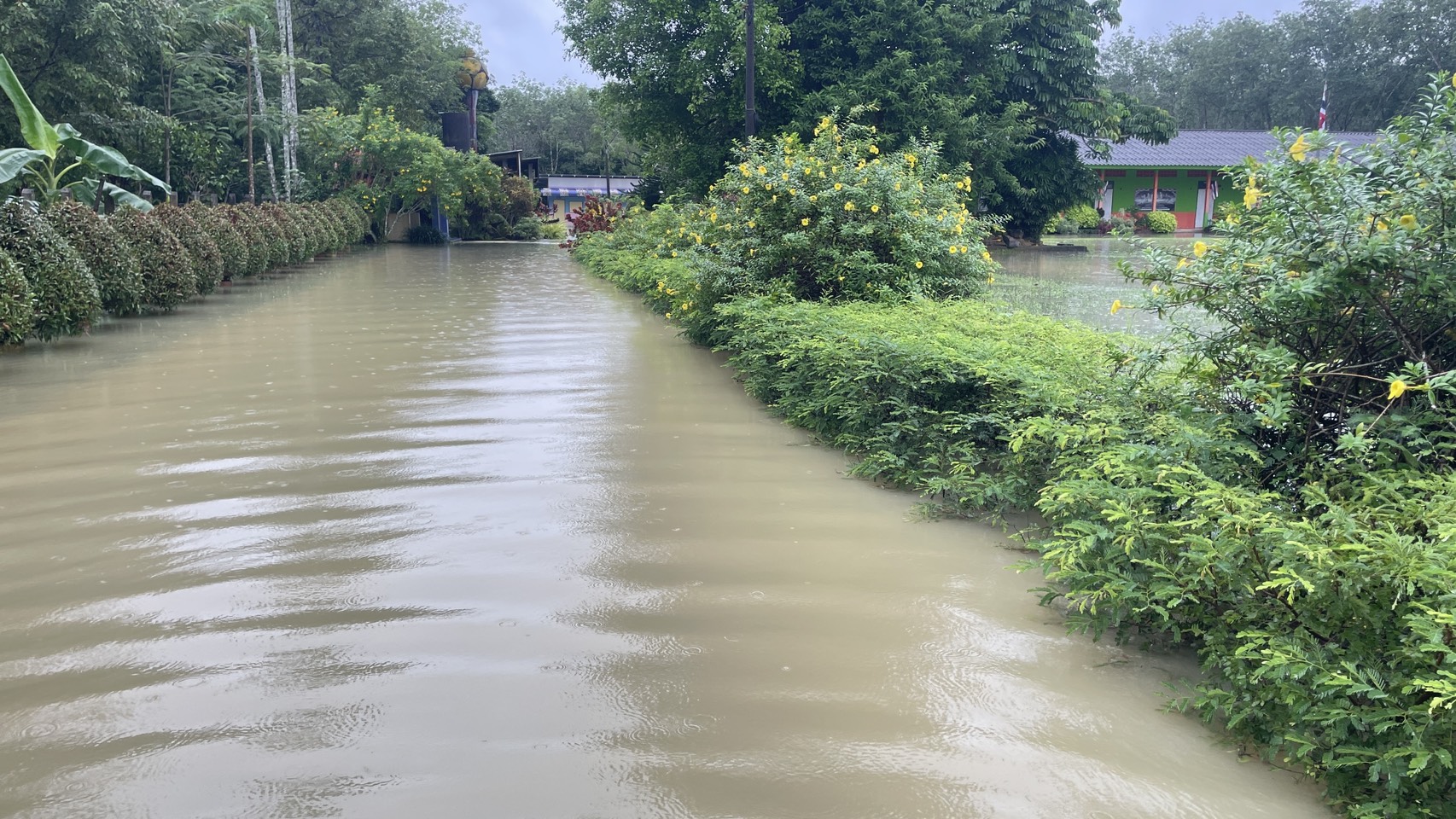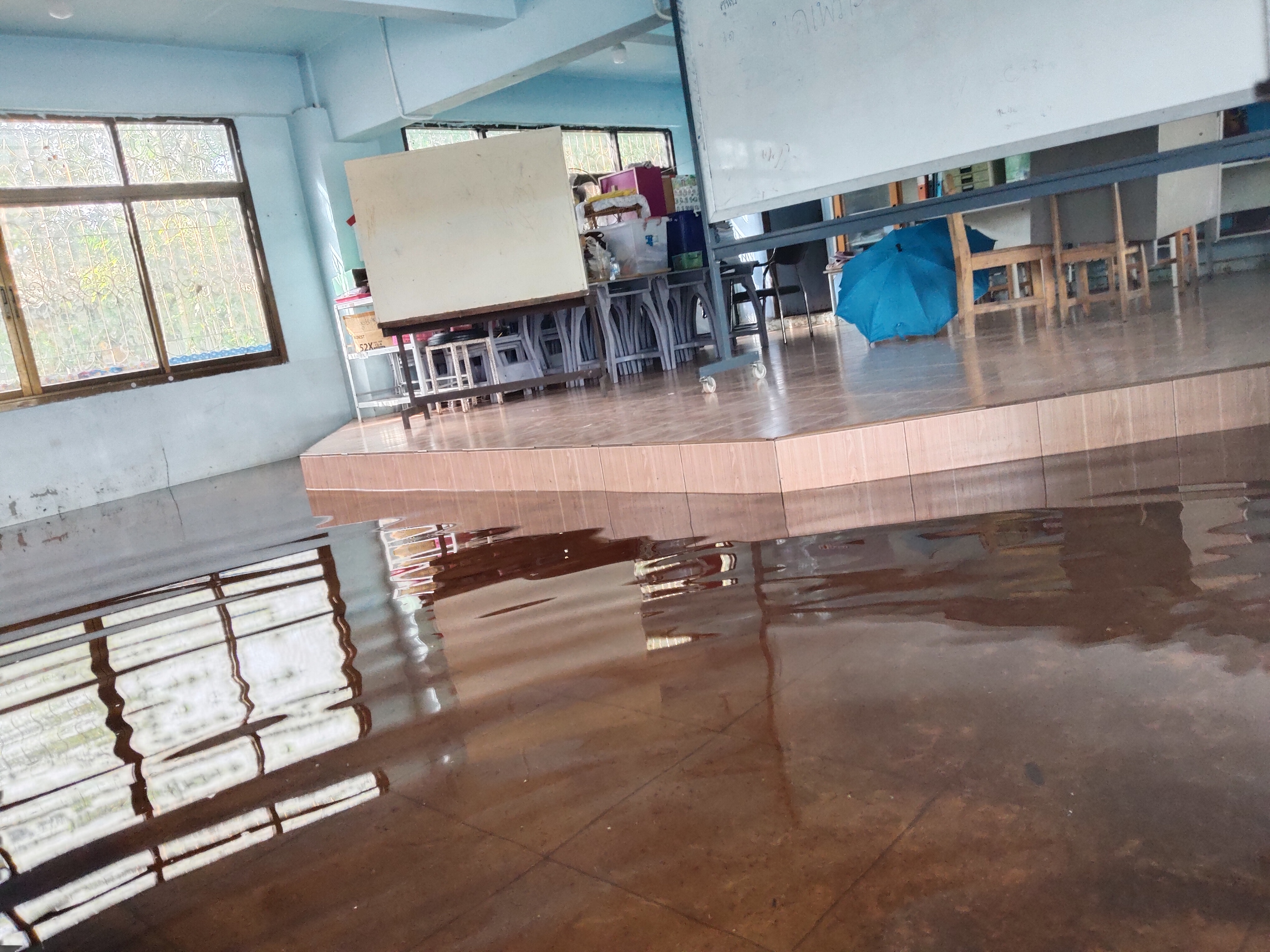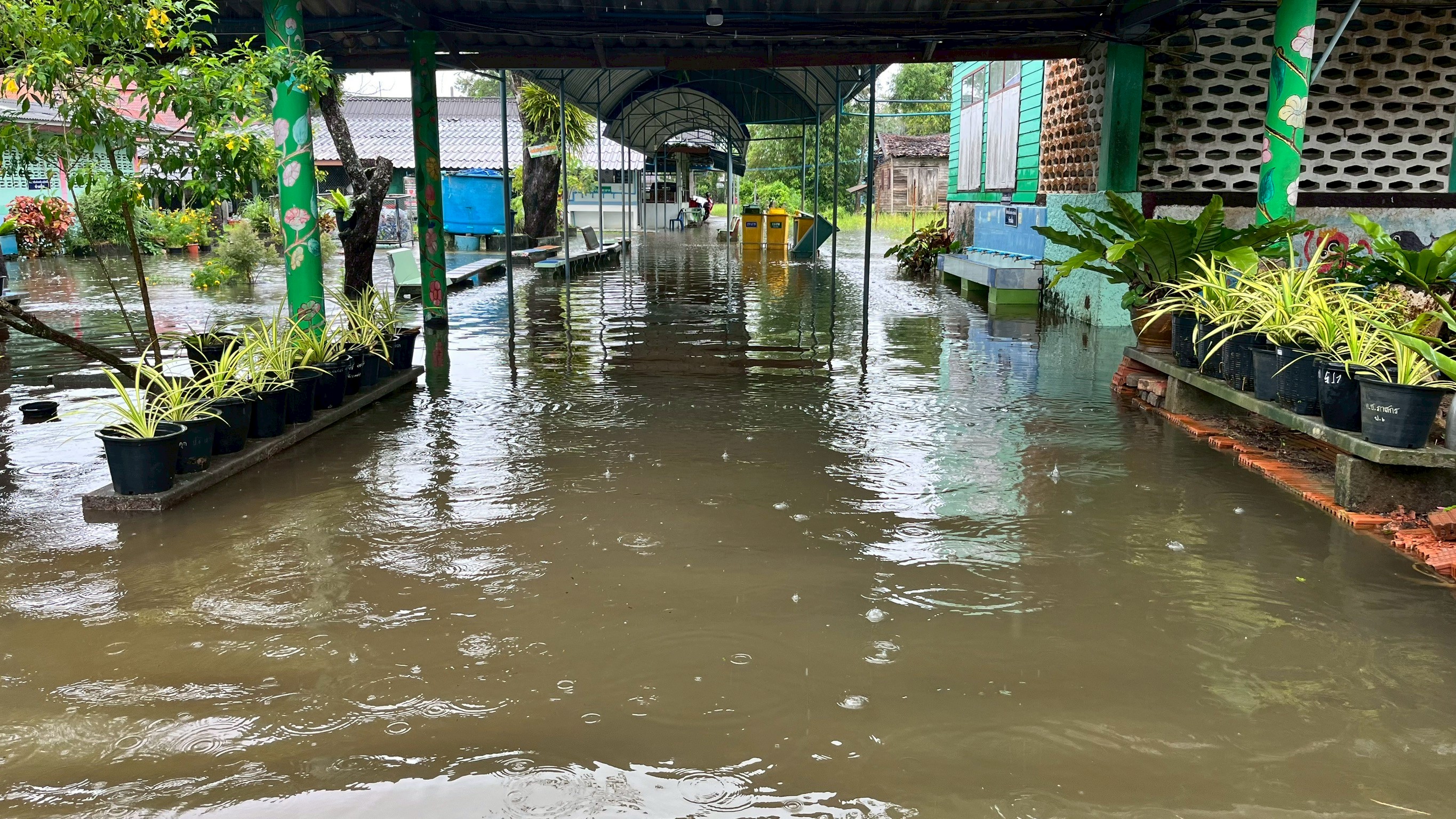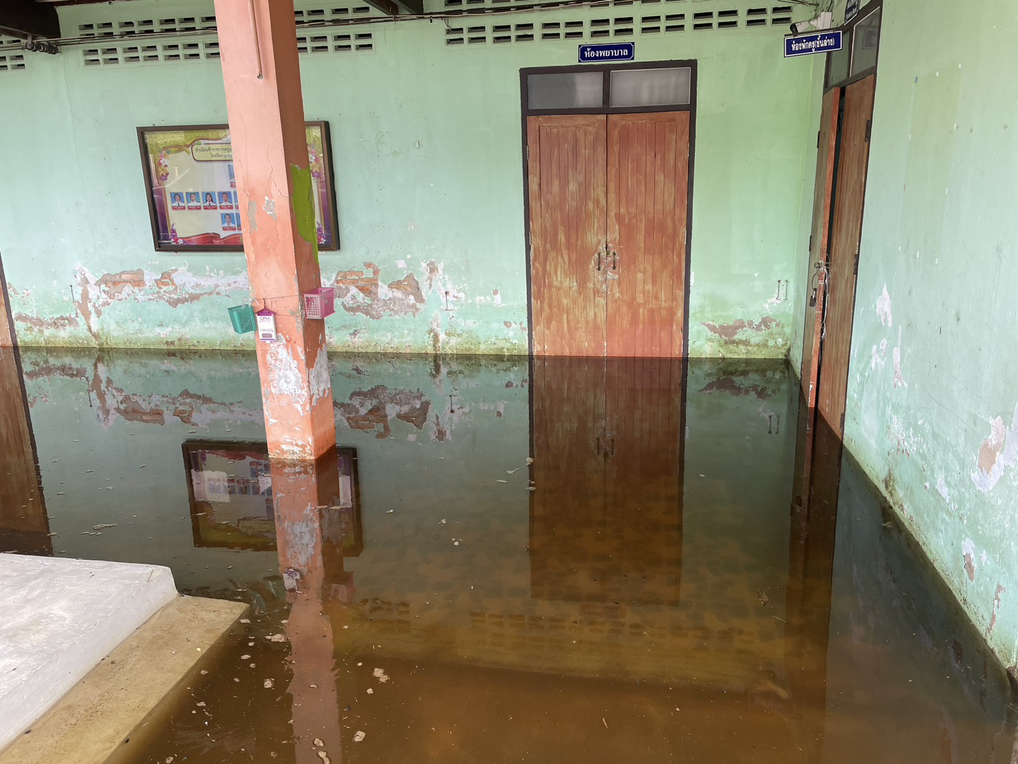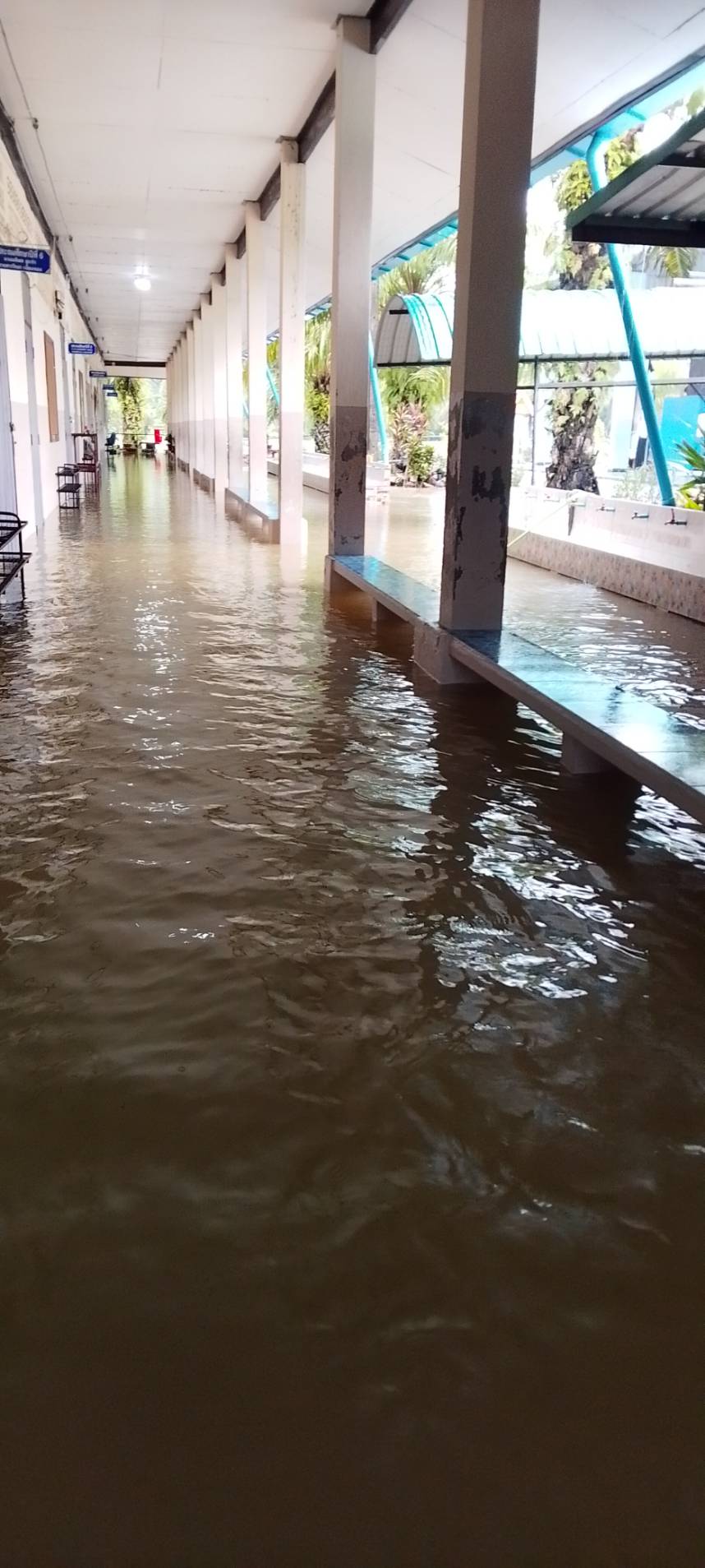 ฝนตกต่อเนื่อง มีน้ำท่วมขังบริเวณหน้าโรงเรียน อาคารเรียน น้ำเข้าห้องเรียน ห้องสมุด ห้องวิทยาศาสตร์ ห้องประชุม