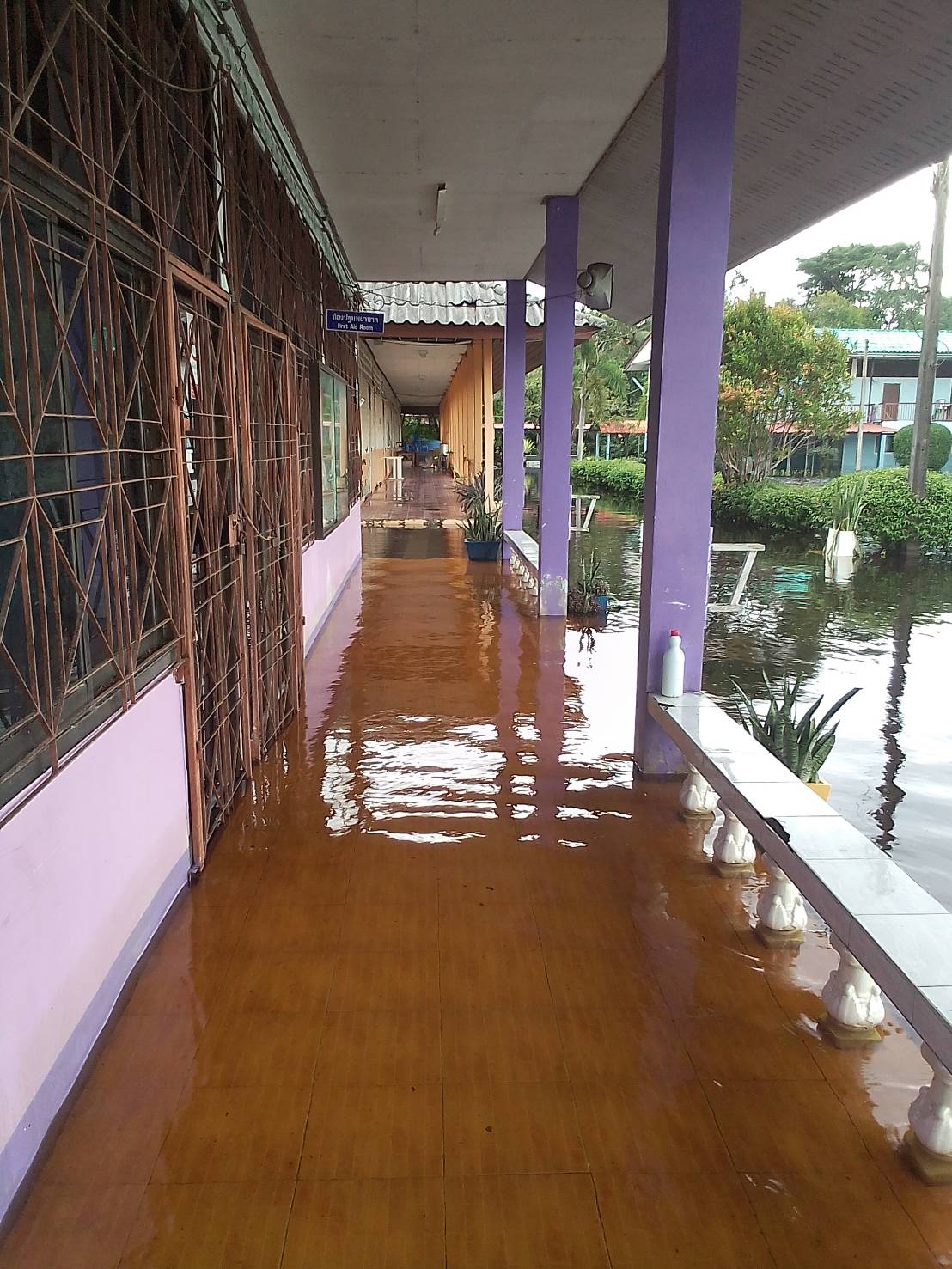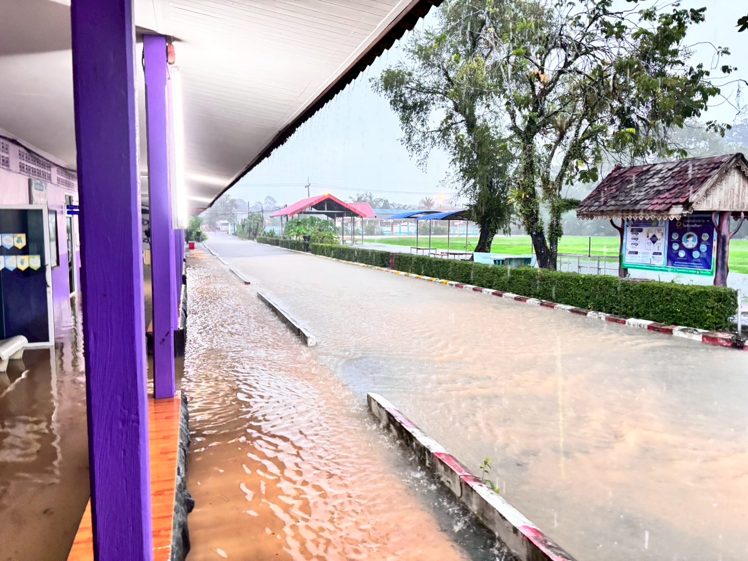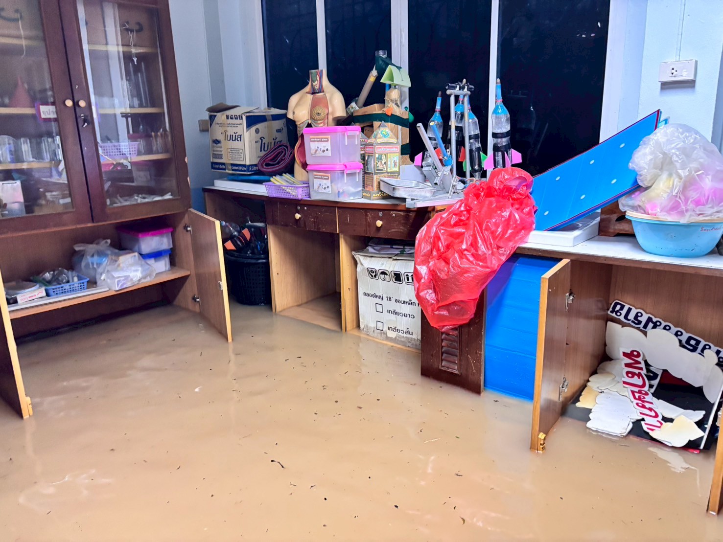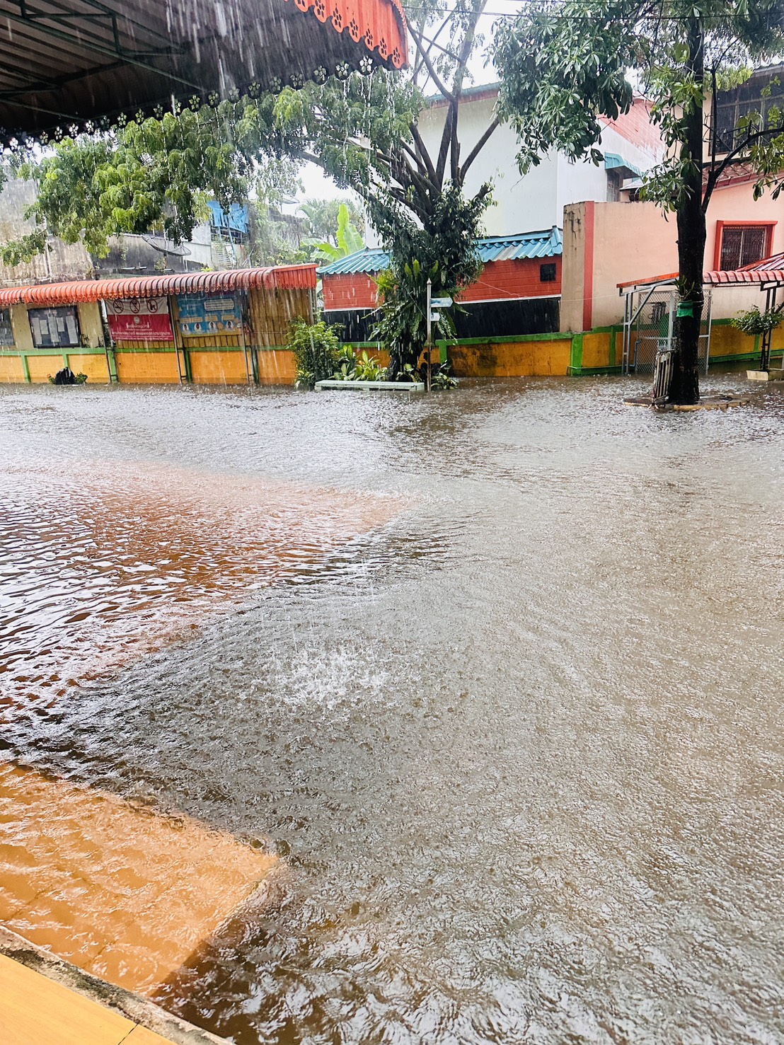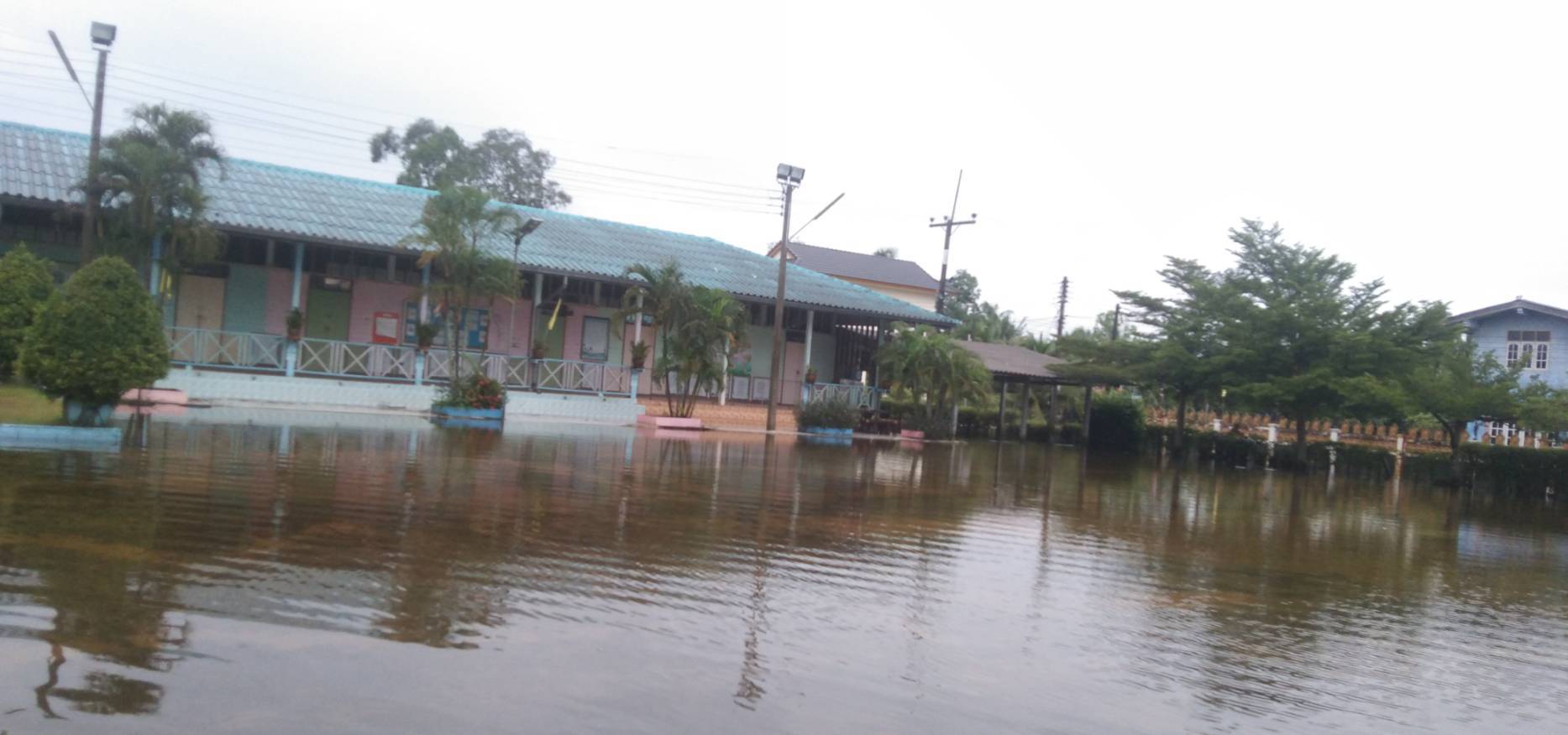 ฝนตกต่อเนื่อง มีน้ำท่วมขังบริเวณหน้าโรงเรียน อาคารเรียน น้ำเข้าห้องเรียน ห้องสมุด ห้องวิทยาศาสตร์ ห้องประชุม