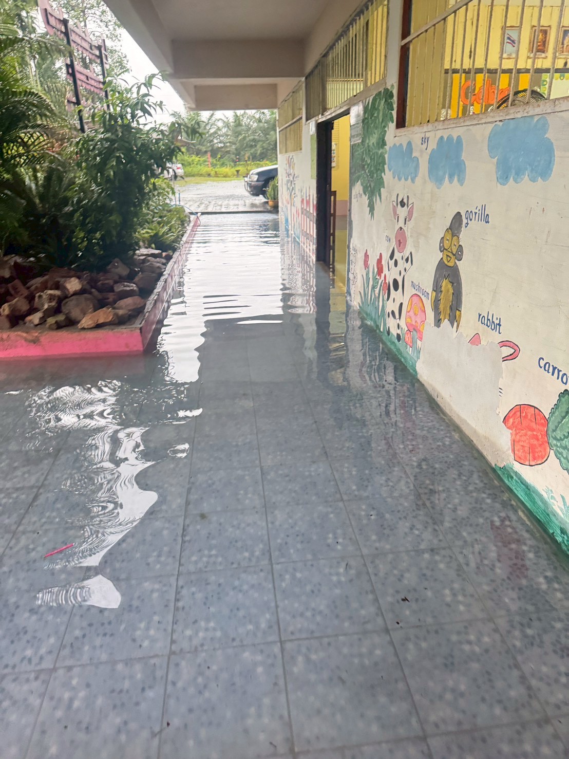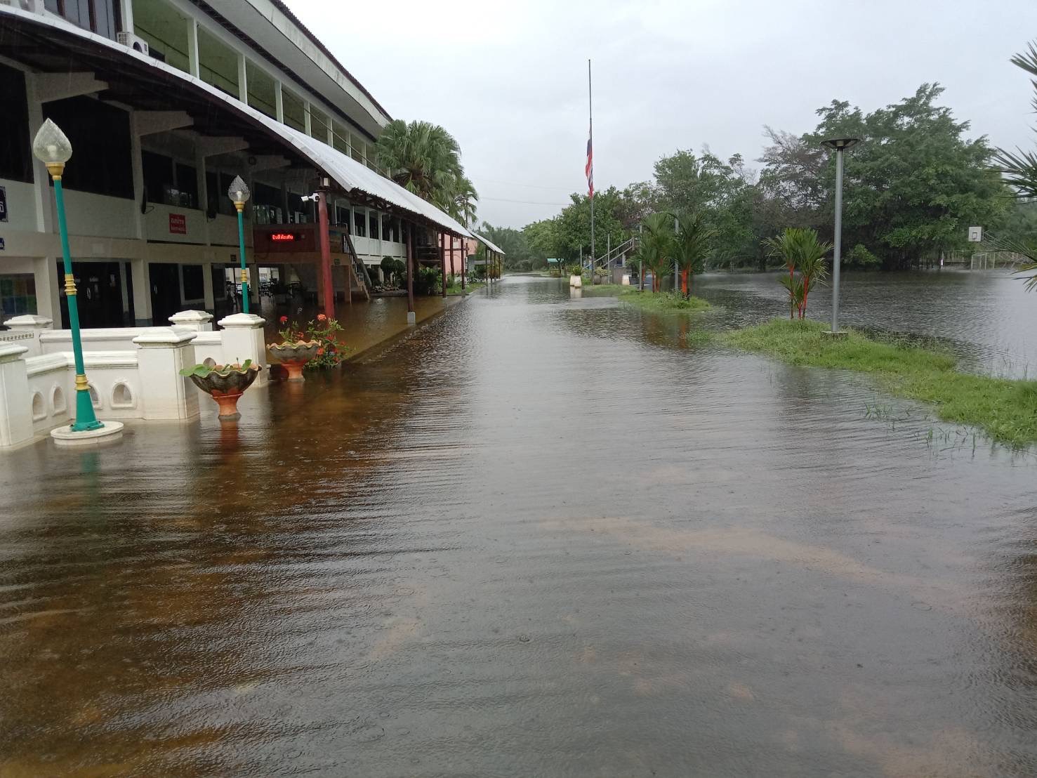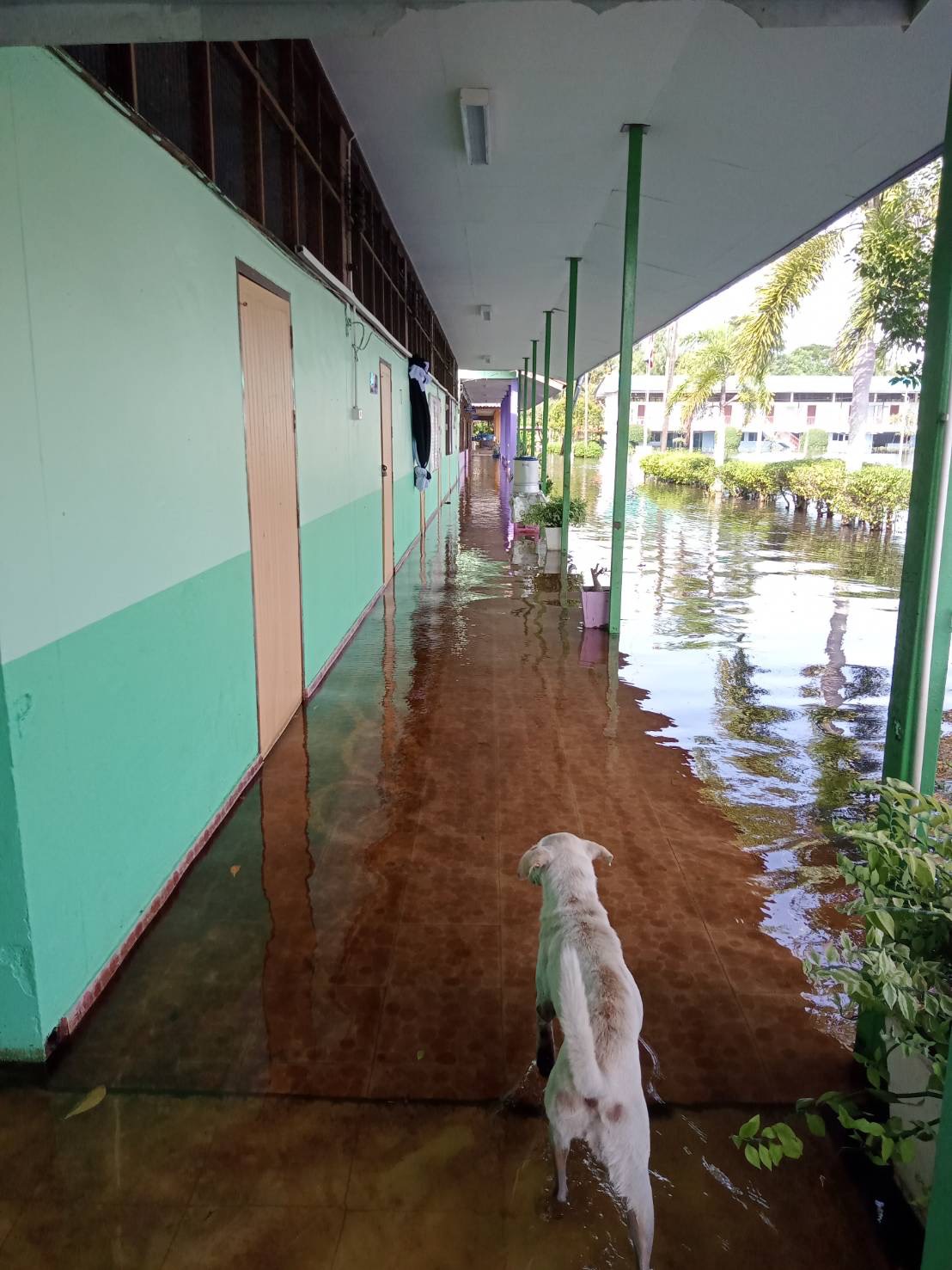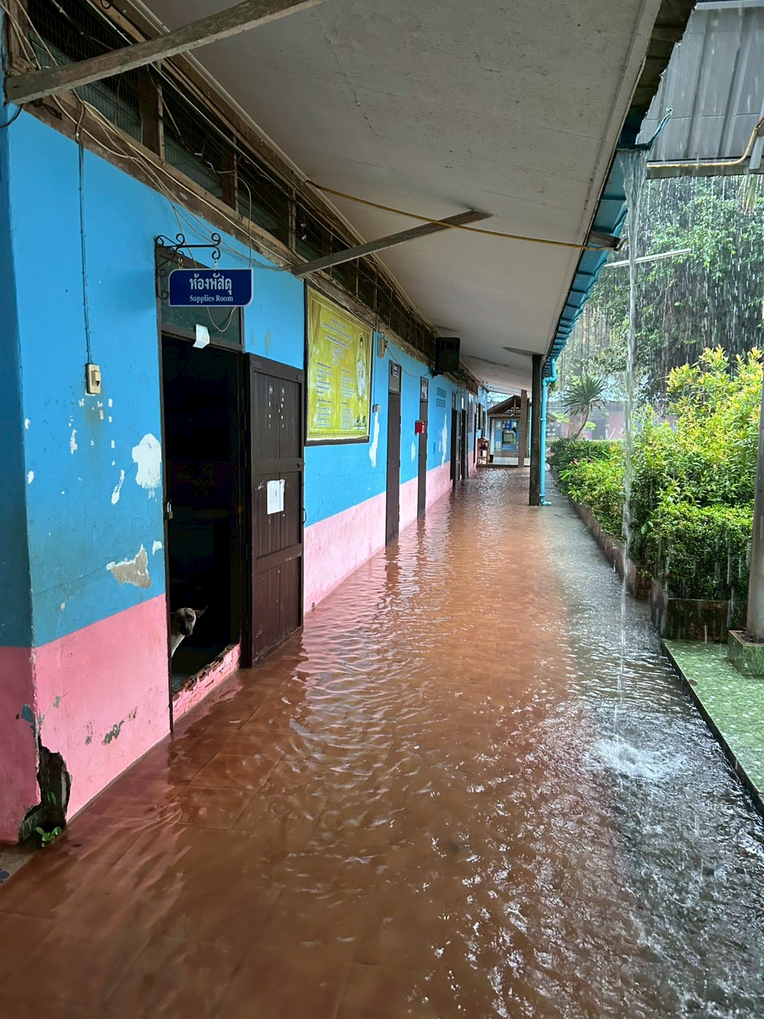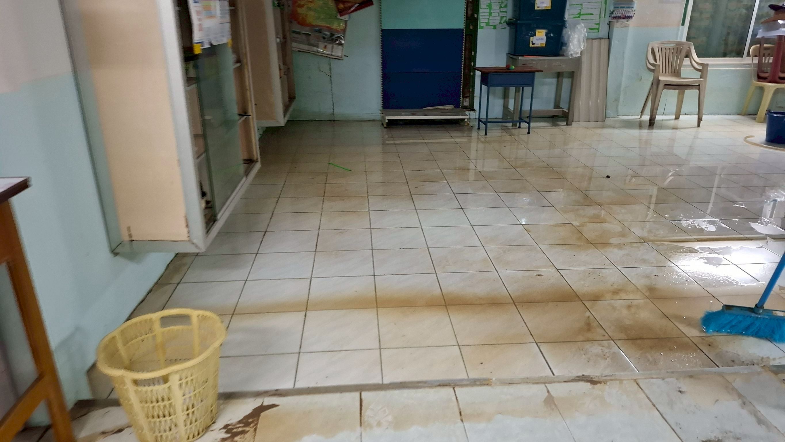 ฝนตกต่อเนื่อง มีน้ำท่วมขังบริเวณหน้าโรงเรียน อาคารเรียน น้ำเข้าห้องเรียน ห้องสมุด ห้องวิทยาศาสตร์ ห้องประชุม