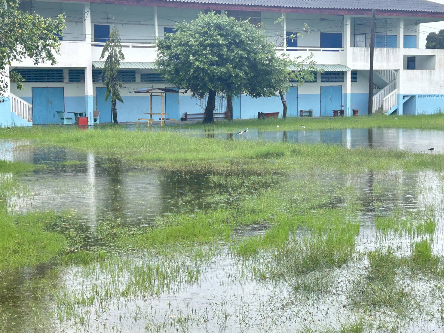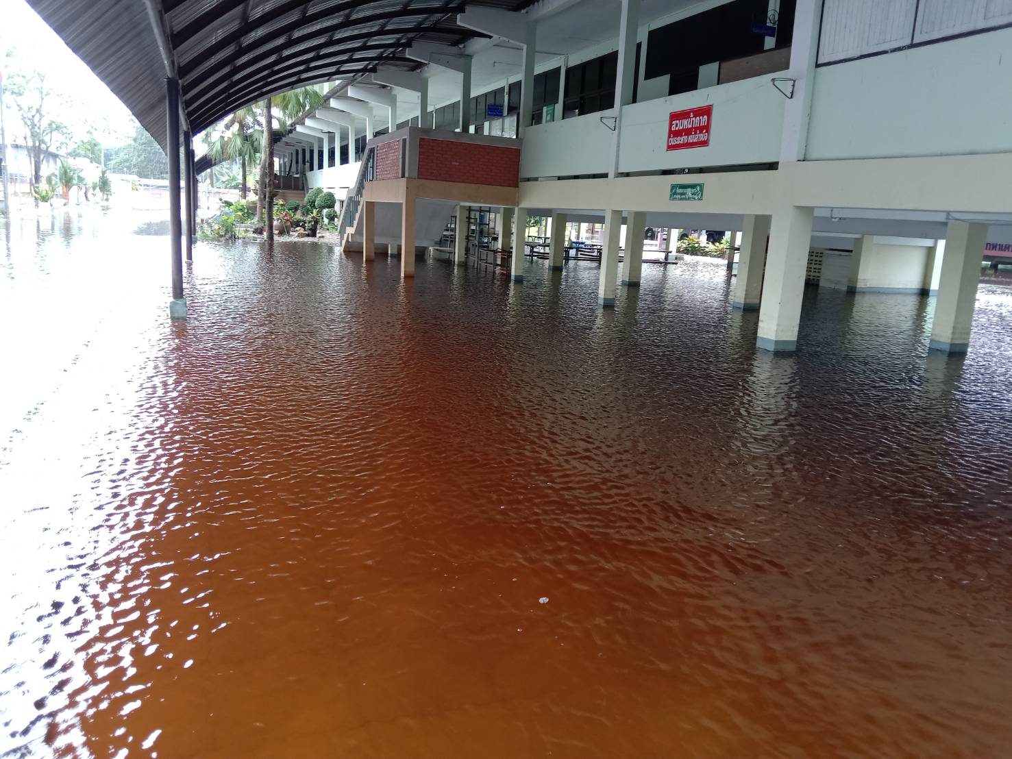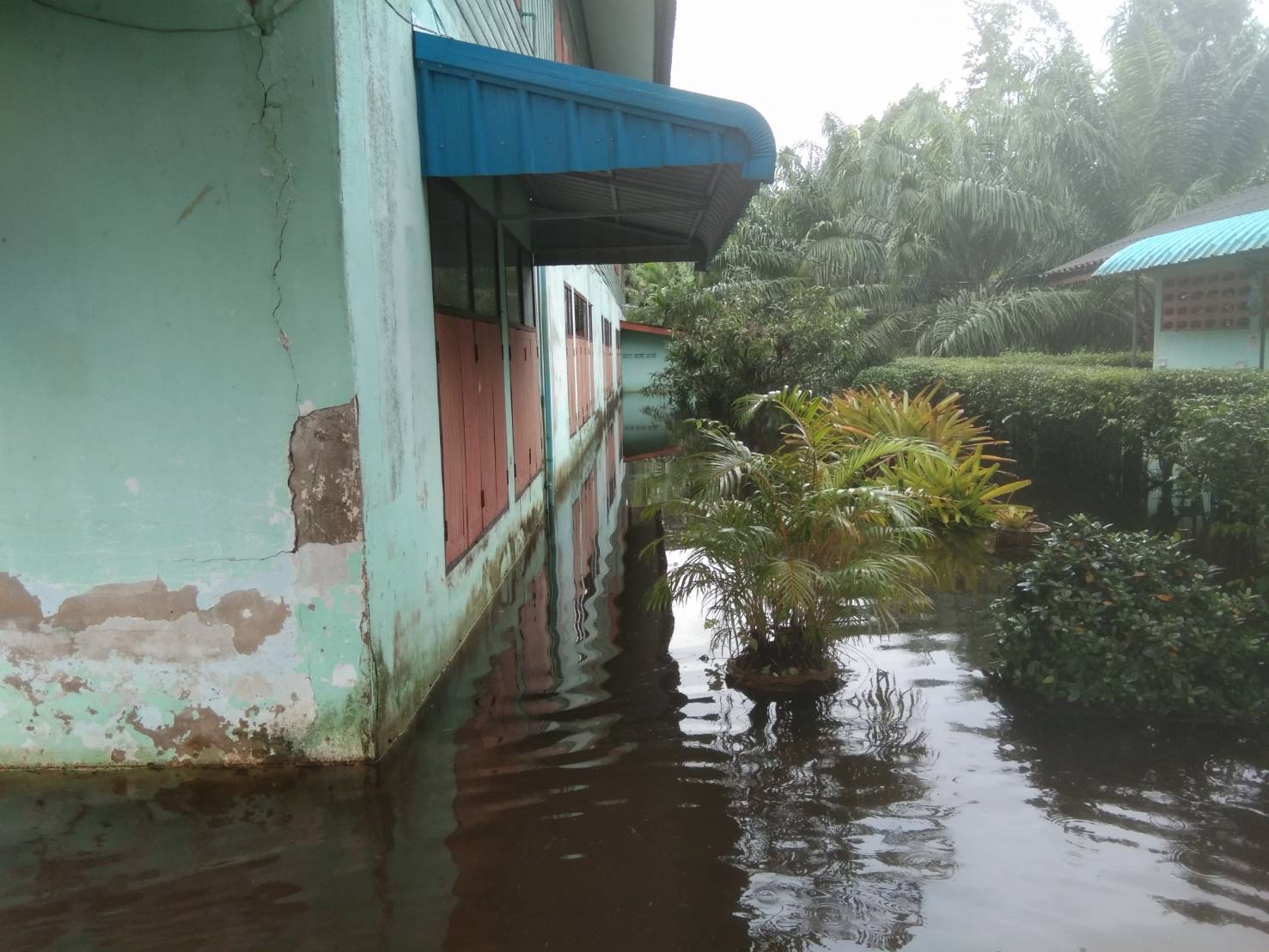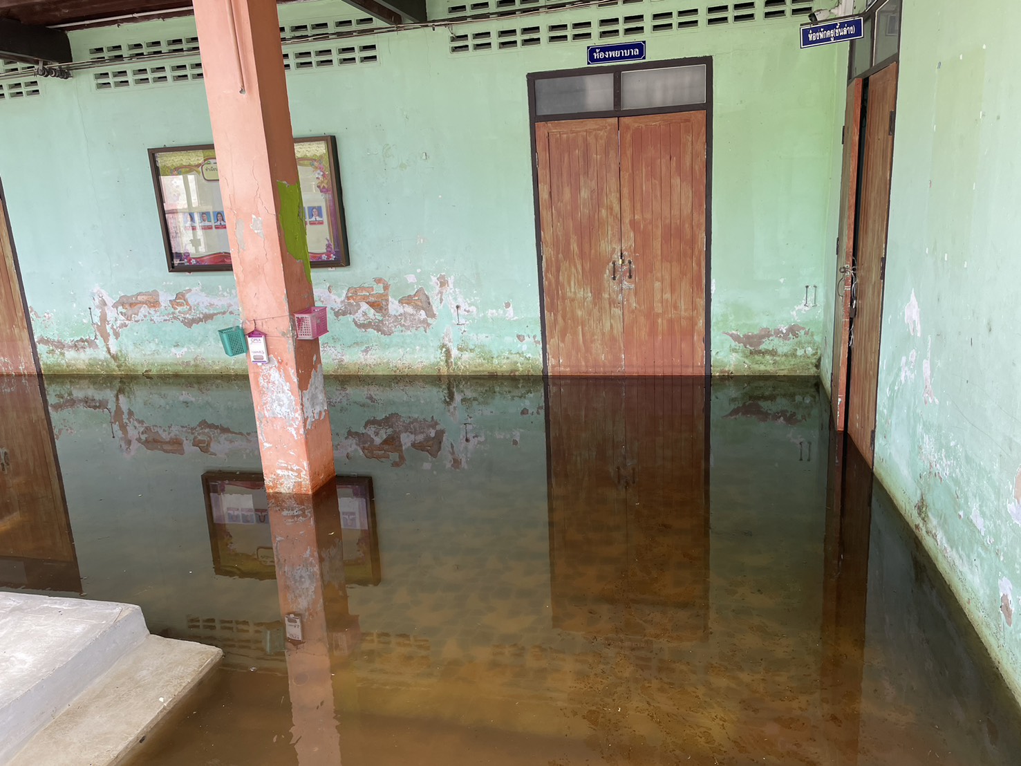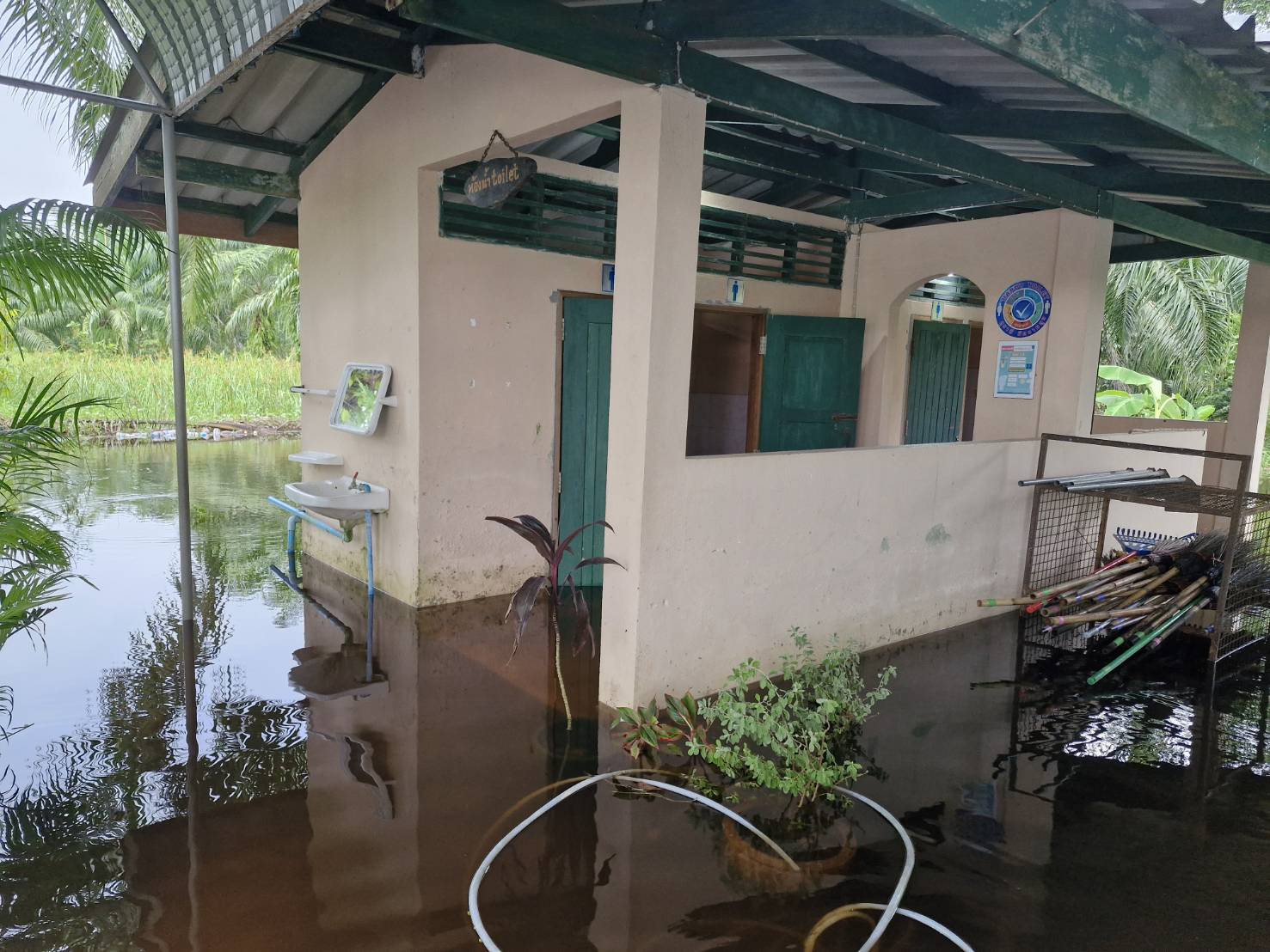 ฝนตกต่อเนื่อง มีน้ำท่วมขังบริเวณหน้าโรงเรียน อาคารเรียน น้ำเข้าห้องเรียน ห้องสมุด ห้องวิทยาศาสตร์ ห้องประชุม