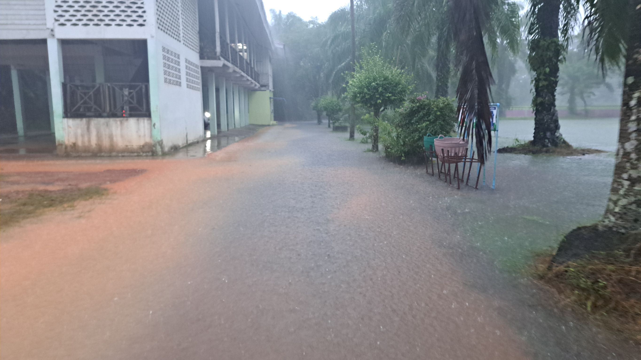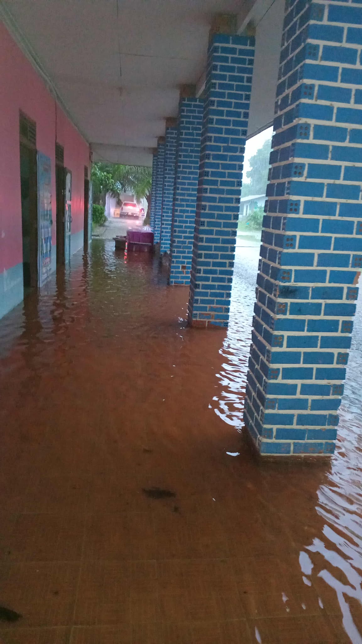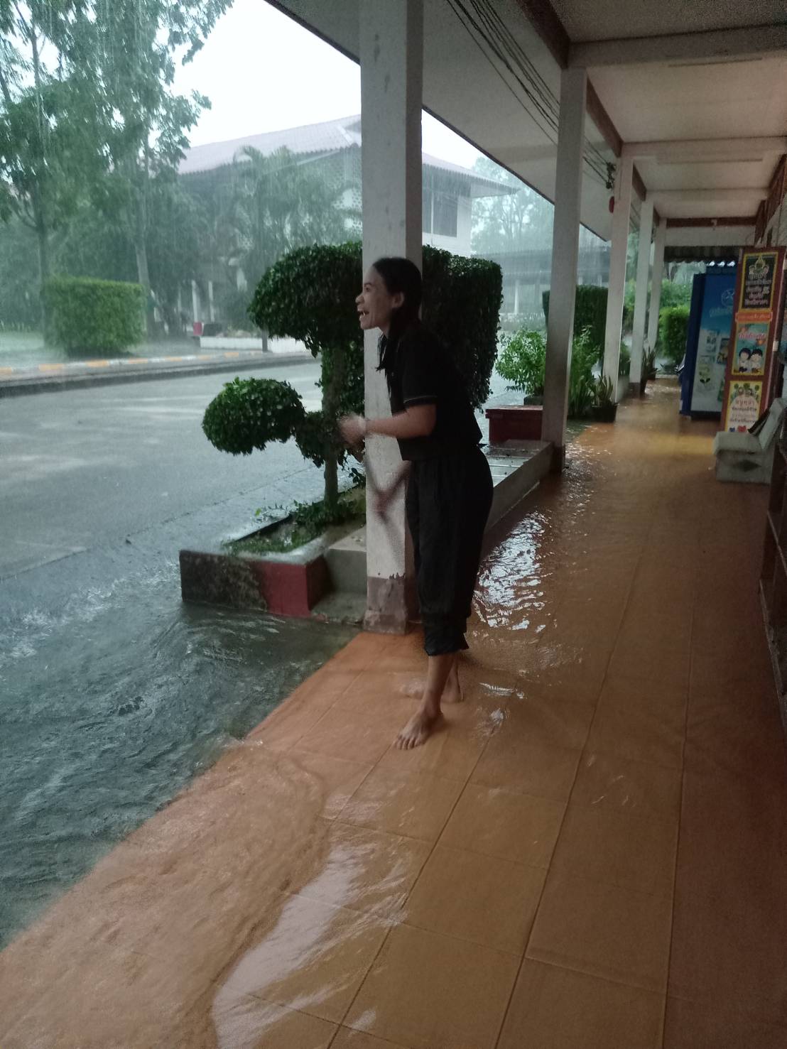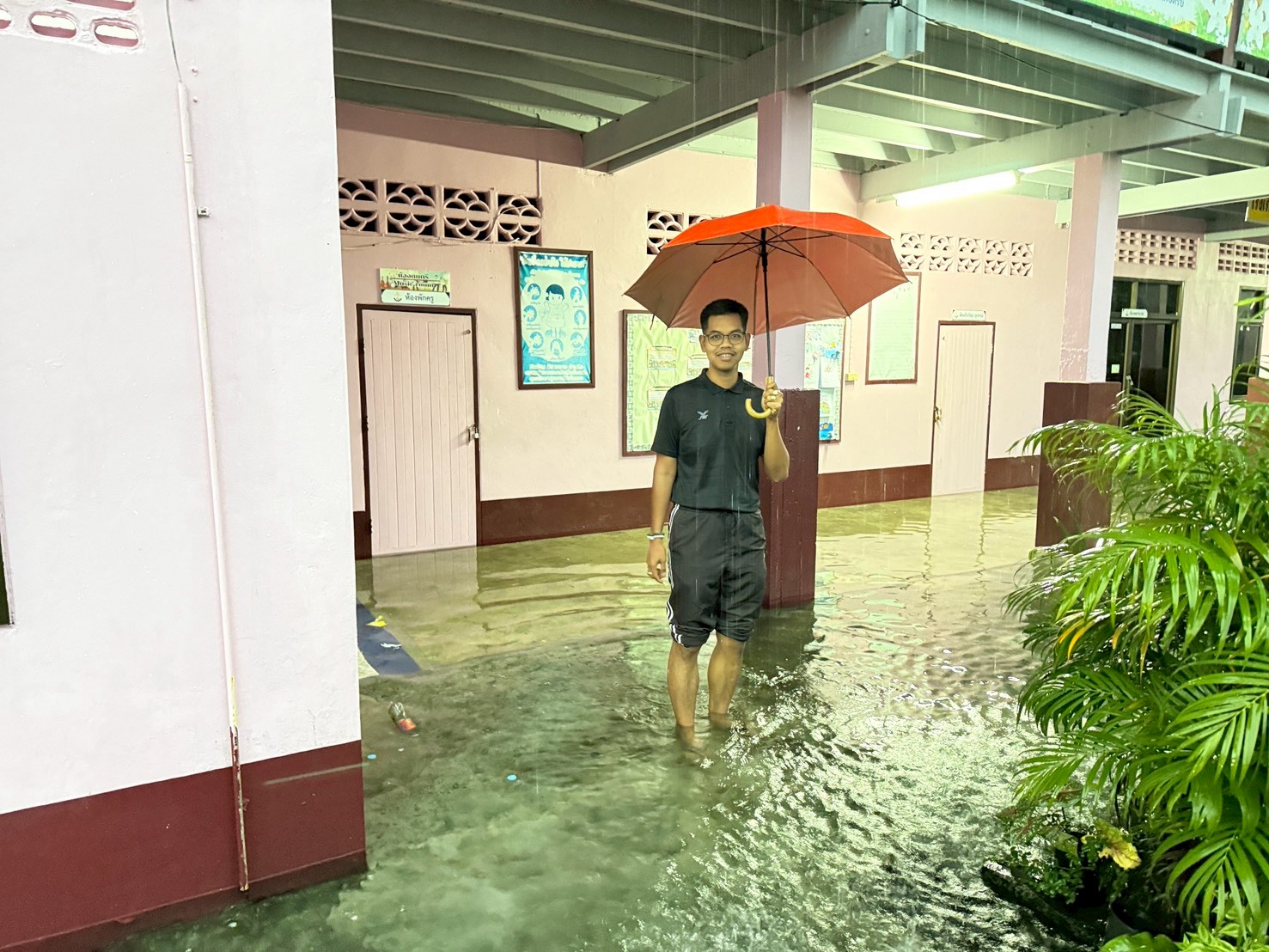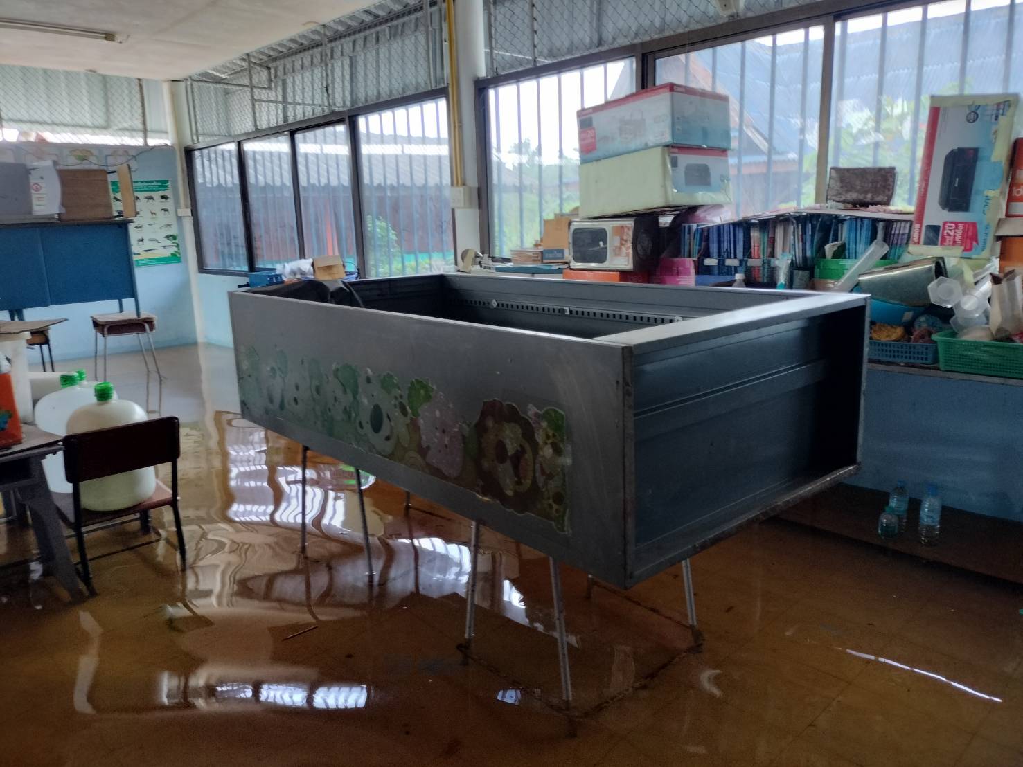 ฝนตกต่อเนื่อง มีน้ำท่วมขังบริเวณหน้าโรงเรียน อาคารเรียน น้ำเข้าห้องเรียน ห้องสมุด ห้องวิทยาศาสตร์ ห้องประชุม