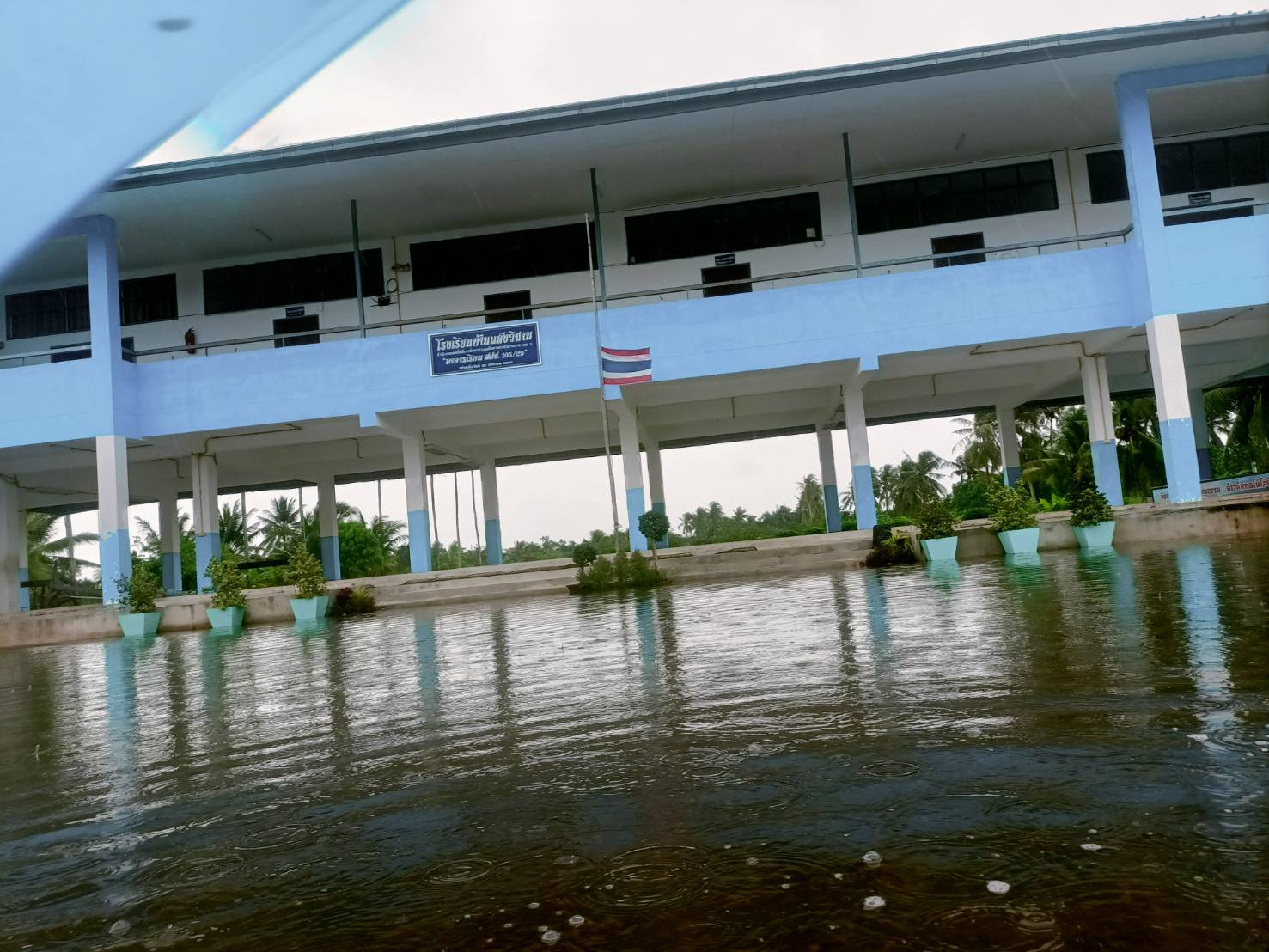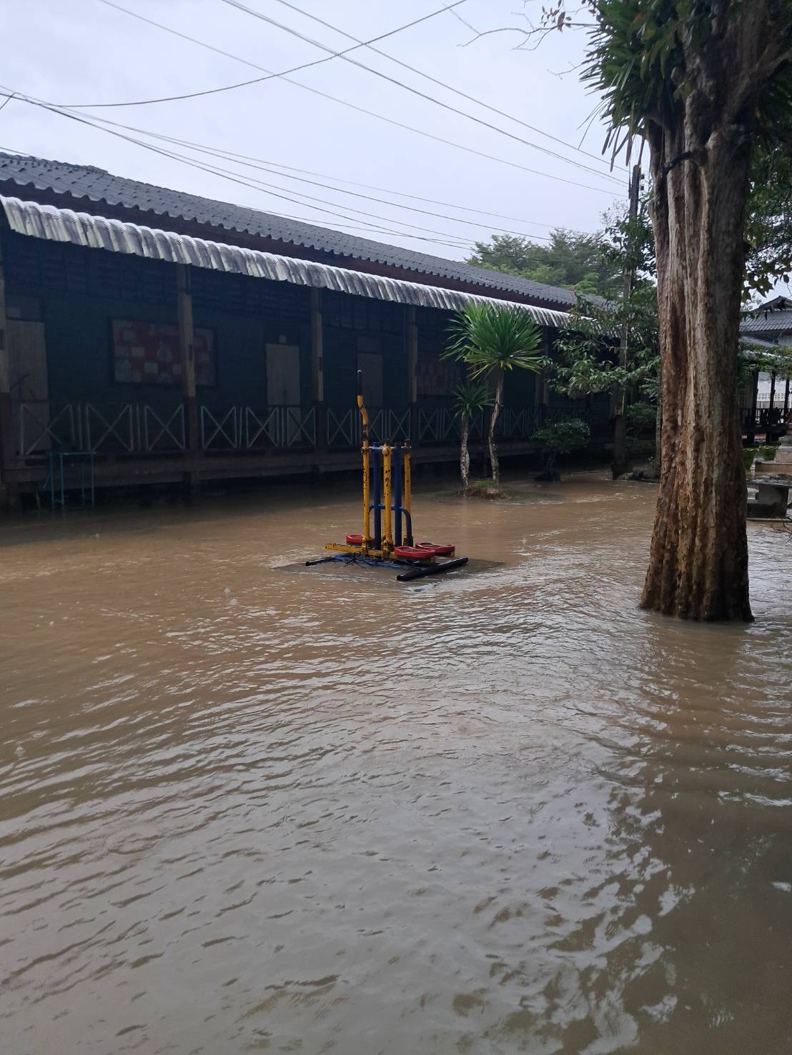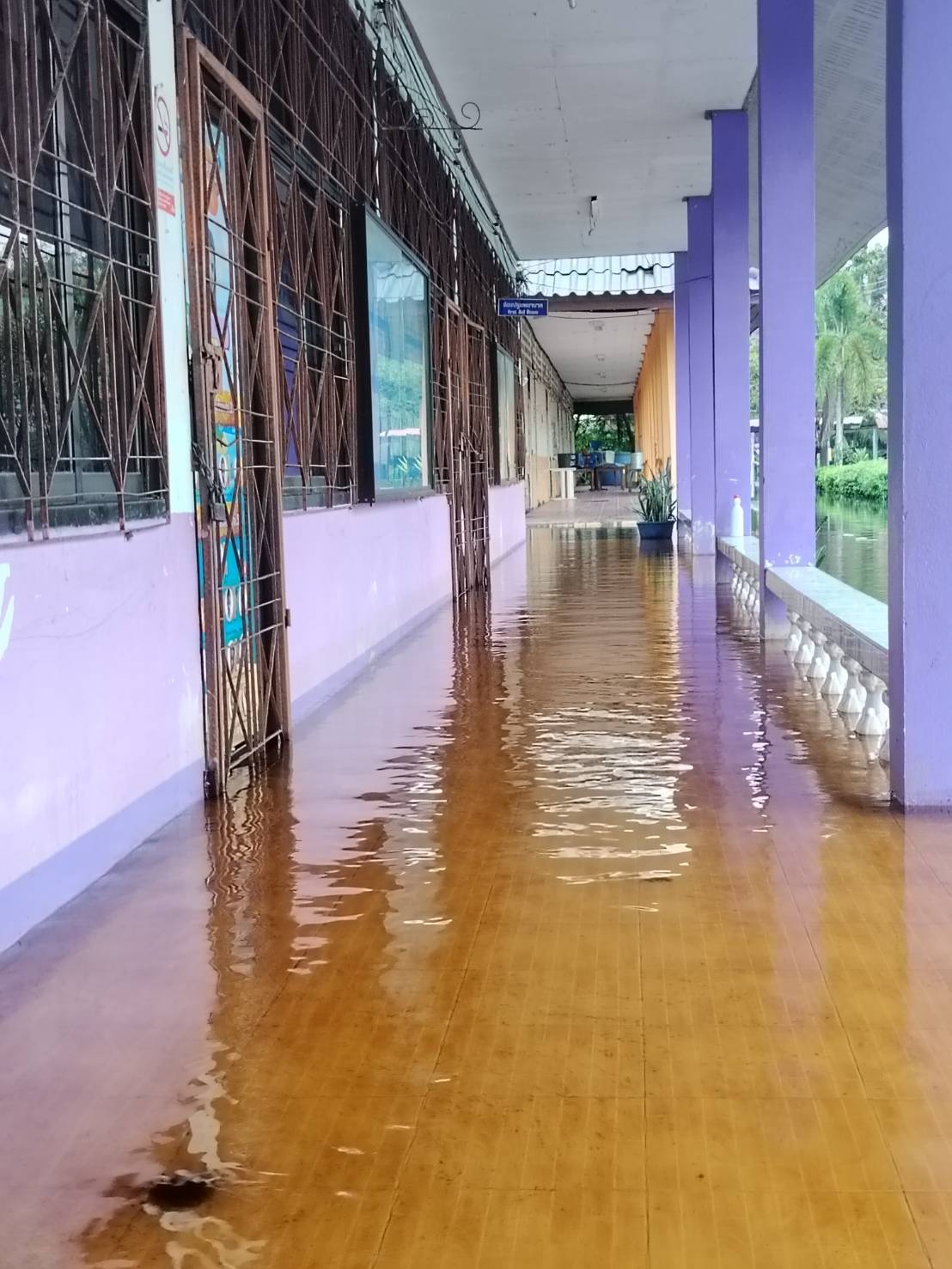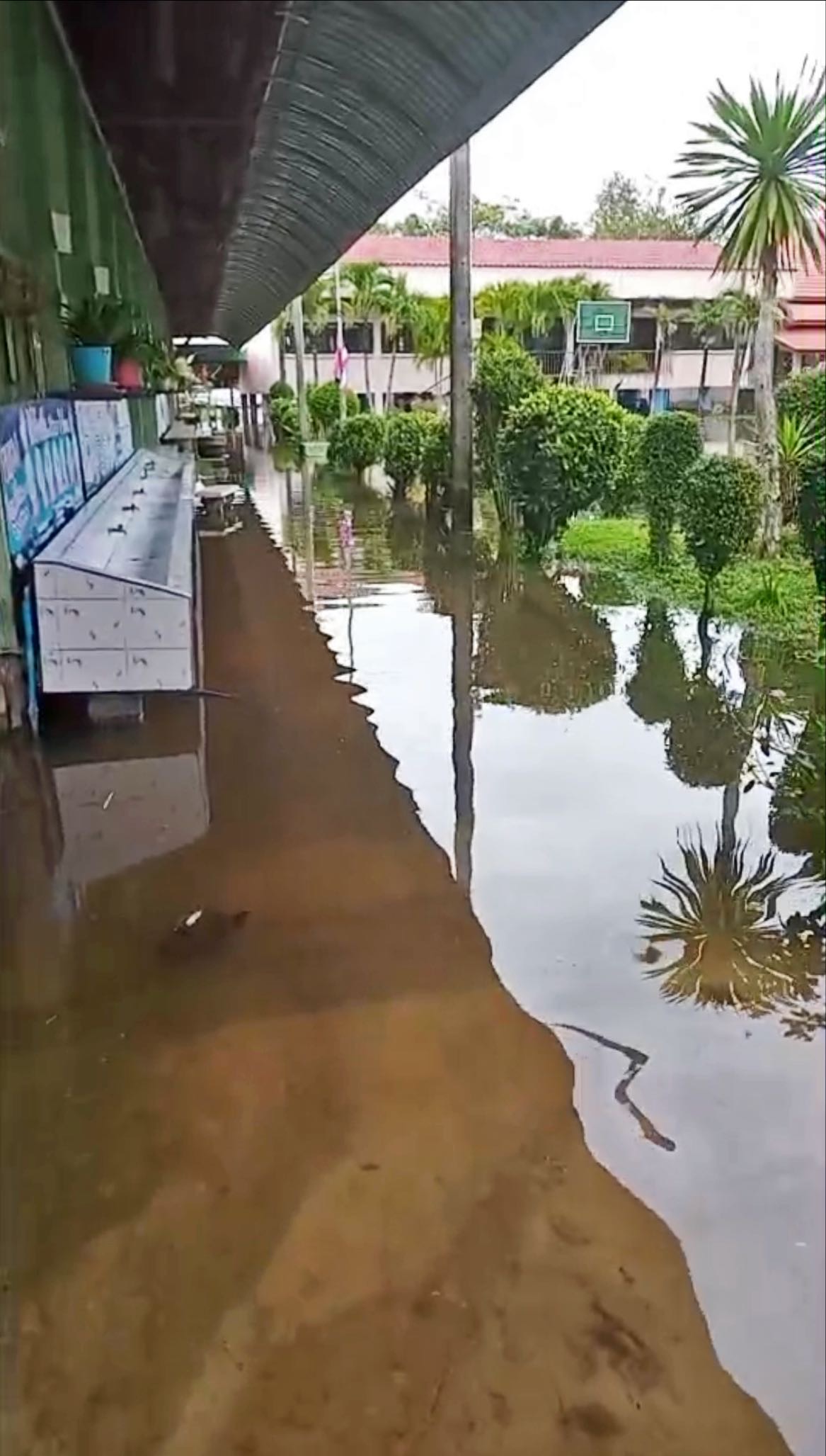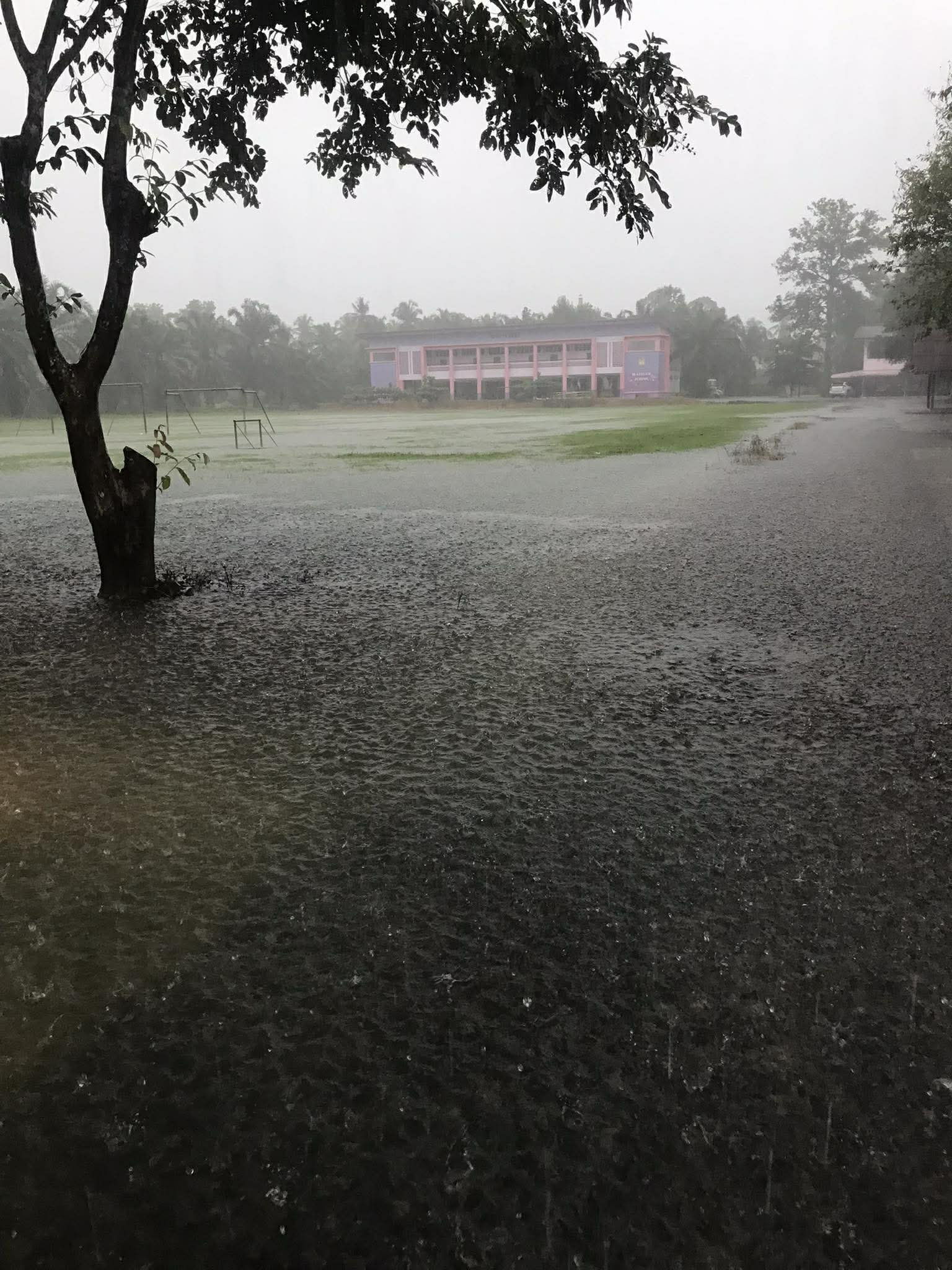 ฝนตกต่อเนื่อง มีน้ำท่วมขังบริเวณหน้าโรงเรียน อาคารเรียน น้ำเข้าห้องเรียน ห้องสมุด ห้องวิทยาศาสตร์ ห้องประชุม