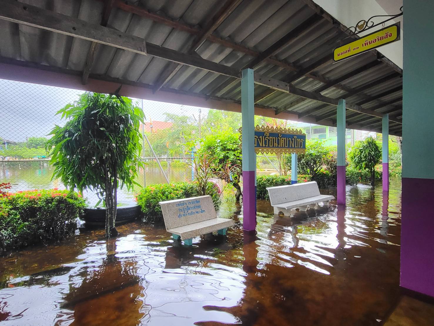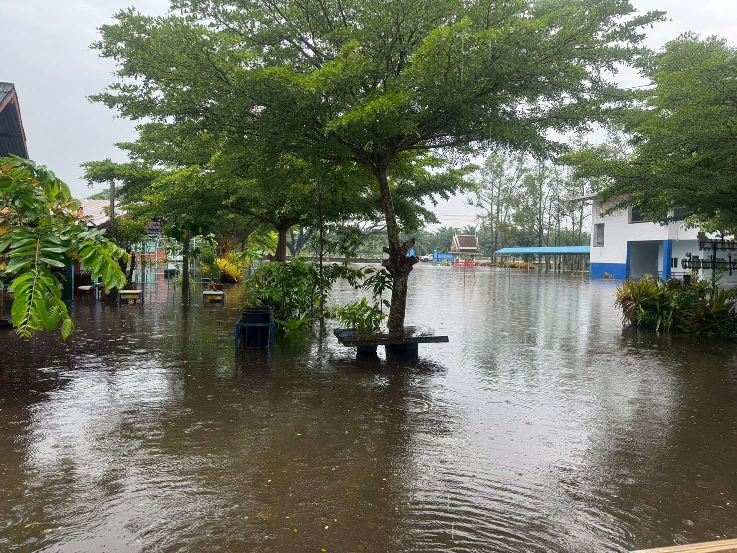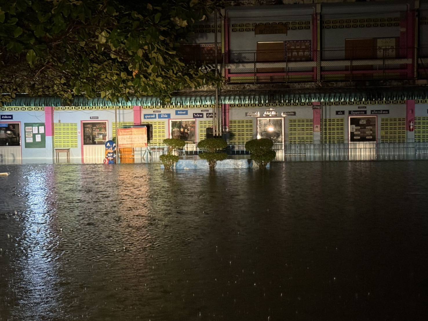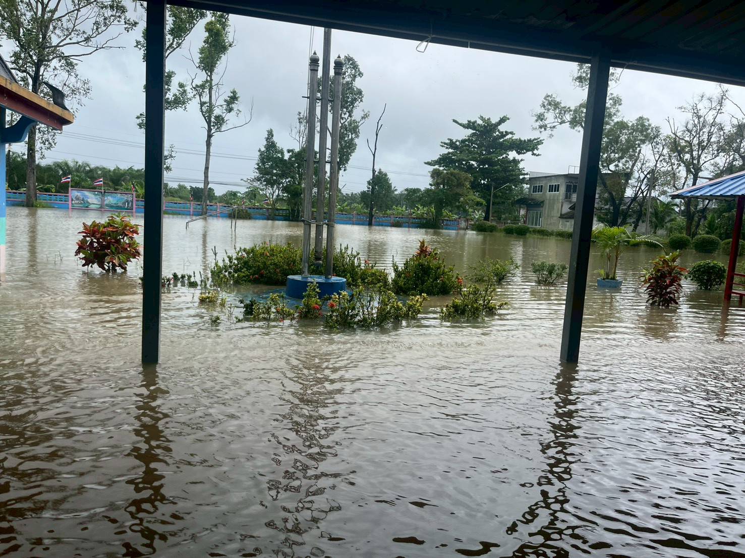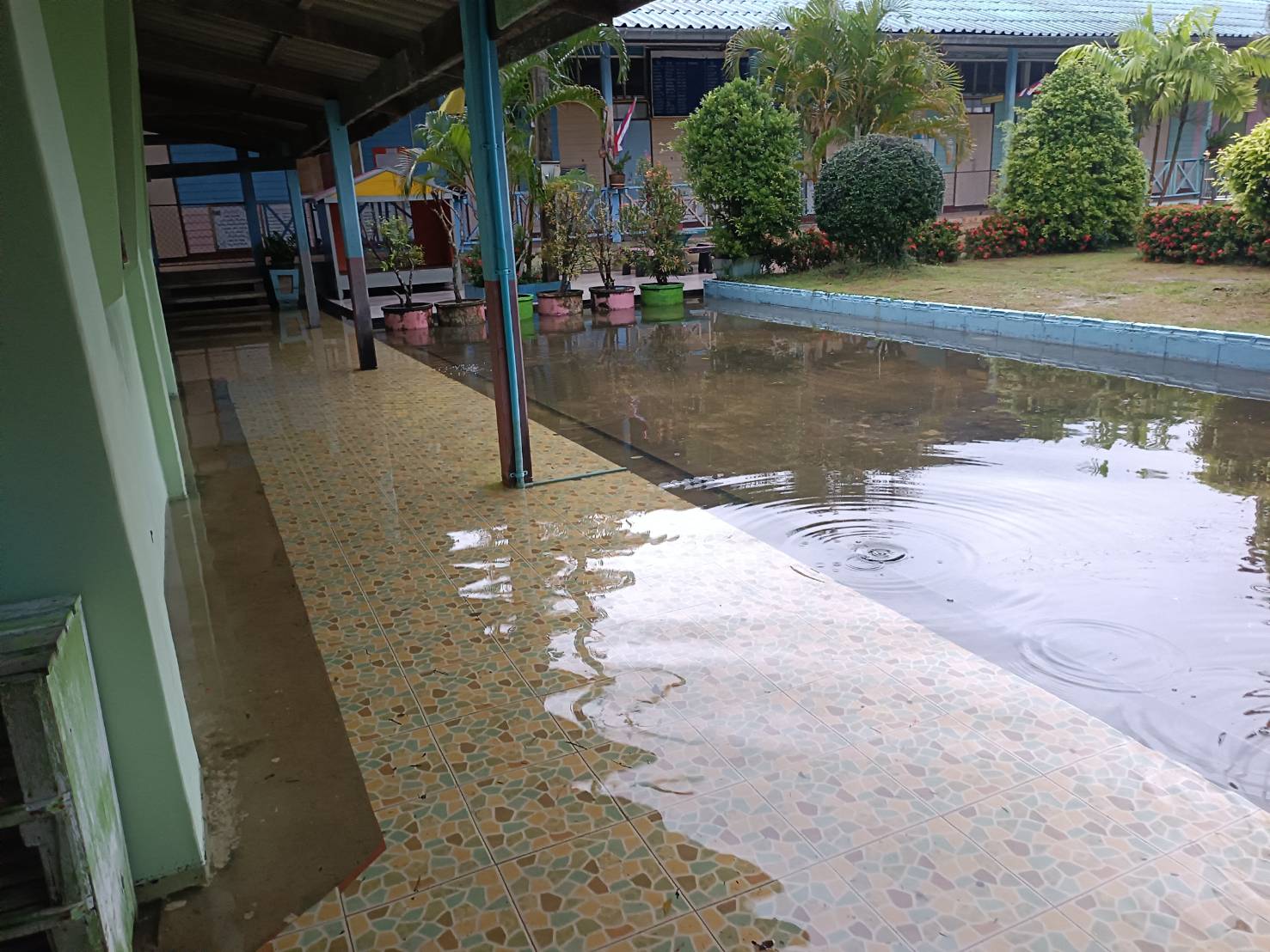 ฝนตกต่อเนื่อง มีน้ำท่วมขังบริเวณหน้าโรงเรียน อาคารเรียน น้ำเข้าห้องเรียน ห้องสมุด ห้องวิทยาศาสตร์ ห้องประชุม