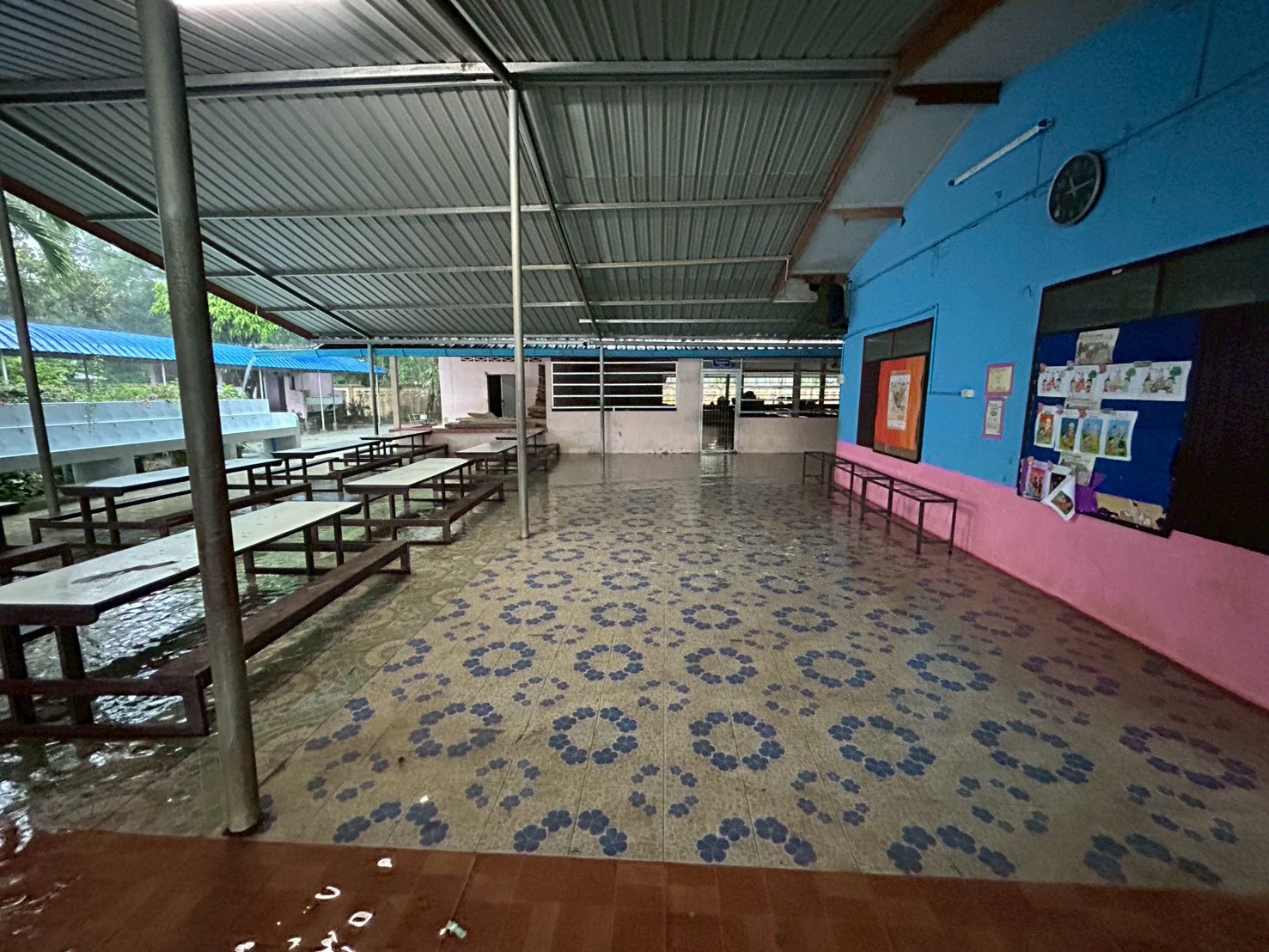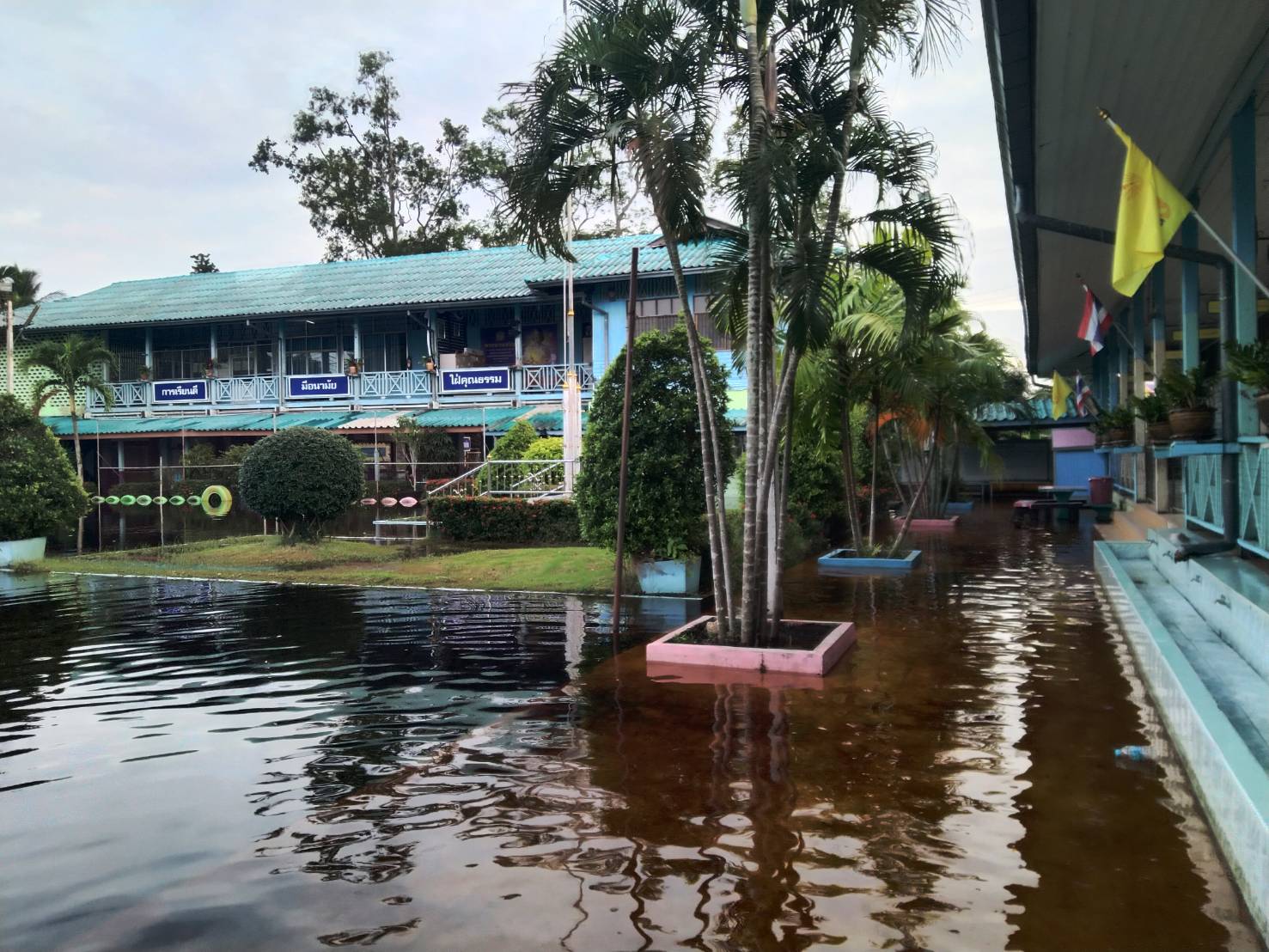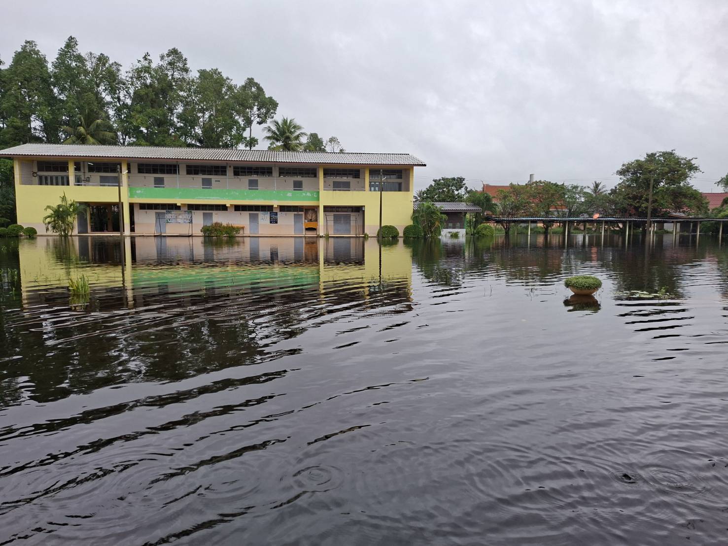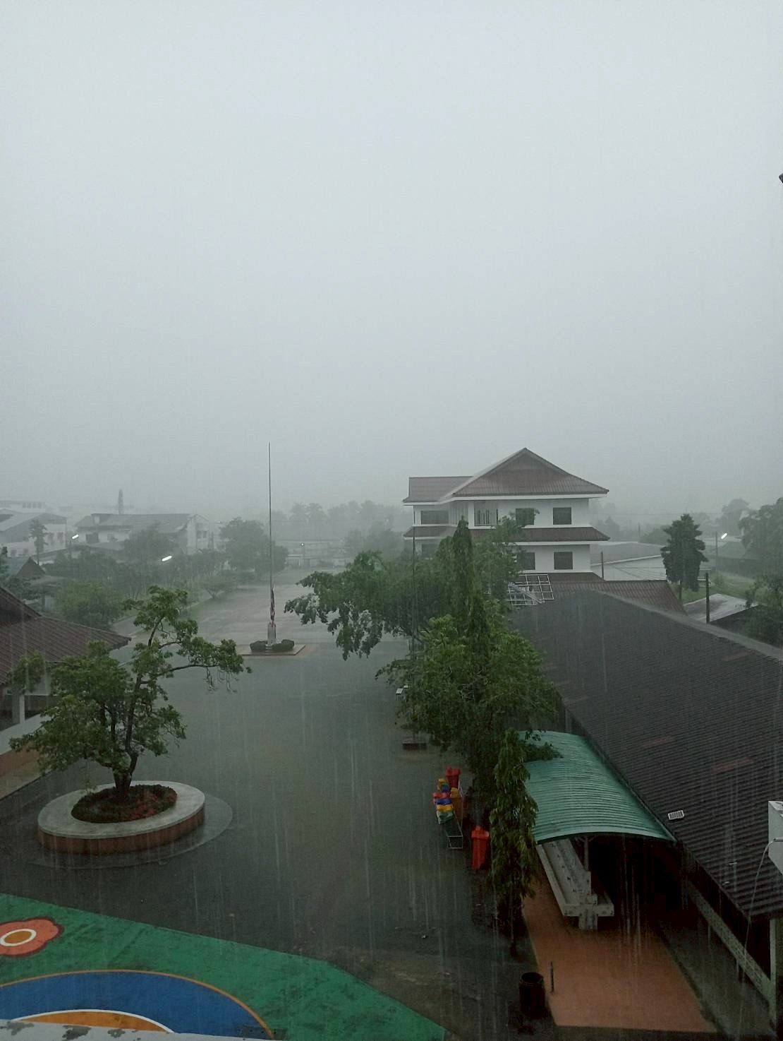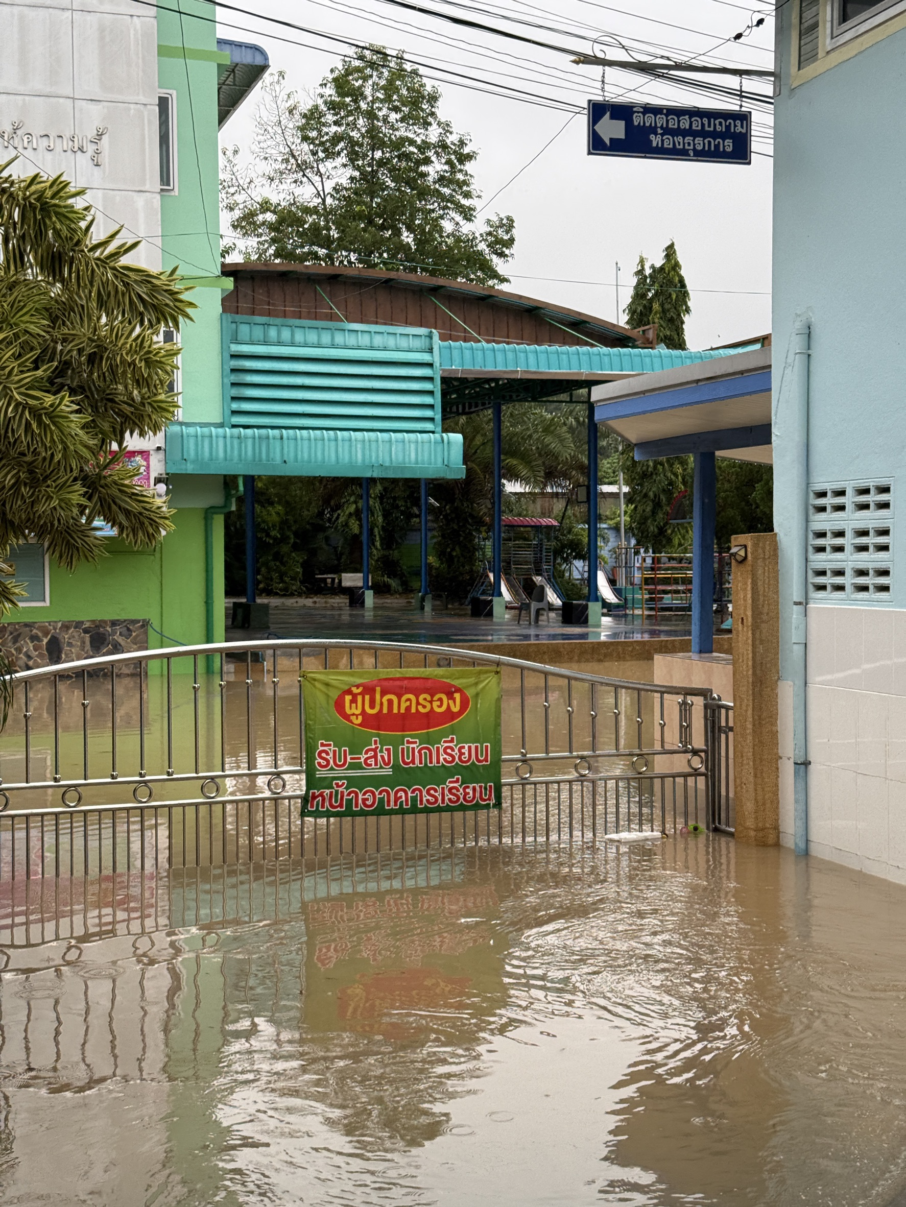 ฝนตกต่อเนื่อง มีน้ำท่วมขังบริเวณหน้าโรงเรียน อาคารเรียน น้ำเข้าห้องเรียน ห้องสมุด ห้องวิทยาศาสตร์ ห้องประชุม