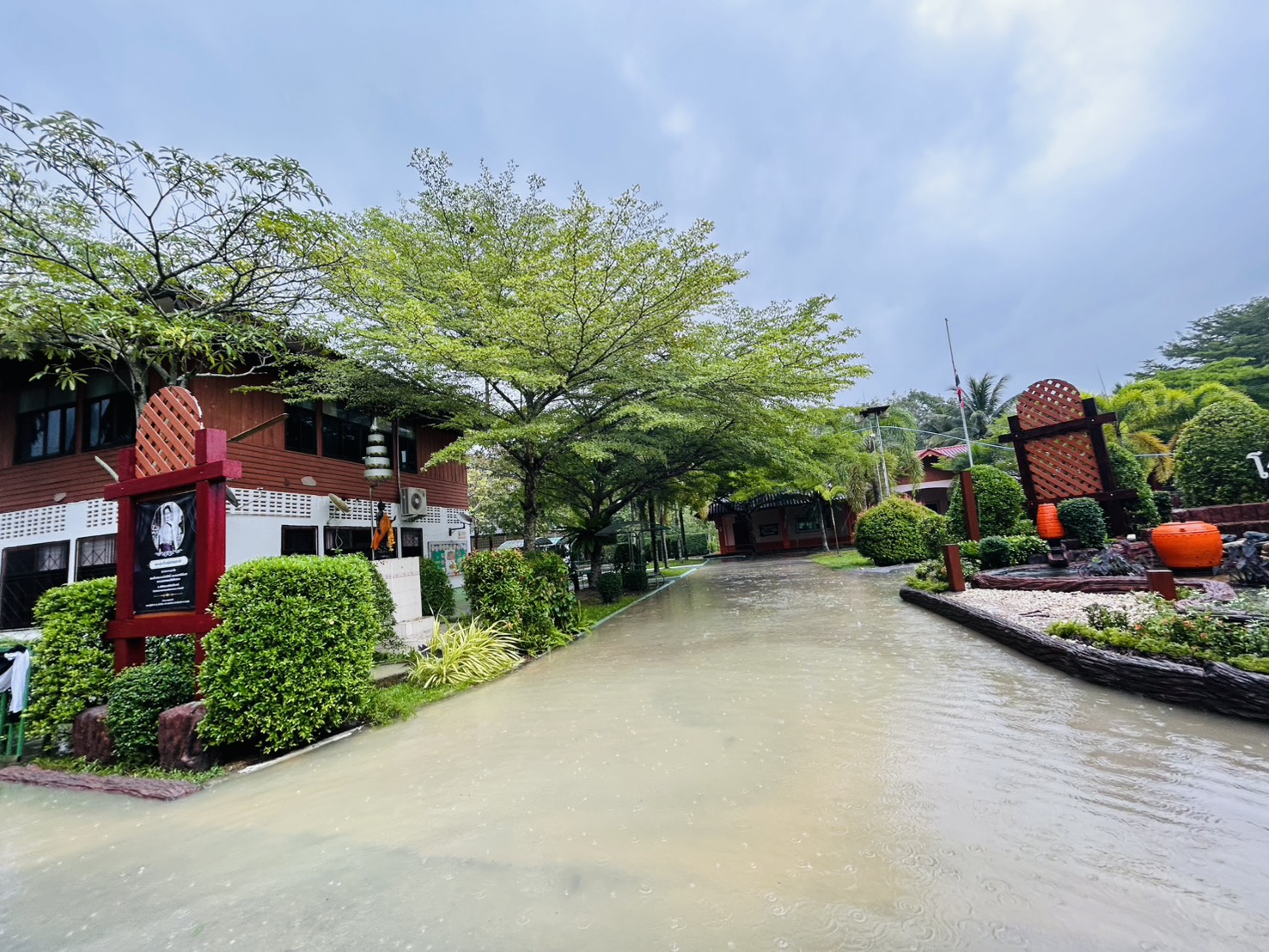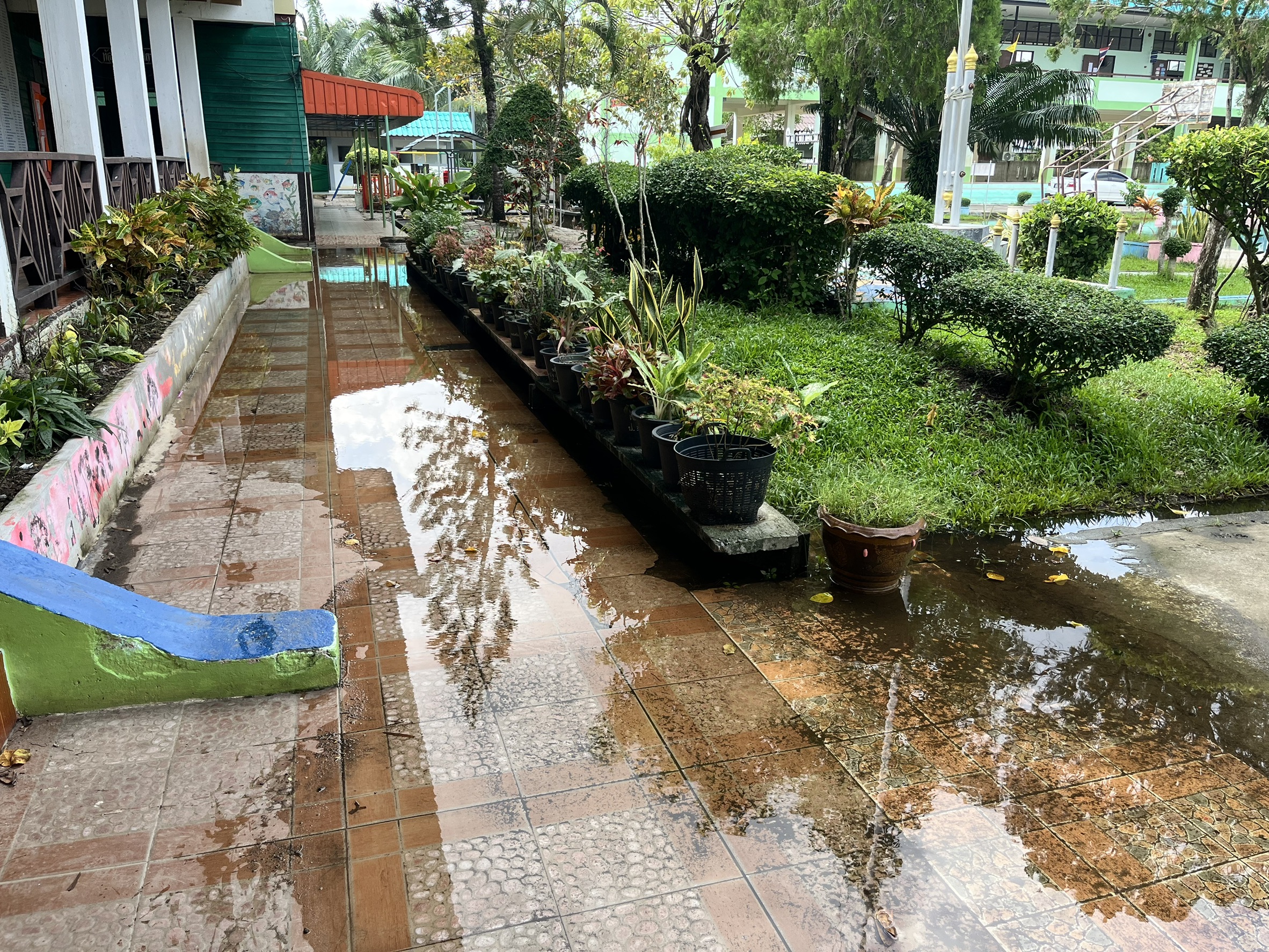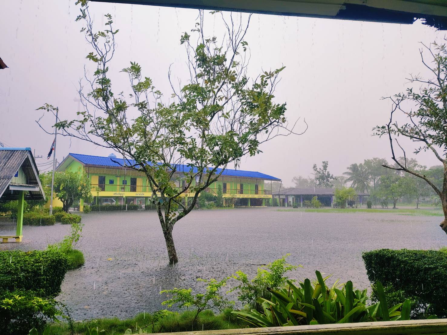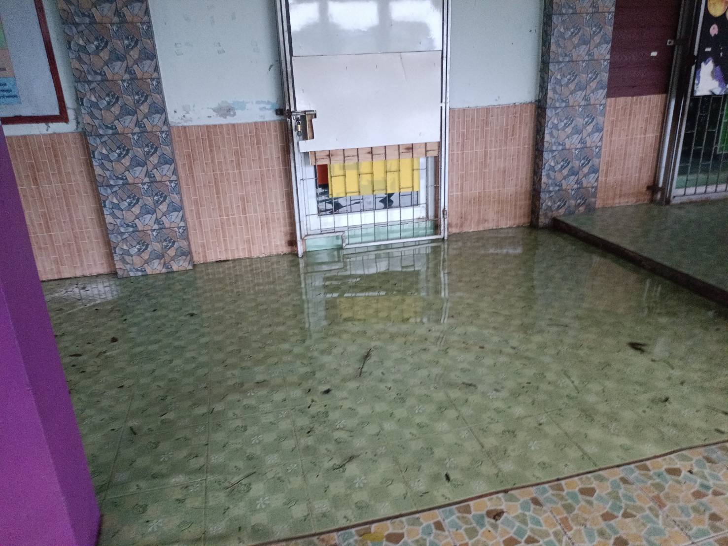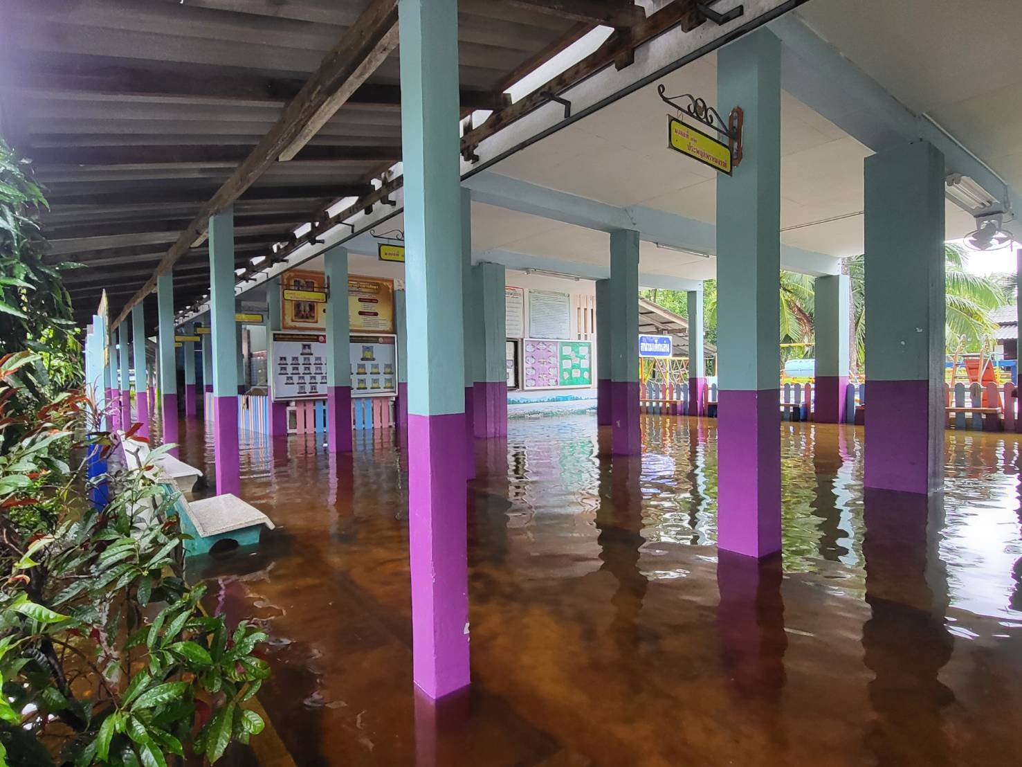 ฝนตกต่อเนื่อง มีน้ำท่วมขังบริเวณหน้าโรงเรียน อาคารเรียน น้ำเข้าห้องเรียน ห้องสมุด ห้องวิทยาศาสตร์ ห้องประชุม