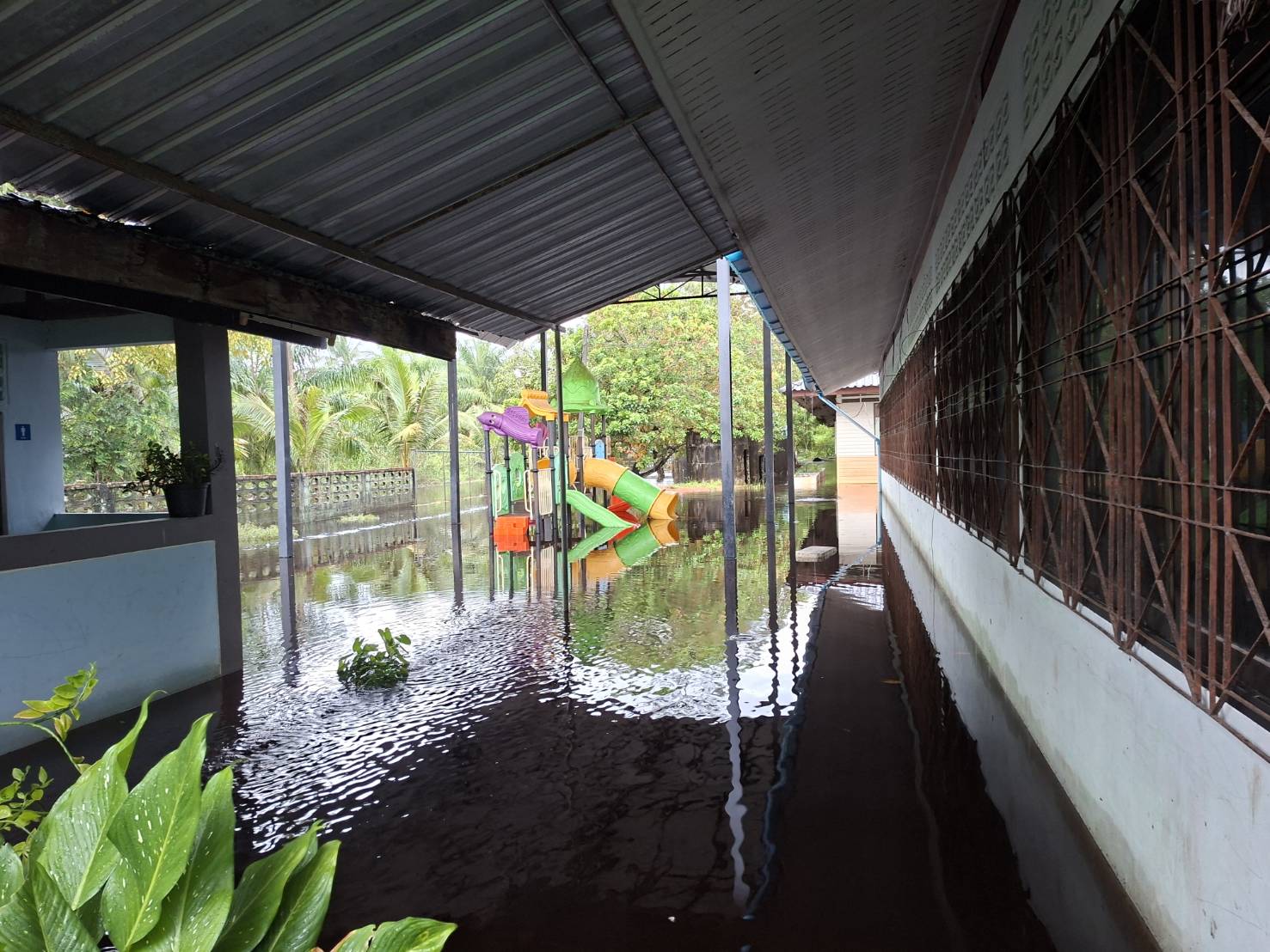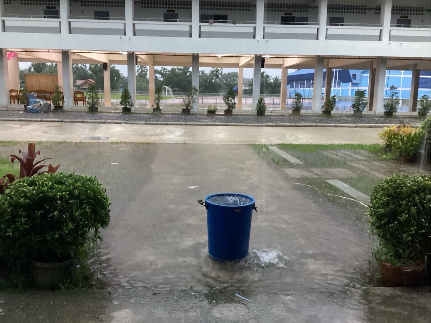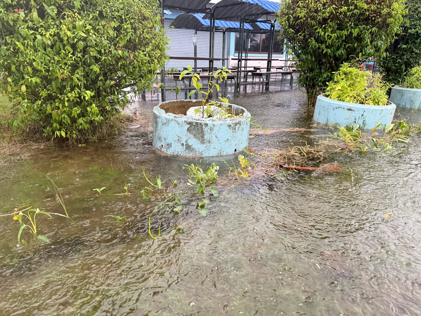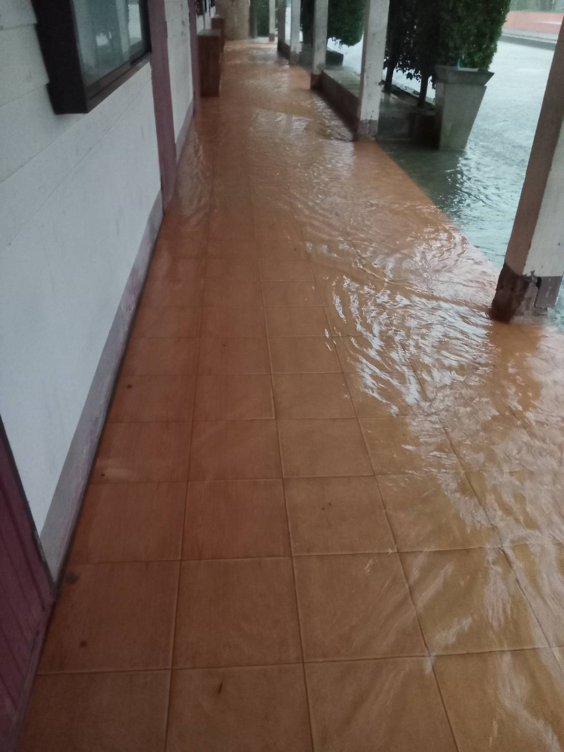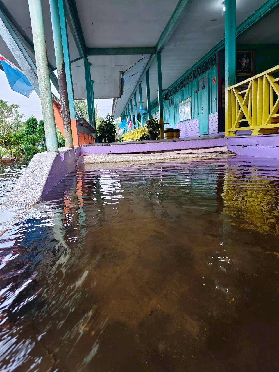 ฝนตกต่อเนื่อง มีน้ำท่วมขังบริเวณหน้าโรงเรียน อาคารเรียน น้ำเข้าห้องเรียน ห้องสมุด ห้องวิทยาศาสตร์ ห้องประชุม