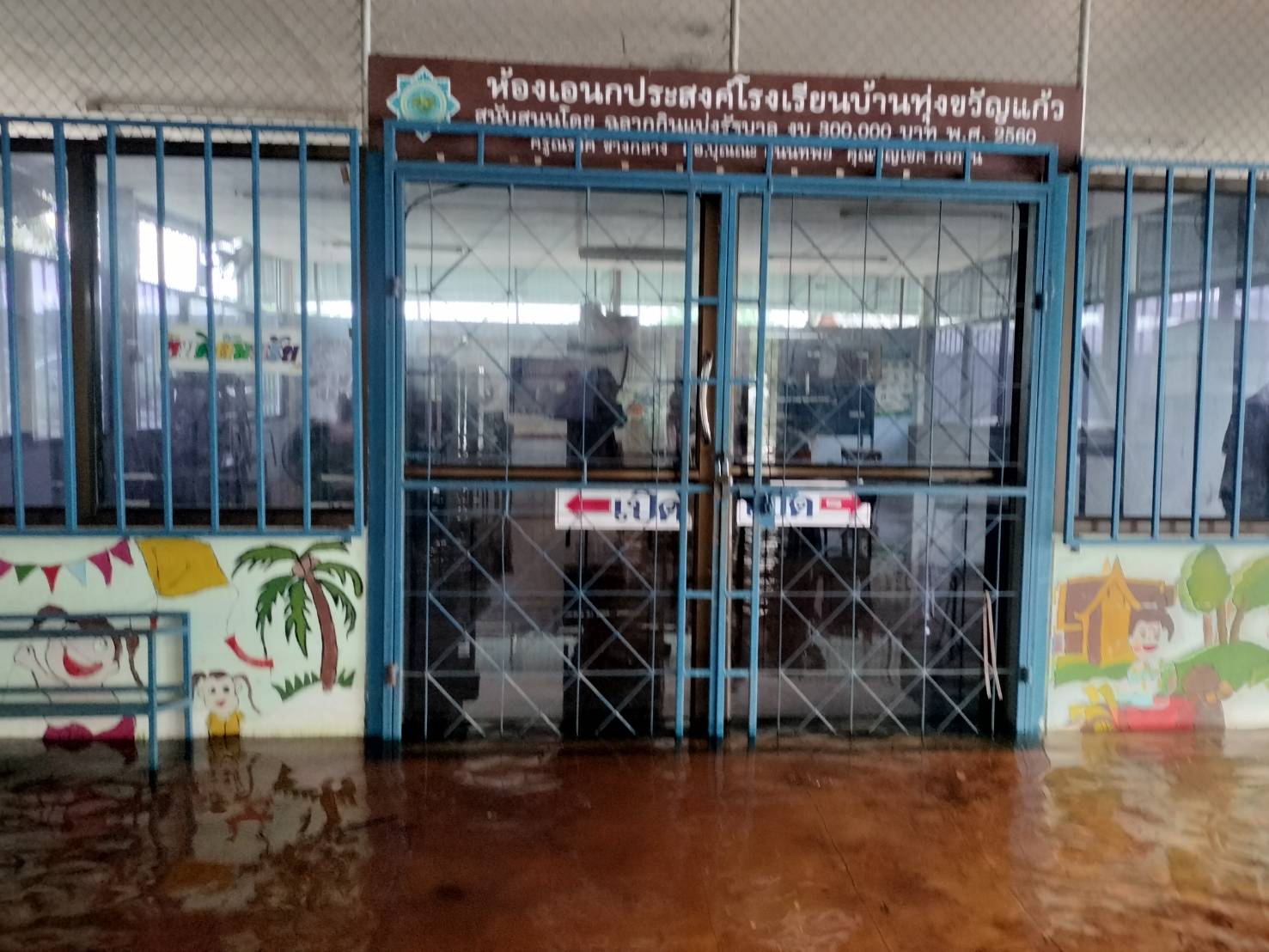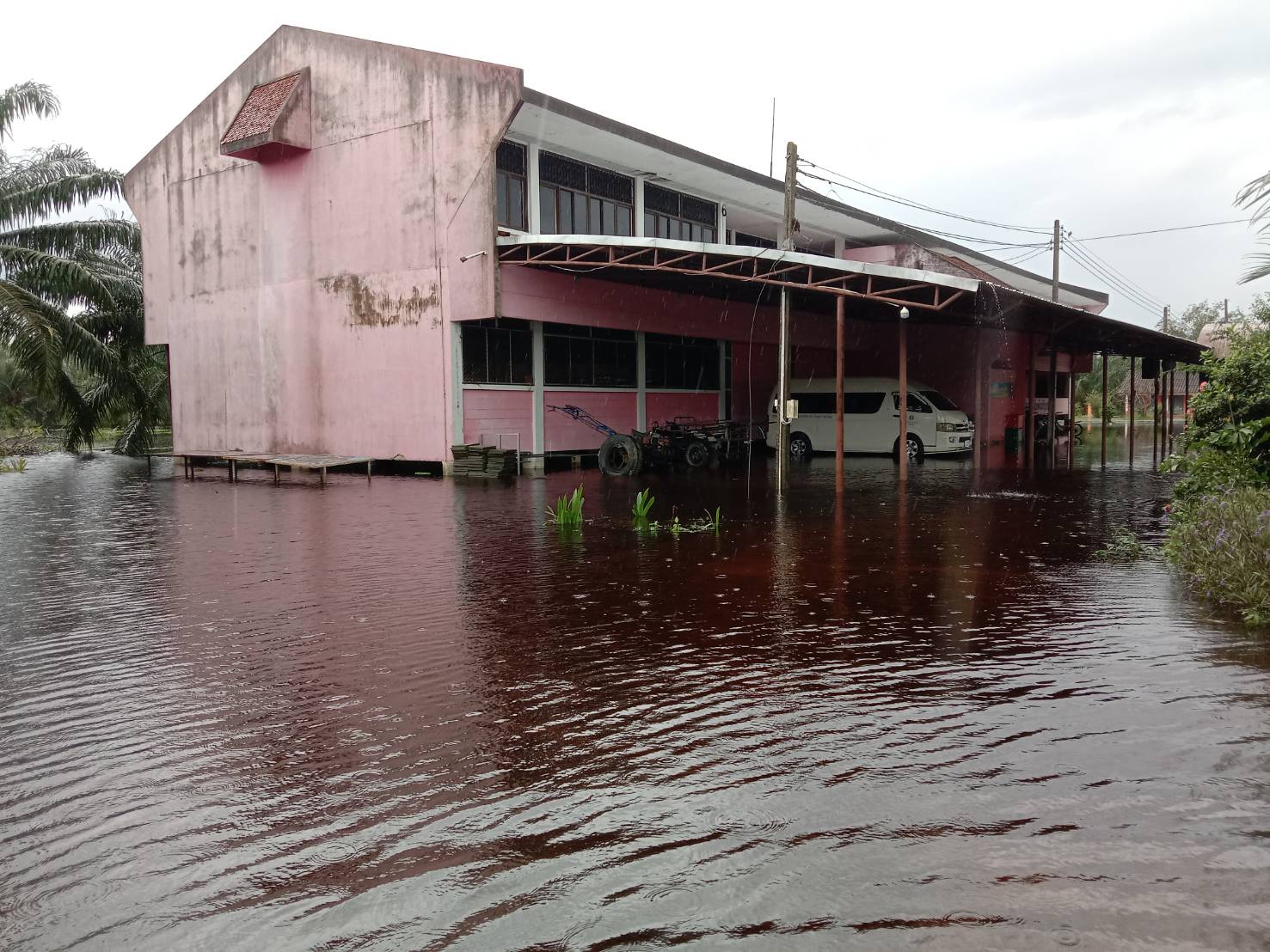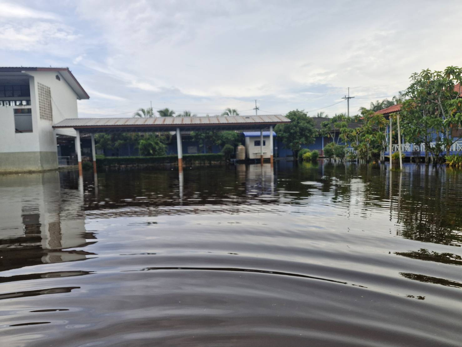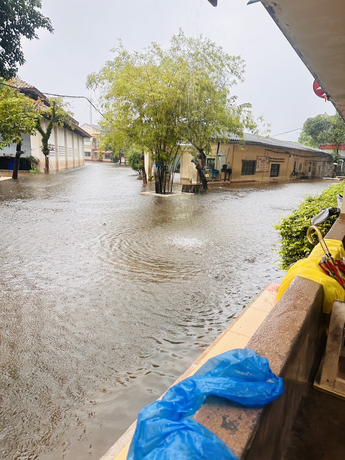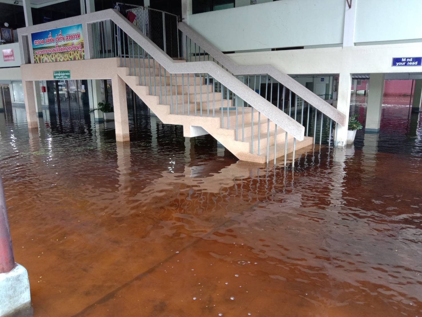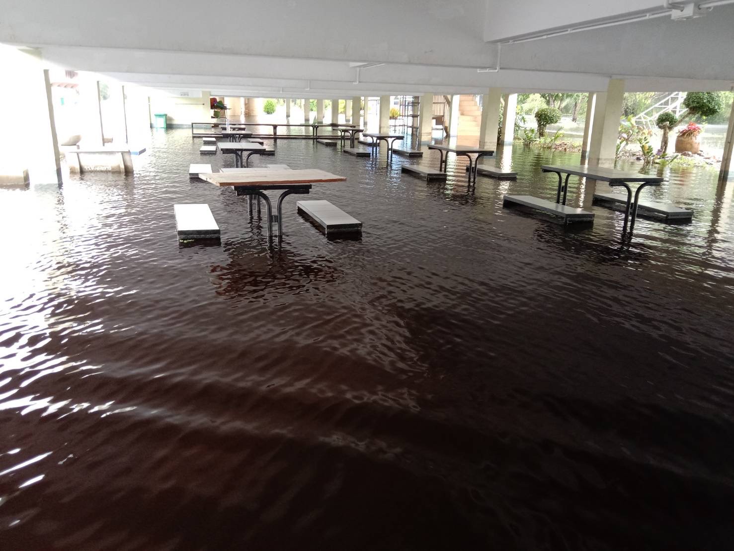 ฝนตกต่อเนื่อง มีน้ำท่วมขังบริเวณหน้าโรงเรียน อาคารเรียน น้ำเข้าห้องเรียน ห้องสมุด ห้องวิทยาศาสตร์ ห้องประชุม