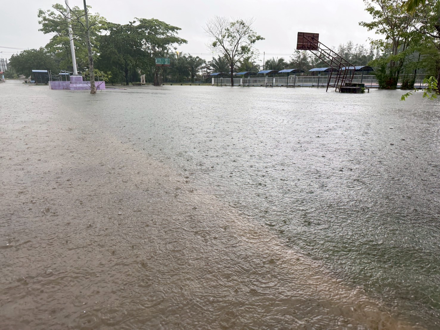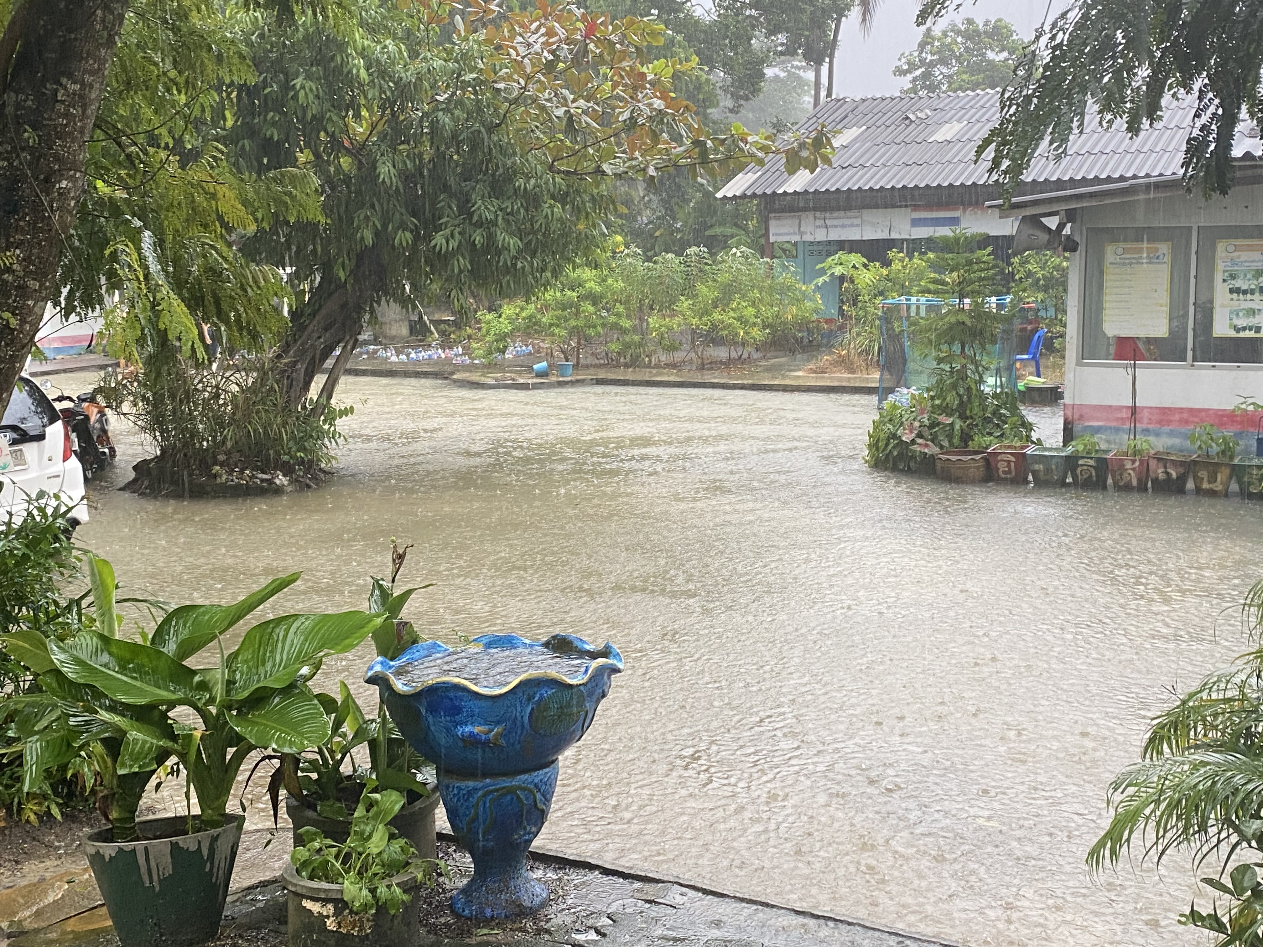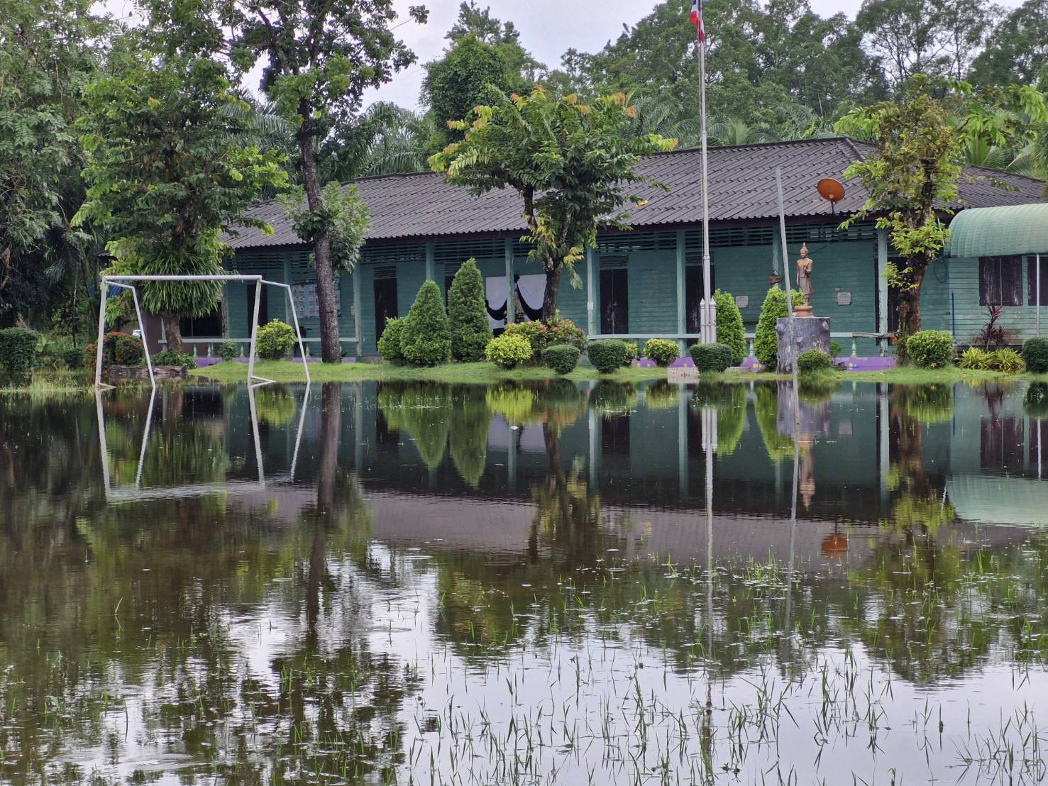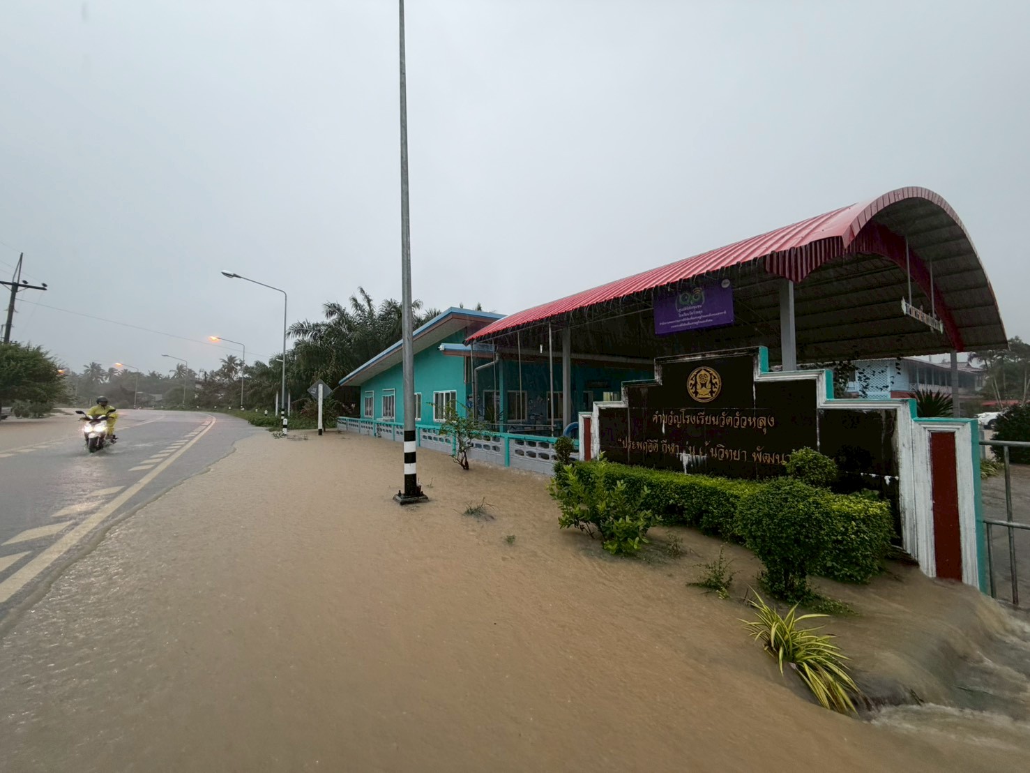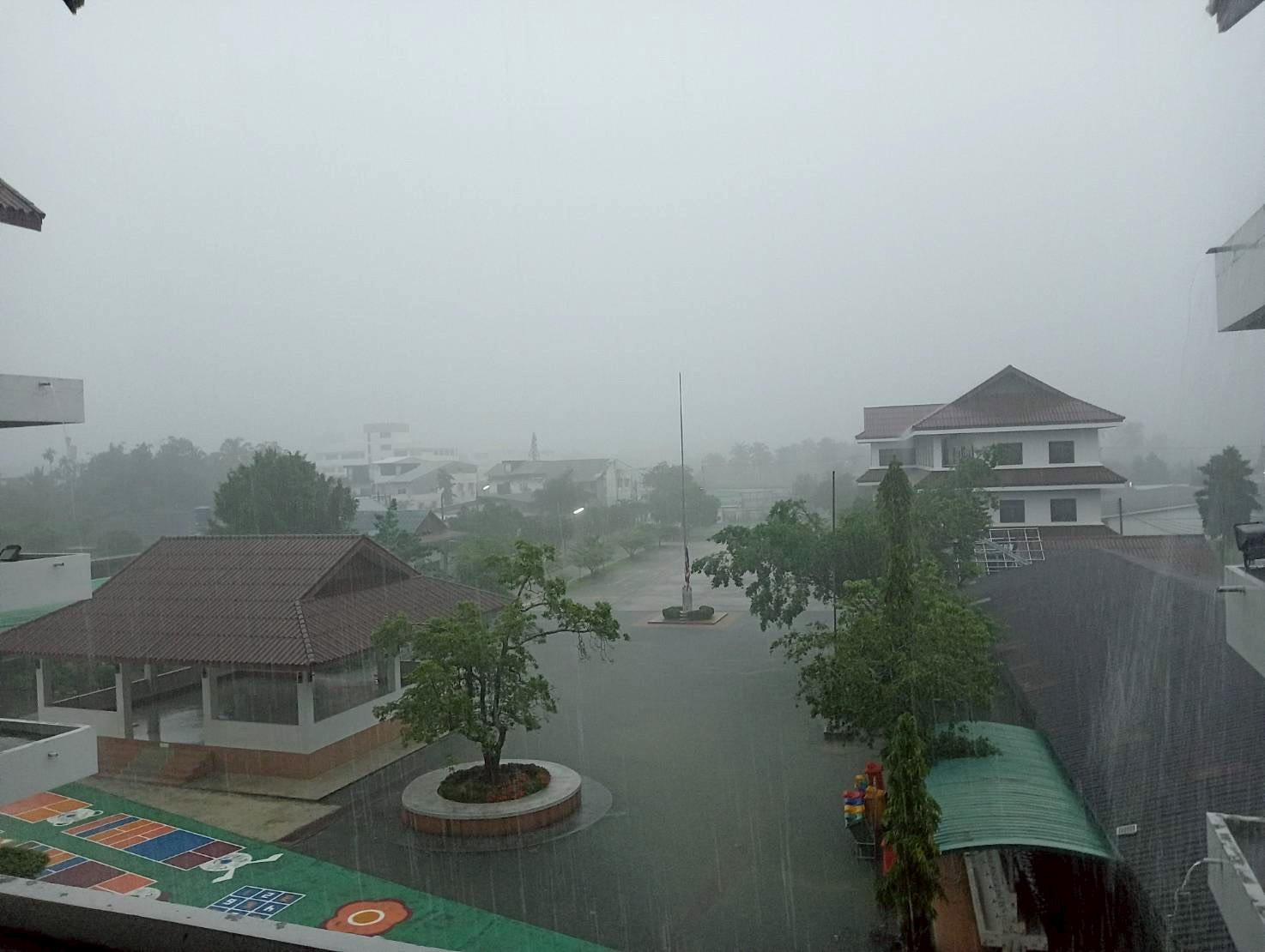 ฝนตกต่อเนื่อง มีน้ำท่วมขังบริเวณหน้าโรงเรียน อาคารเรียน น้ำเข้าห้องเรียน ห้องสมุด ห้องวิทยาศาสตร์ ห้องประชุม