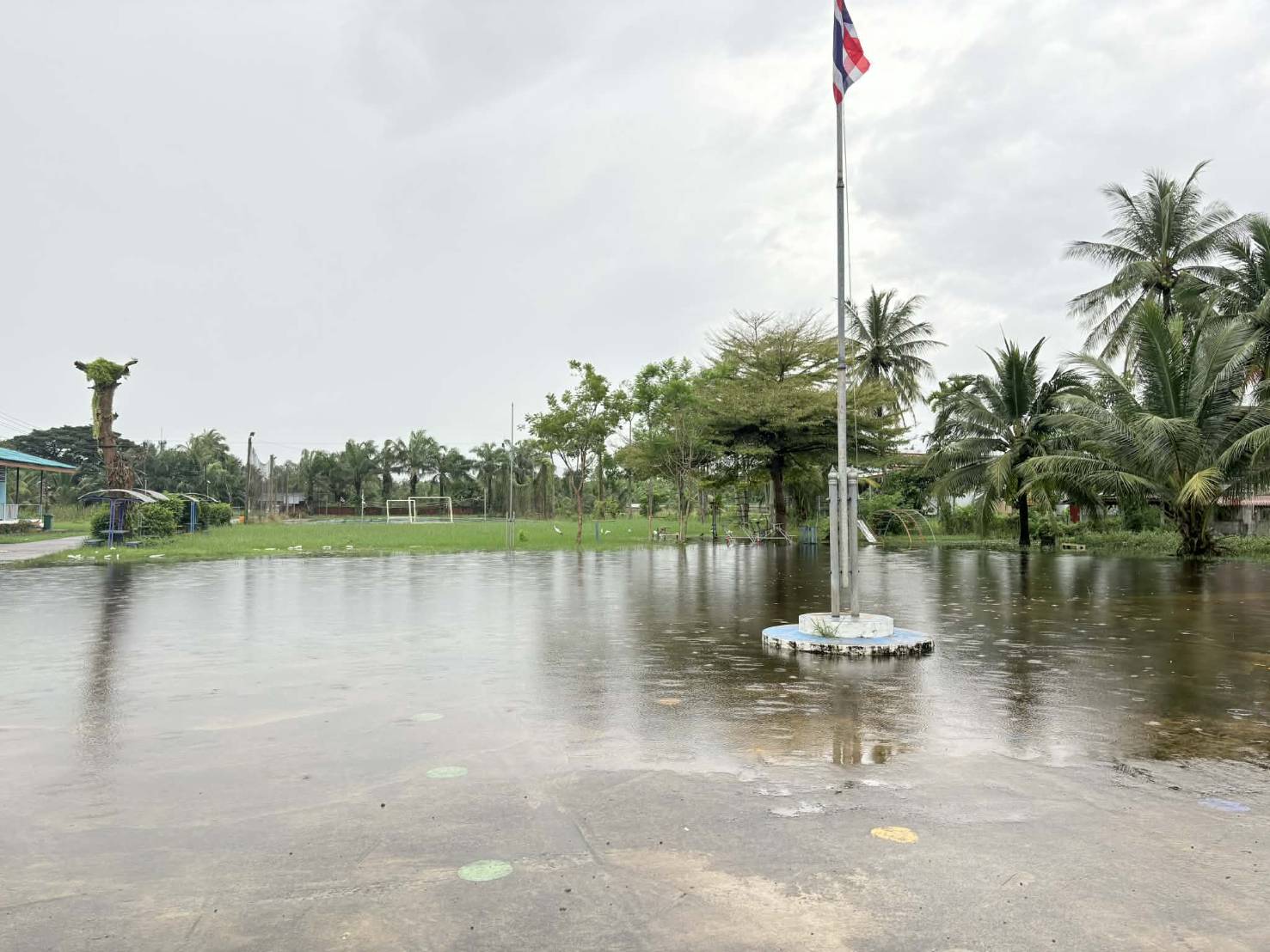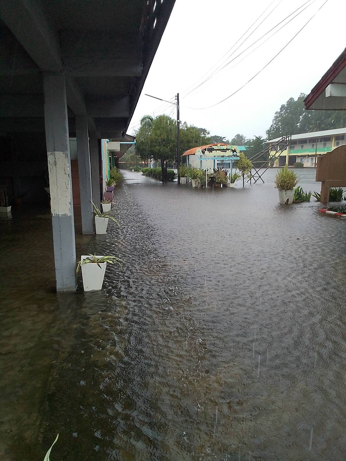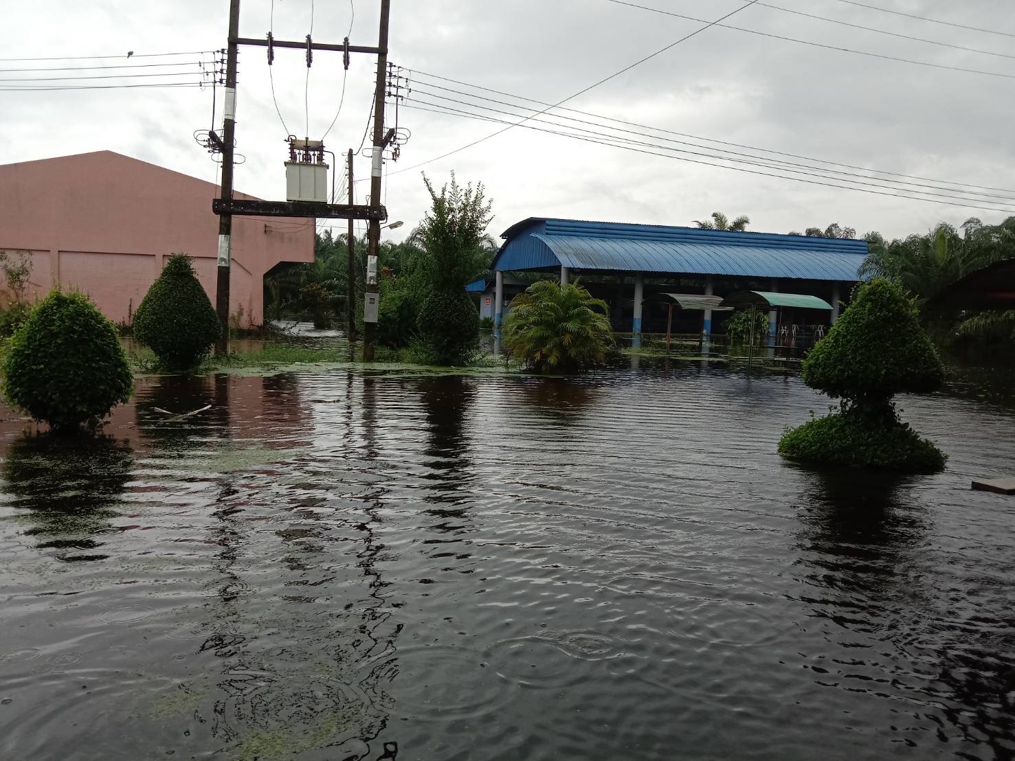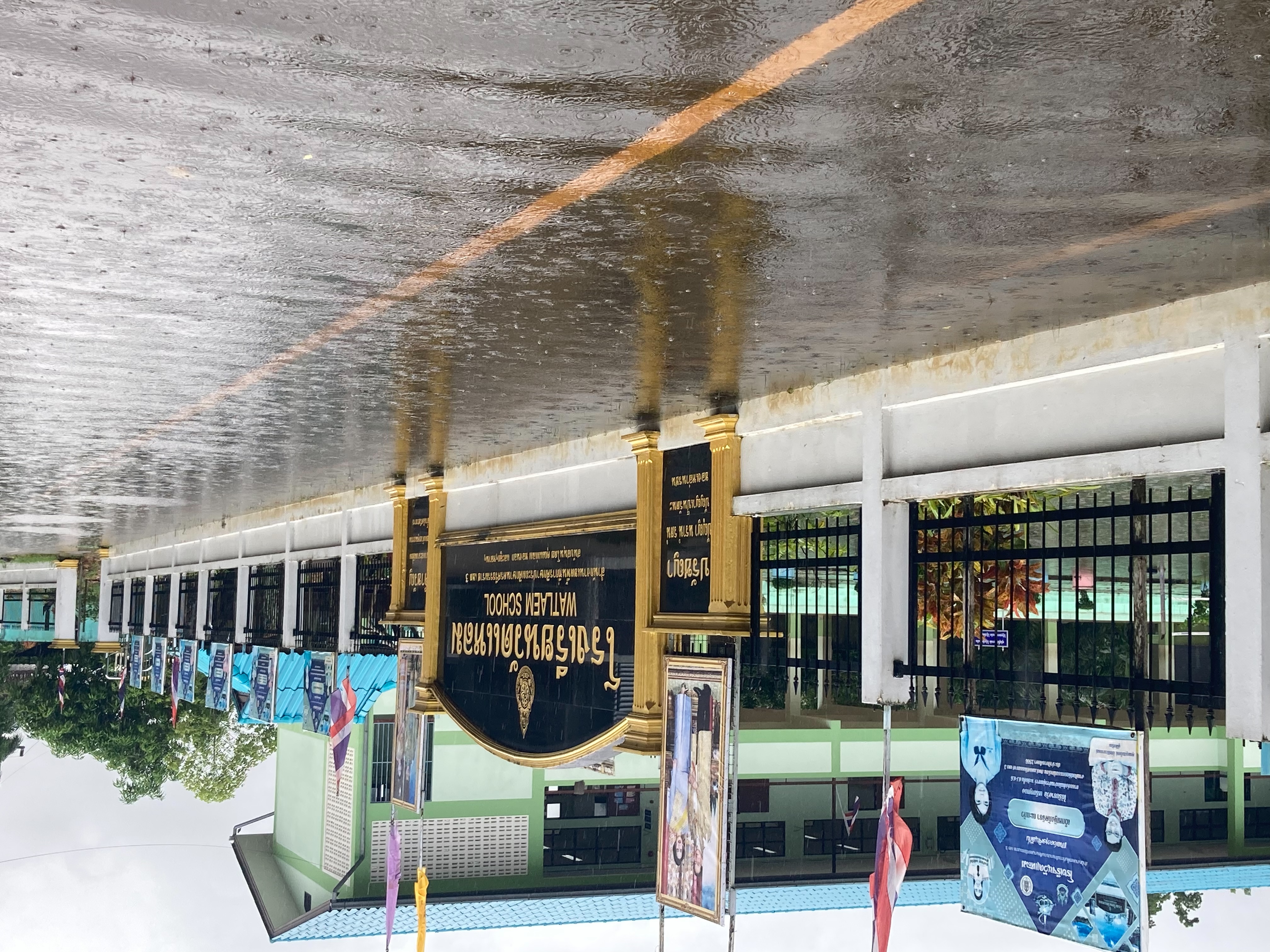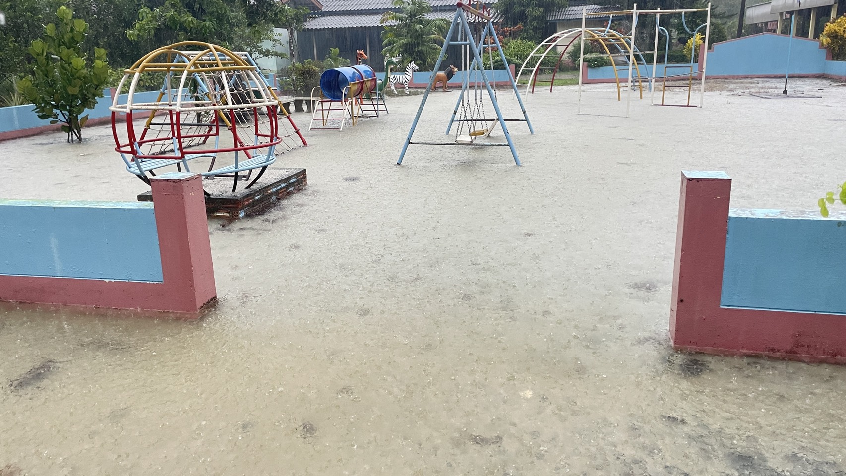 ฝนตกต่อเนื่อง มีน้ำท่วมขังบริเวณหน้าโรงเรียน อาคารเรียน น้ำเข้าห้องเรียน ห้องสมุด ห้องวิทยาศาสตร์ ห้องประชุม