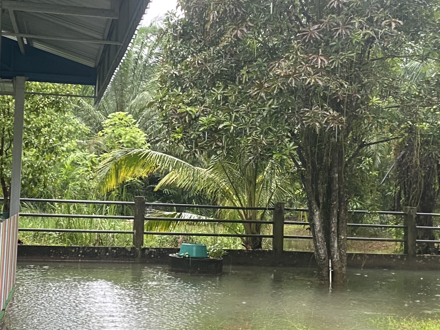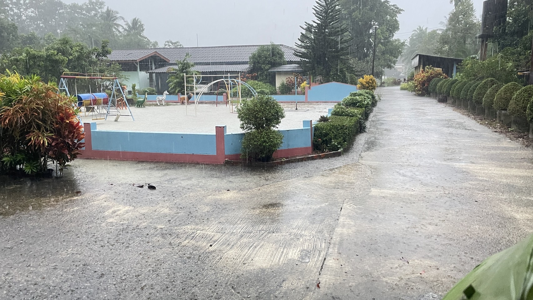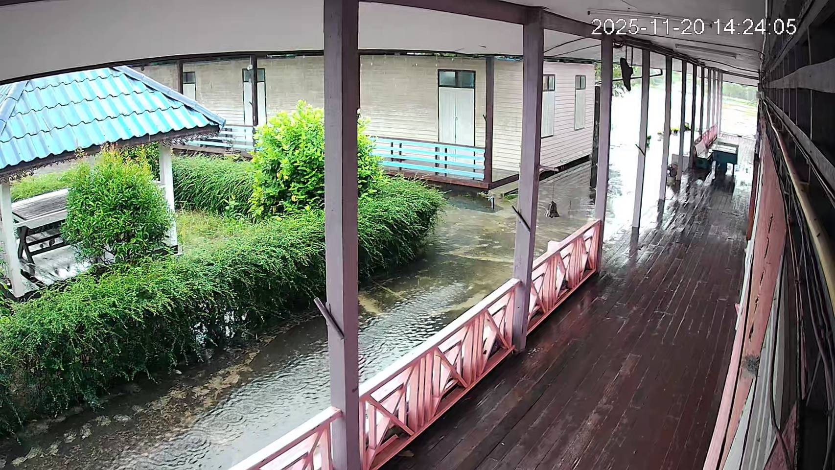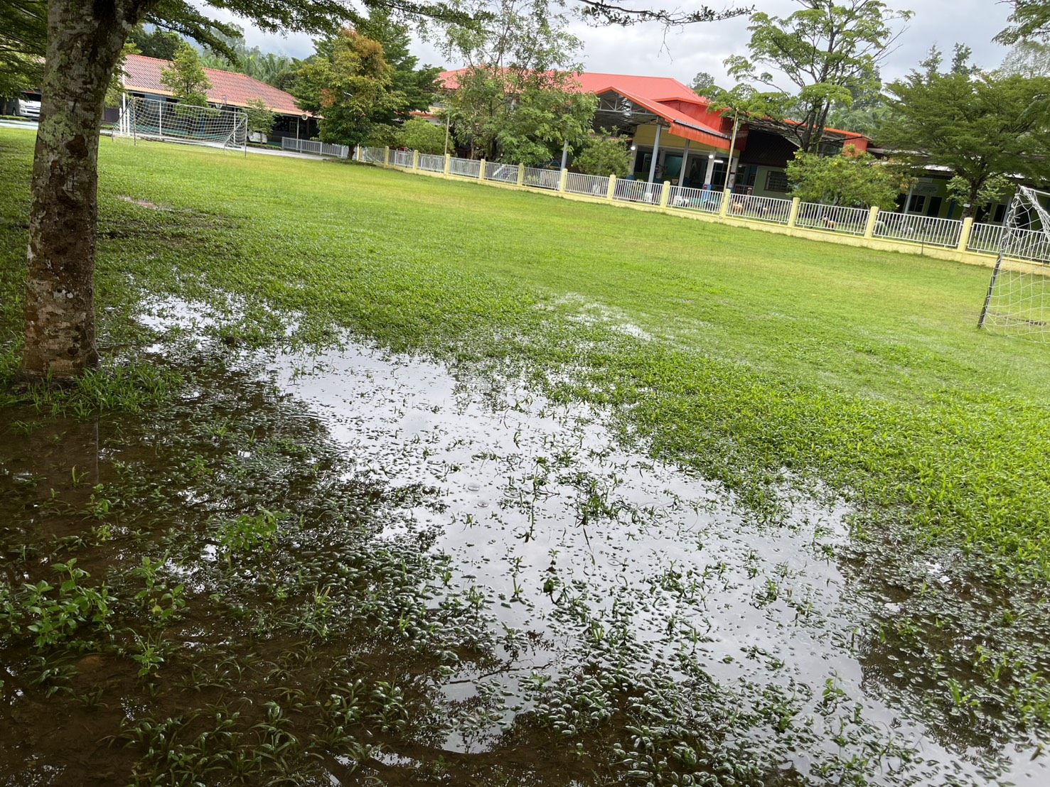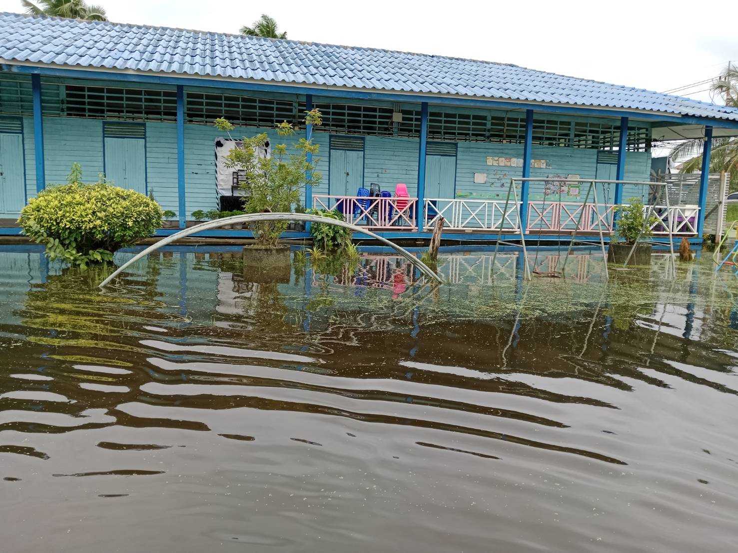 ฝนตกต่อเนื่อง มีน้ำท่วมขังบริเวณหน้าโรงเรียน อาคารเรียน น้ำเข้าห้องเรียน ห้องสมุด ห้องวิทยาศาสตร์ ห้องประชุม