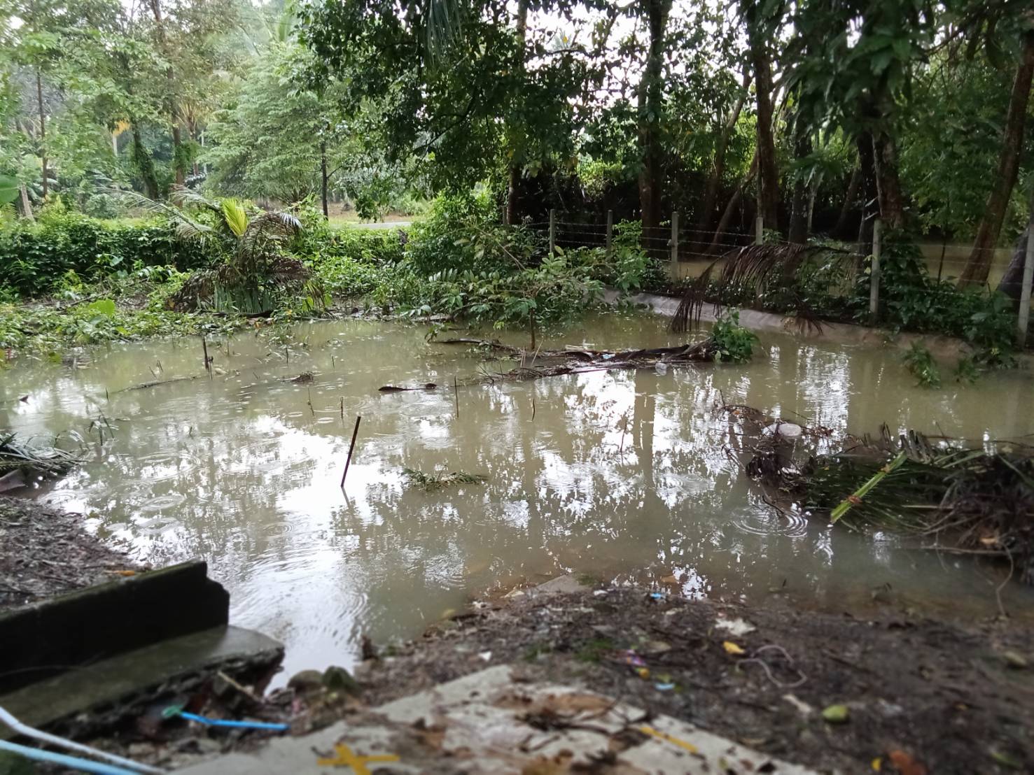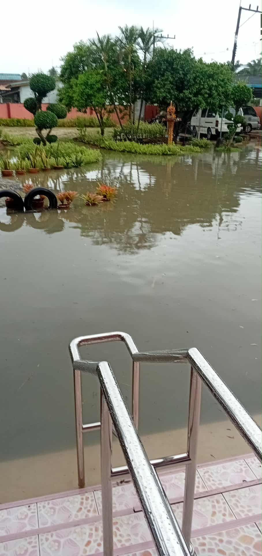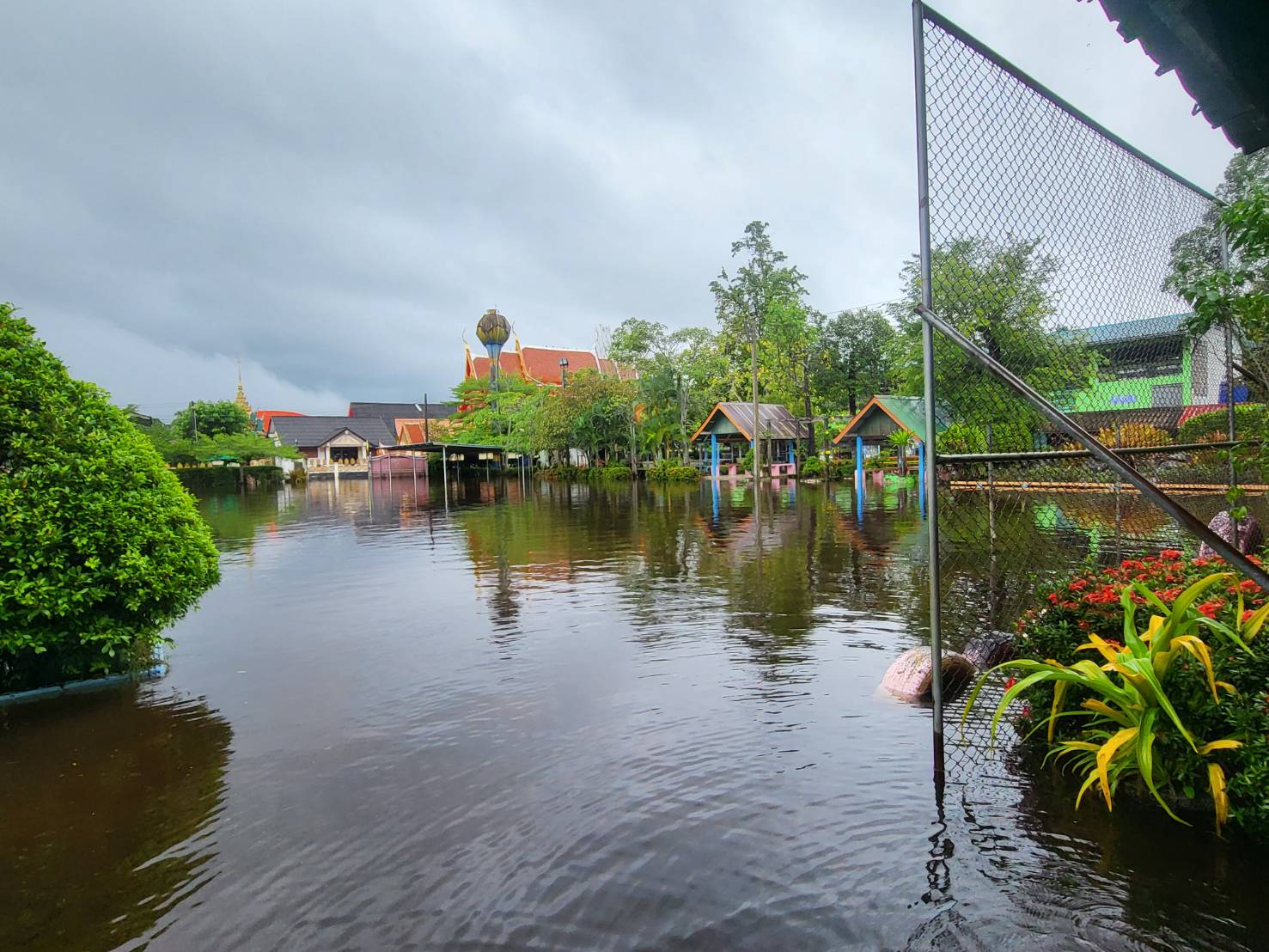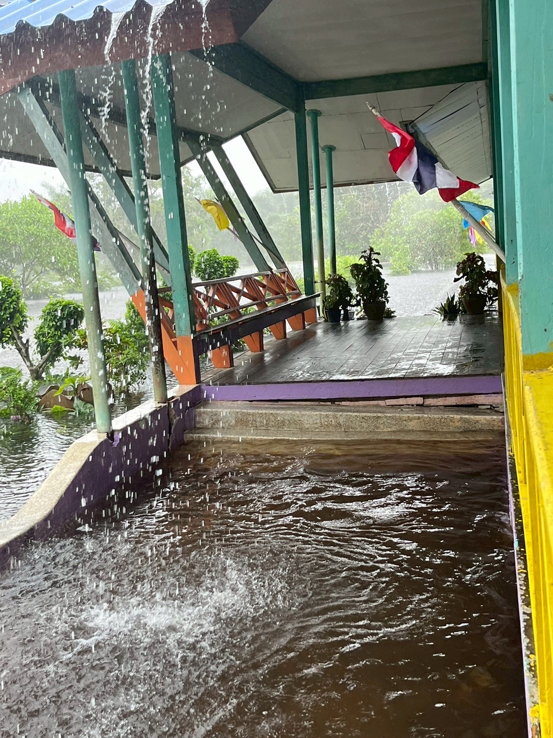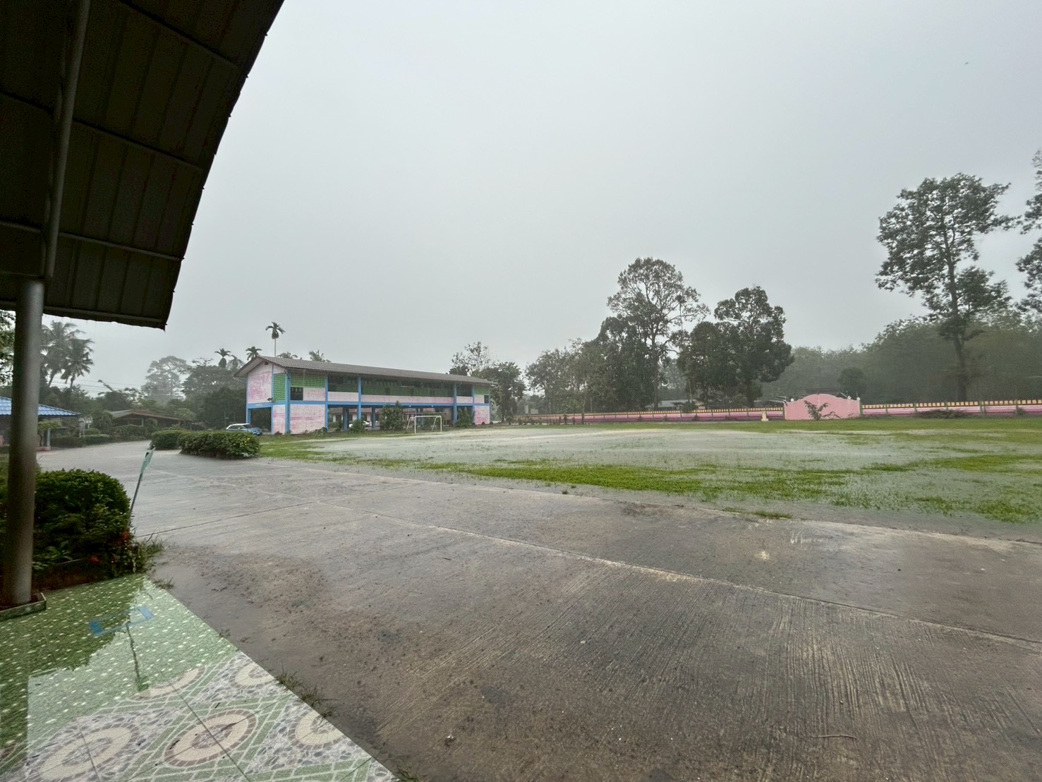 ฝนตกต่อเนื่อง มีน้ำท่วมขังบริเวณหน้าโรงเรียน อาคารเรียน น้ำเข้าห้องเรียน ห้องสมุด ห้องวิทยาศาสตร์ ห้องประชุม