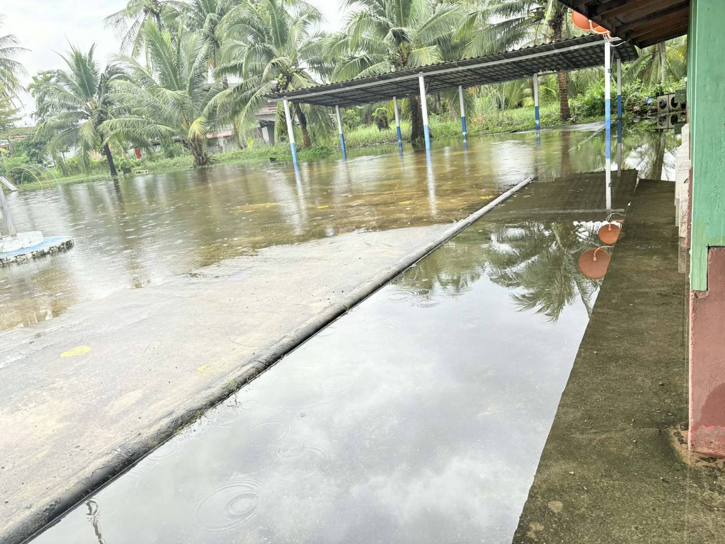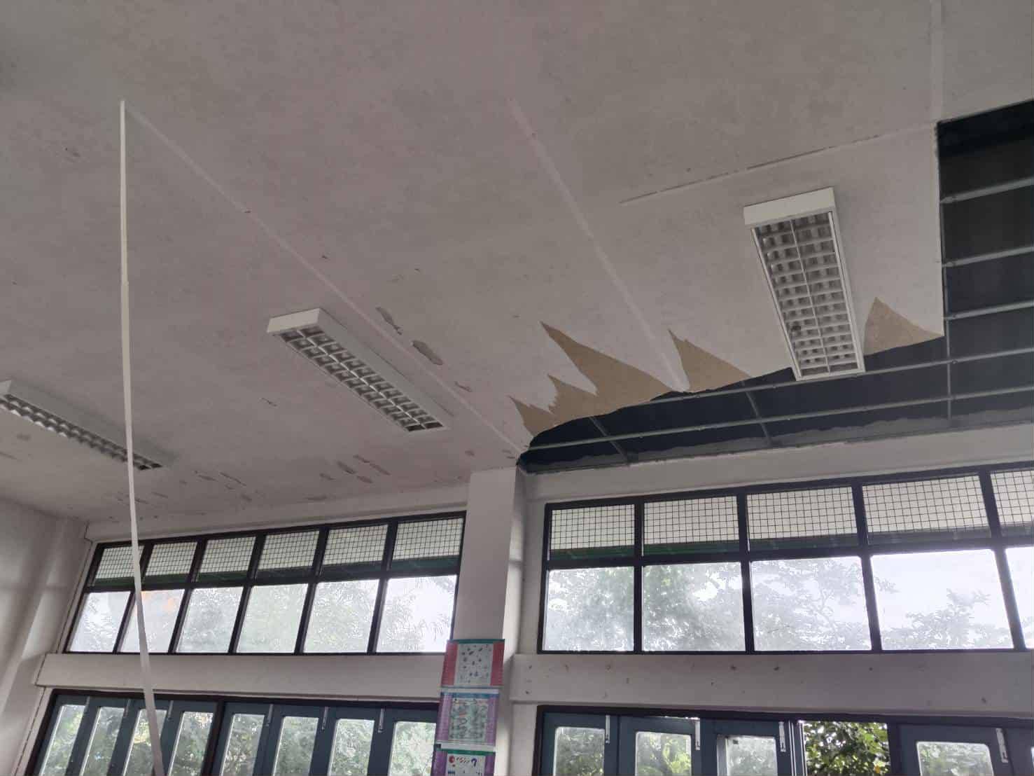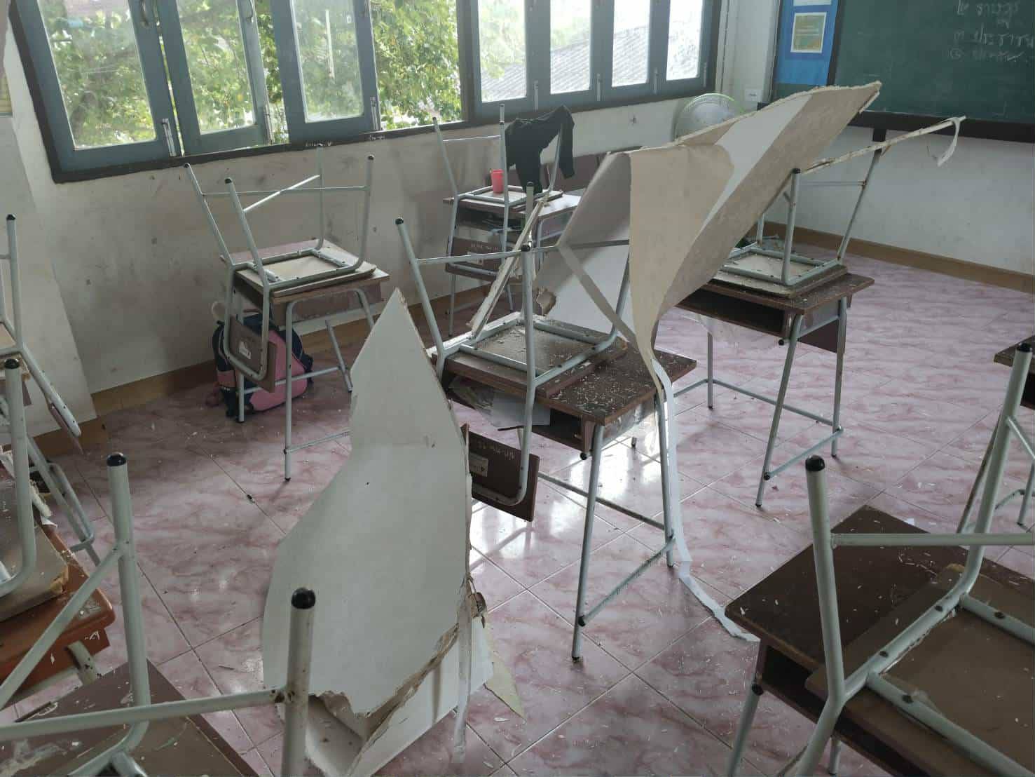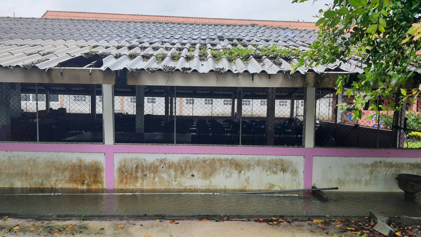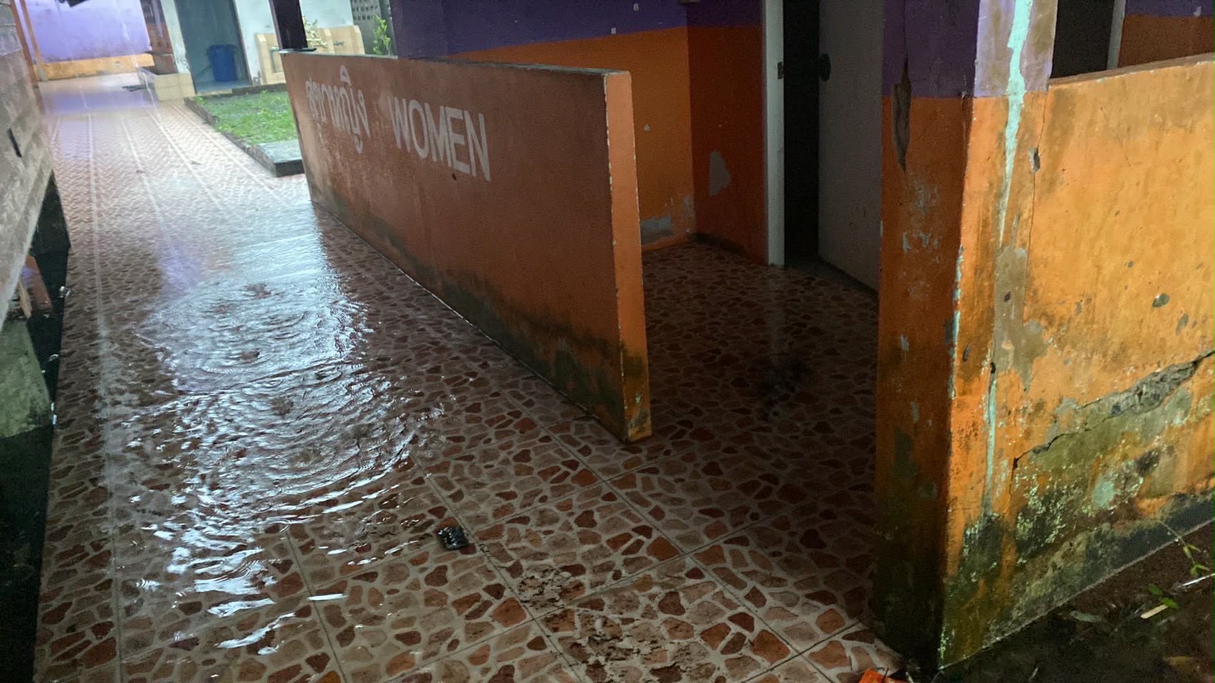 **ทั้งนี้ ฝนที่ตกหนักและลมพัดแรงยังส่งผลให้หลังคาโรงอาหารได้รับความเสียหายเปิดออก และพื้นอาคารเกิดการทรุดตัวเป็นบริเวณกว้าง