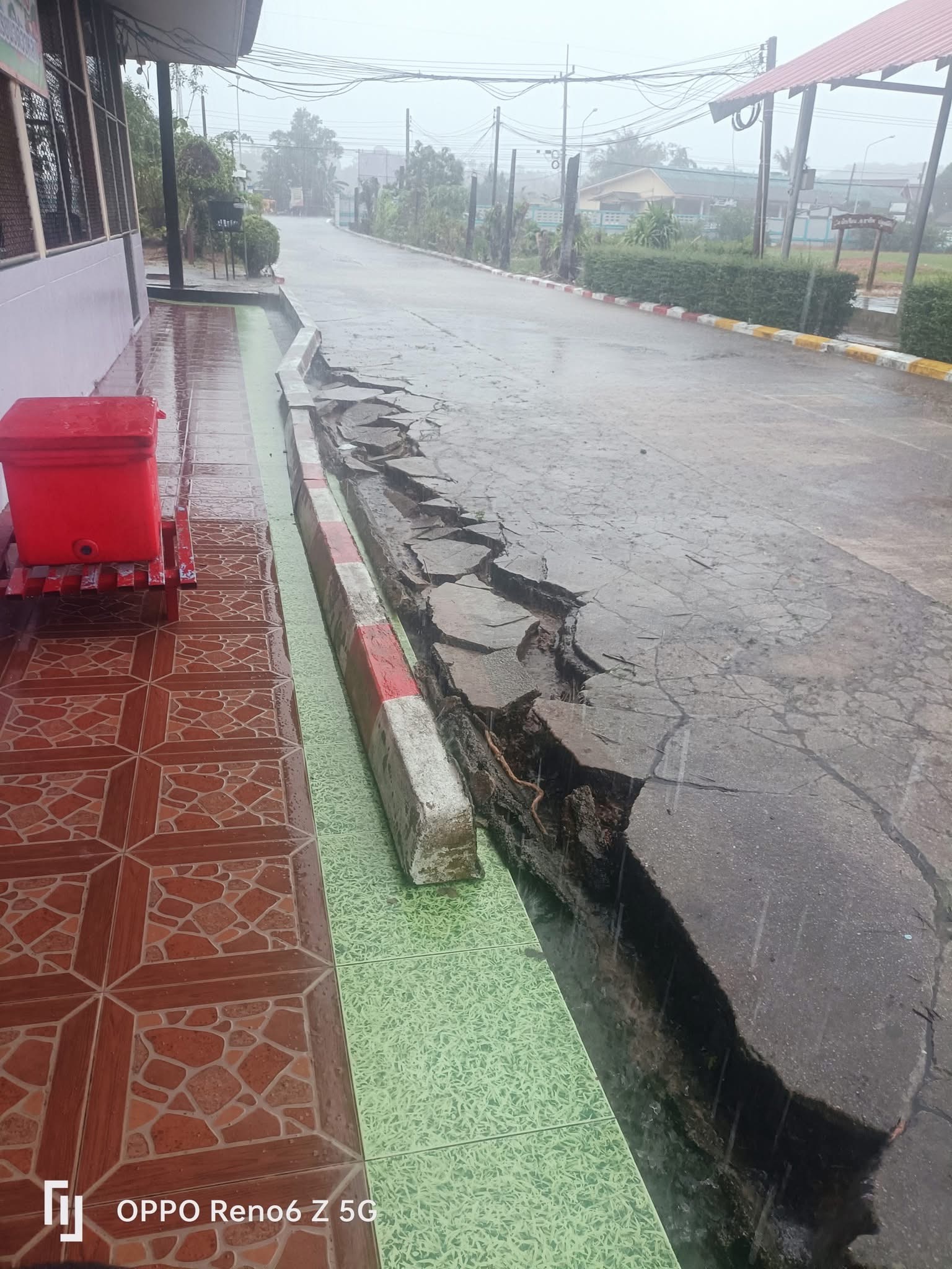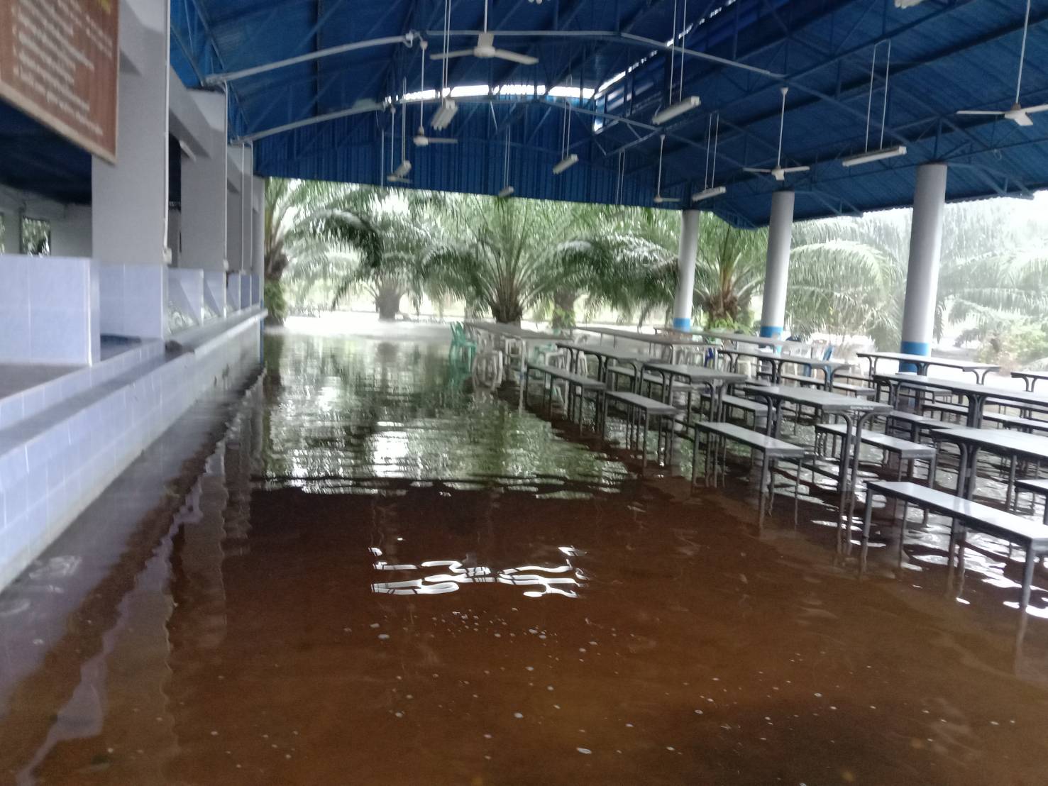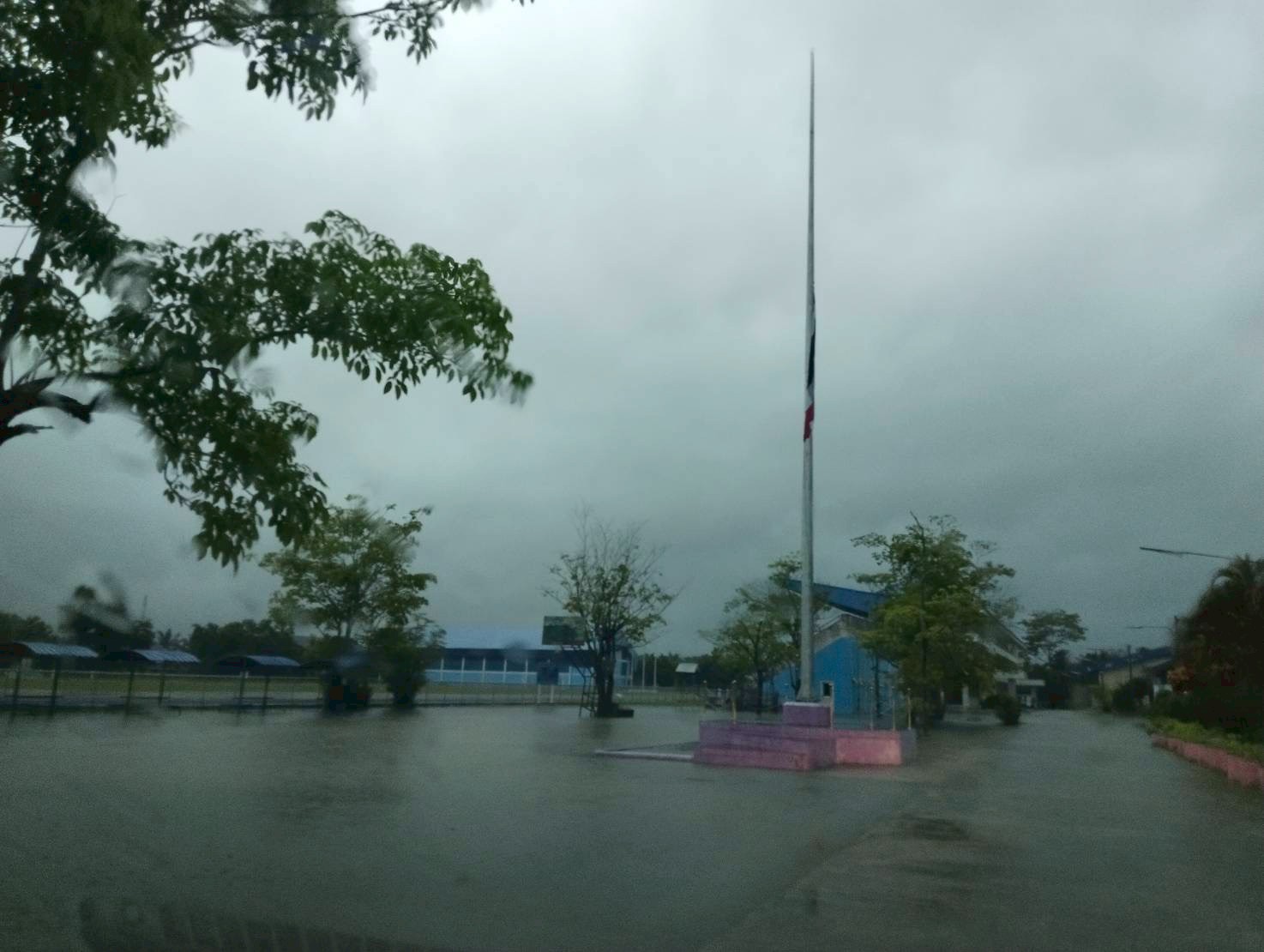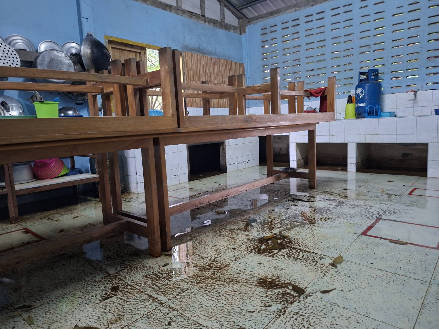 **ทั้งนี้ ฝนที่ตกหนักและลมพัดแรงยังส่งผลให้หลังคาโรงอาหารได้รับความเสียหายเปิดออก และพื้นอาคารเกิดการทรุดตัวเป็นบริเวณกว้าง