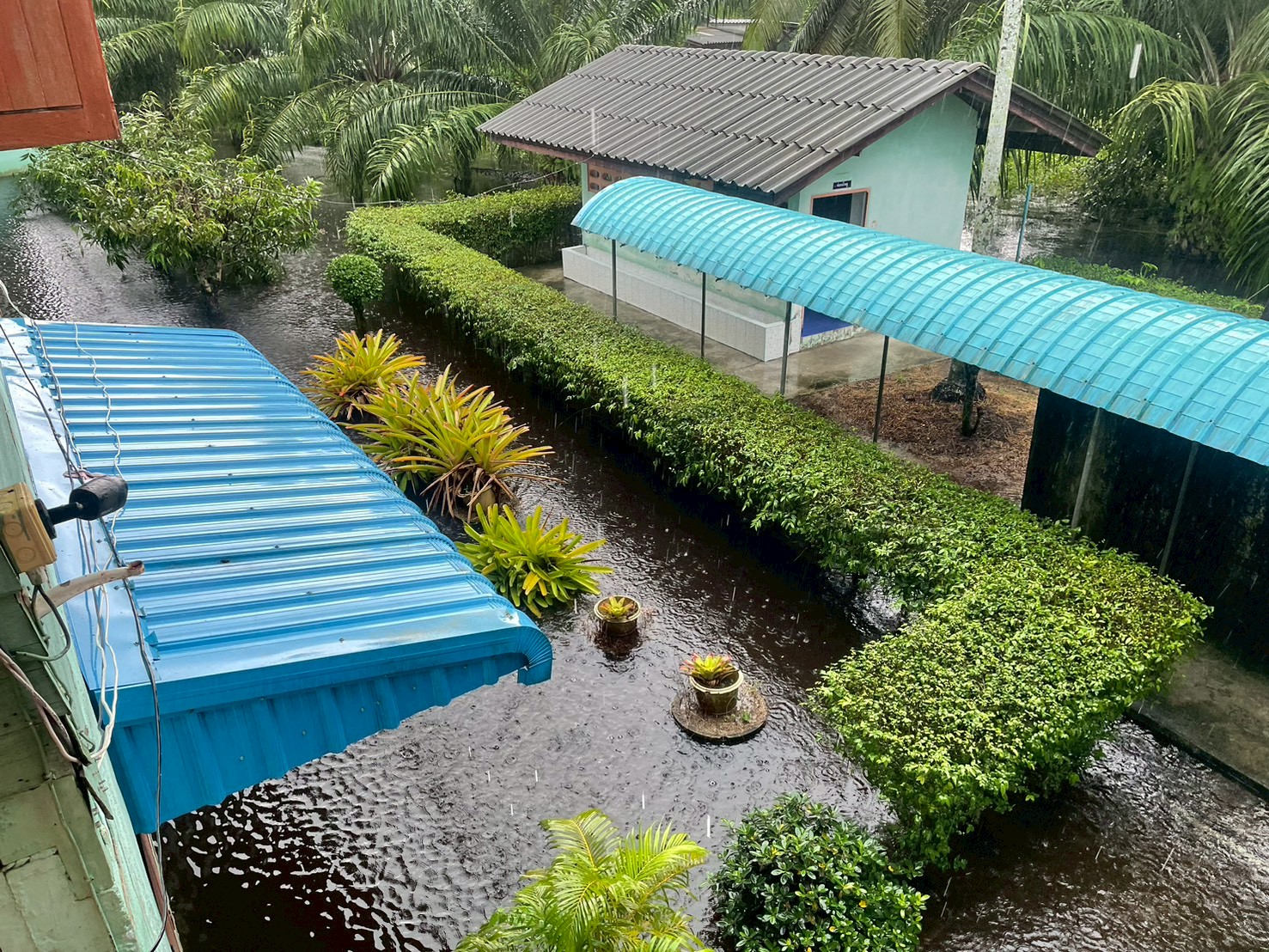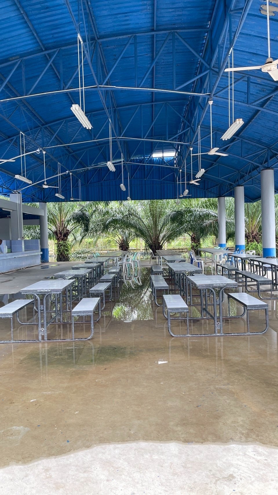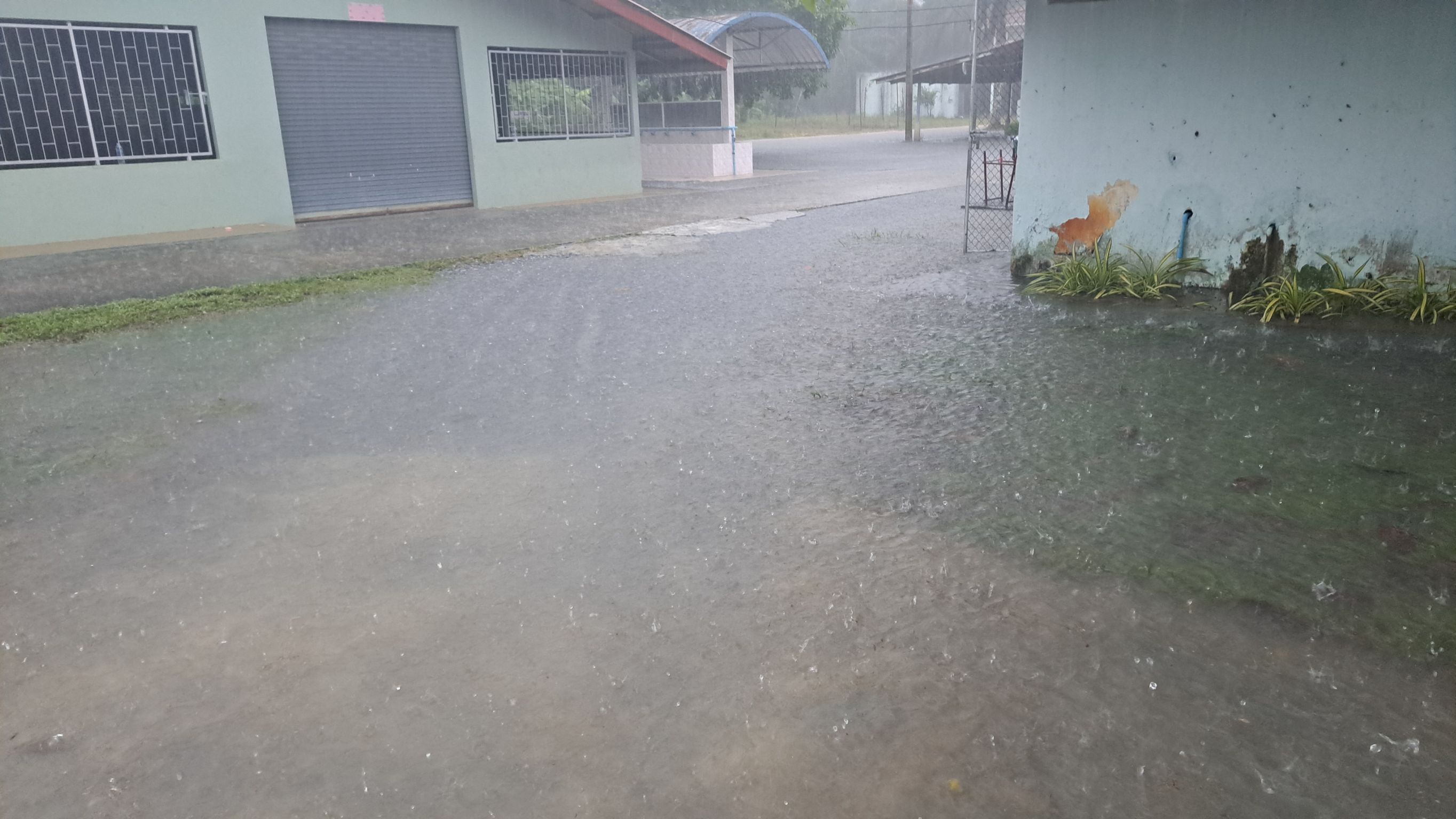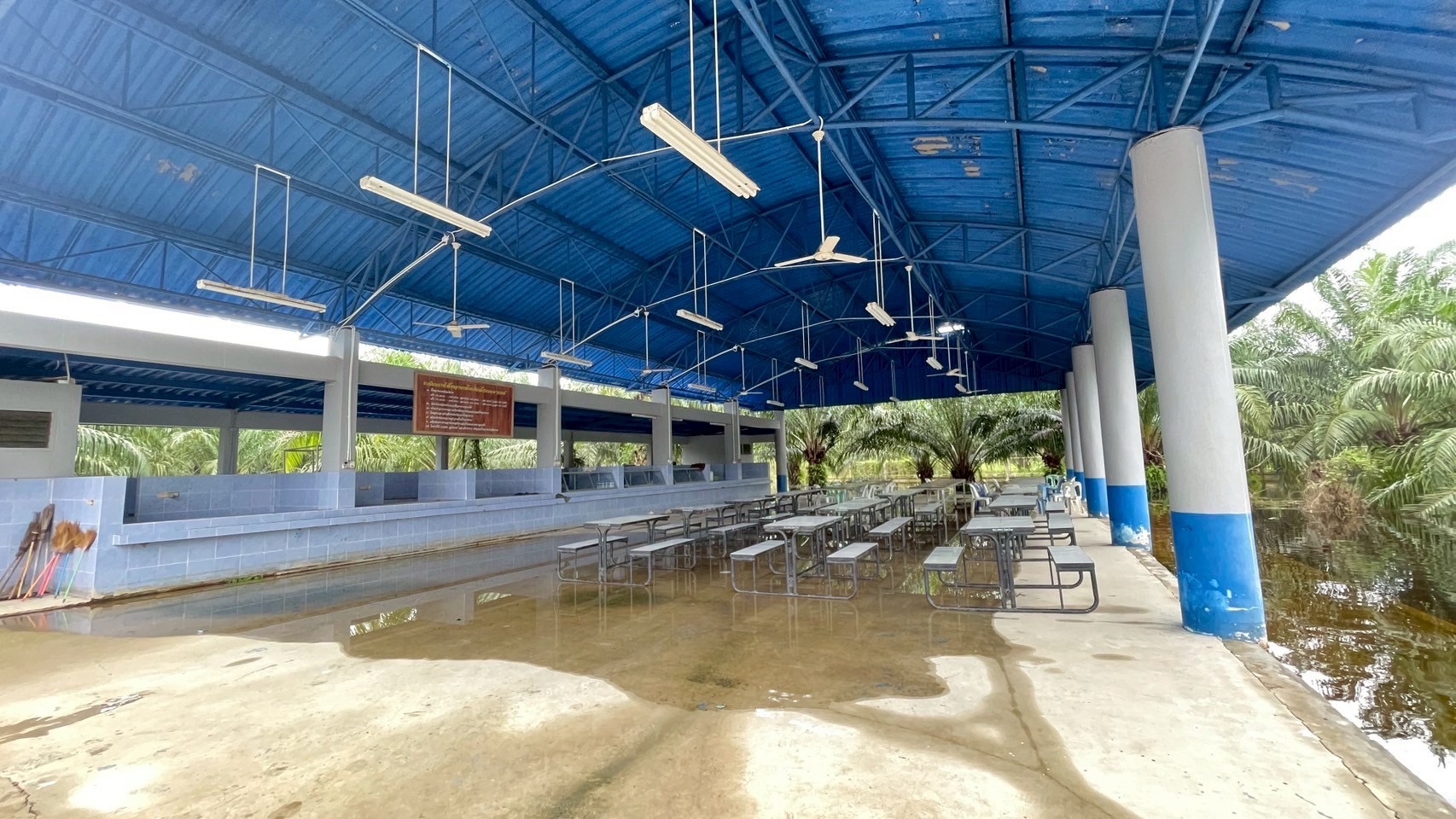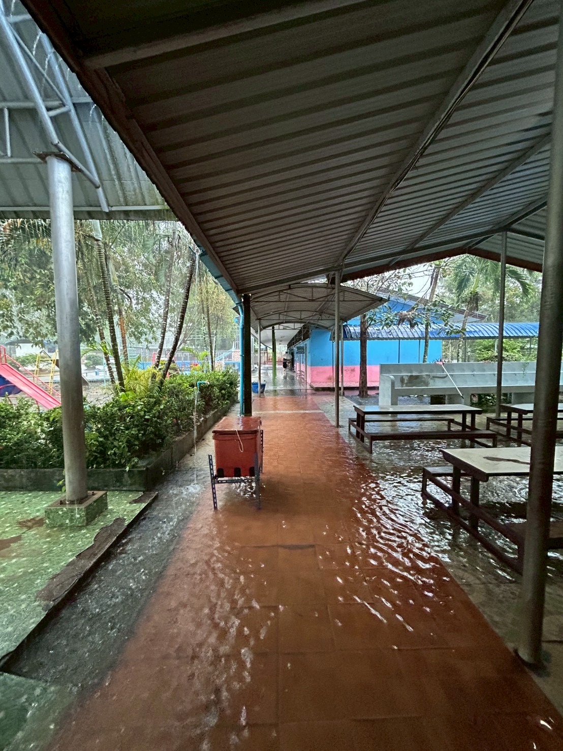 **ทั้งนี้ ฝนที่ตกหนักและลมพัดแรงยังส่งผลให้หลังคาโรงอาหารได้รับความเสียหายเปิดออก และพื้นอาคารเกิดการทรุดตัวเป็นบริเวณกว้าง