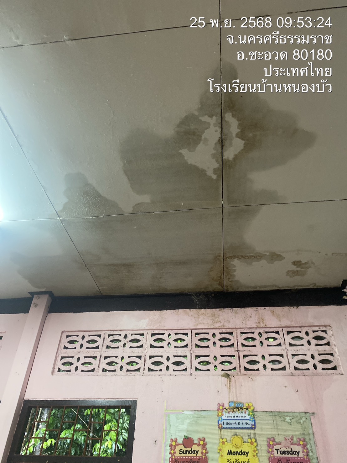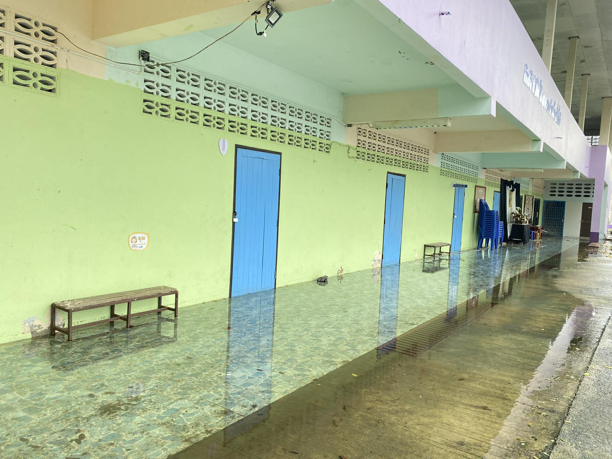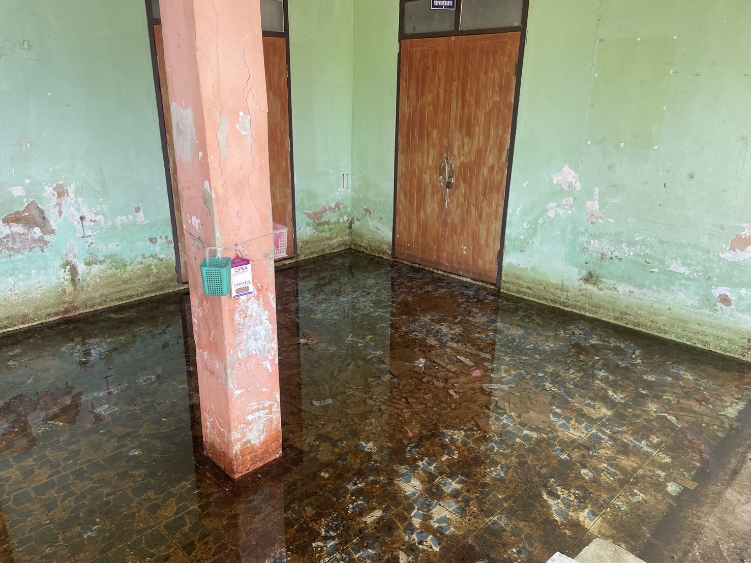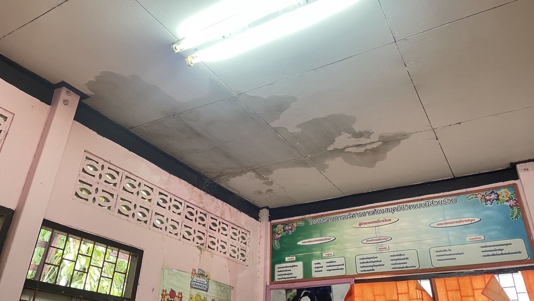 ภาพความเสียหายจากฝนตกหนักเป็นเวลานาน ฝนสาด ทำให้ห้องเรียนมีน้ำขัง เพดานมีรอยหลุดลอก