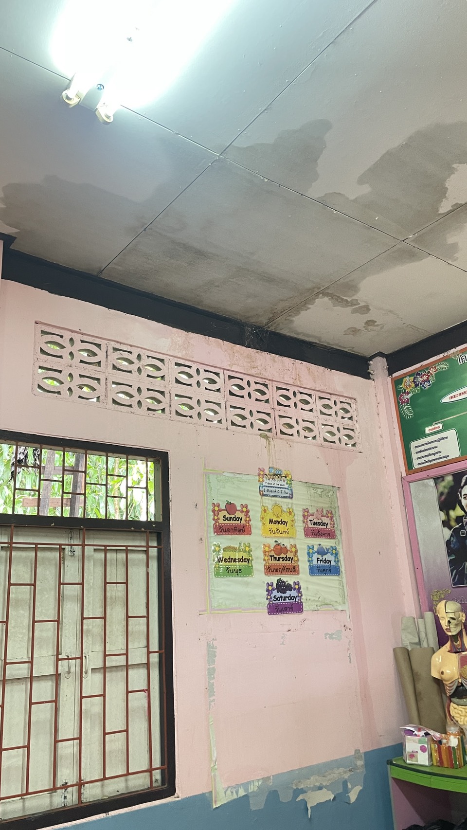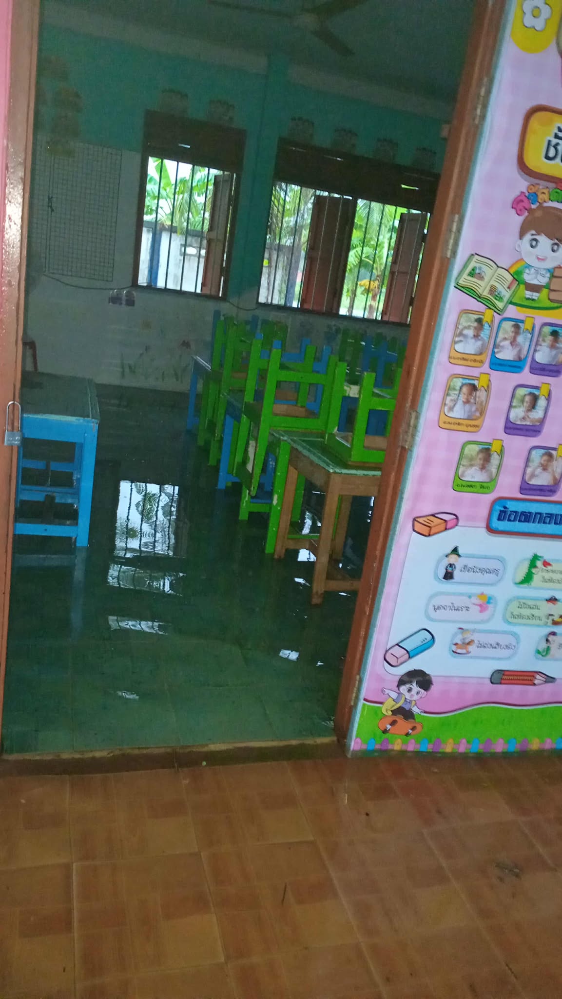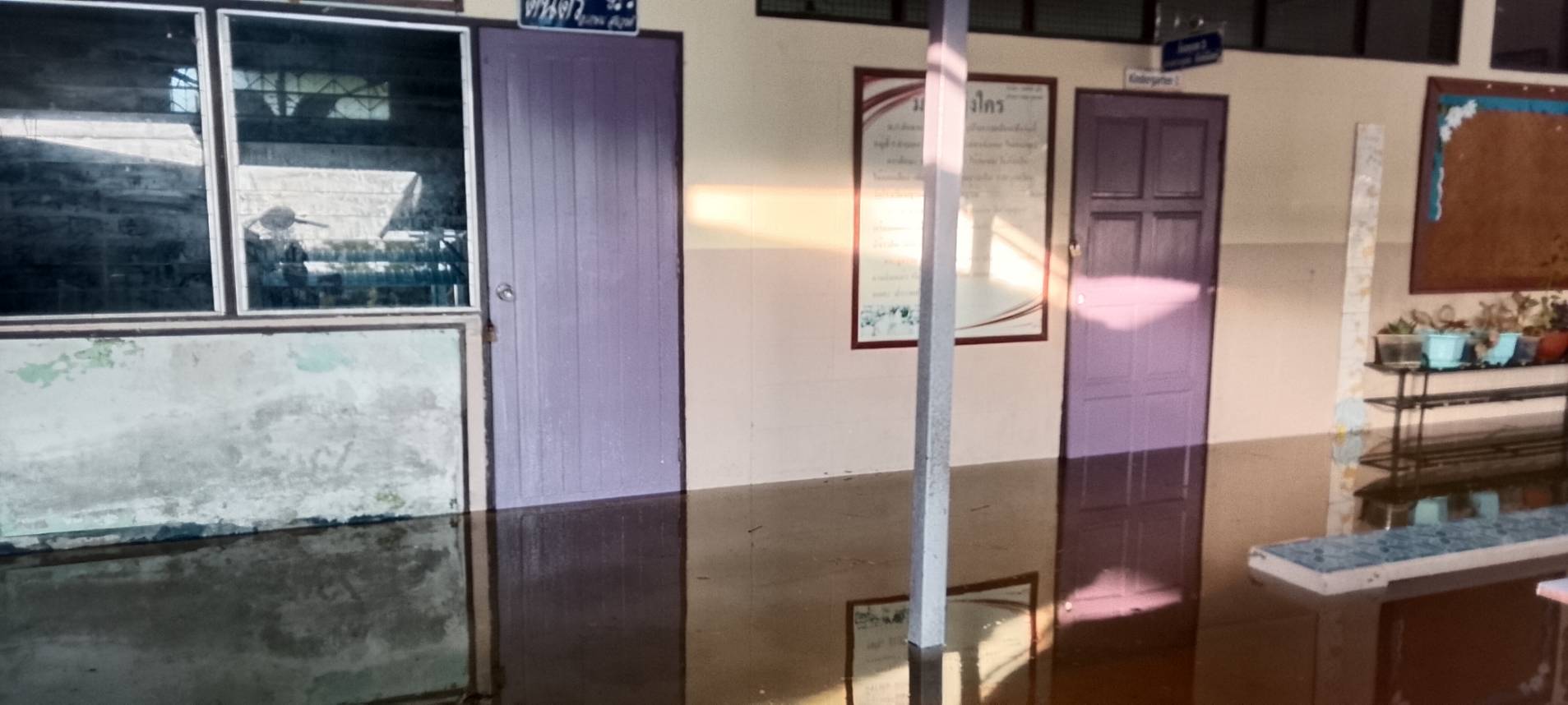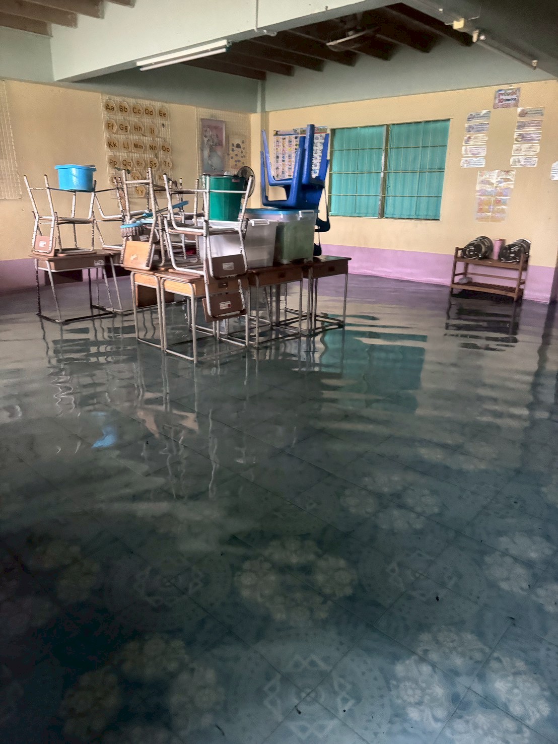 ภาพความเสียหายจากฝนตกหนักเป็นเวลานาน ฝนสาด ทำให้ห้องเรียนมีน้ำขัง เพดานมีรอยหลุดลอก