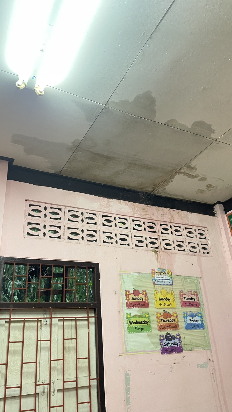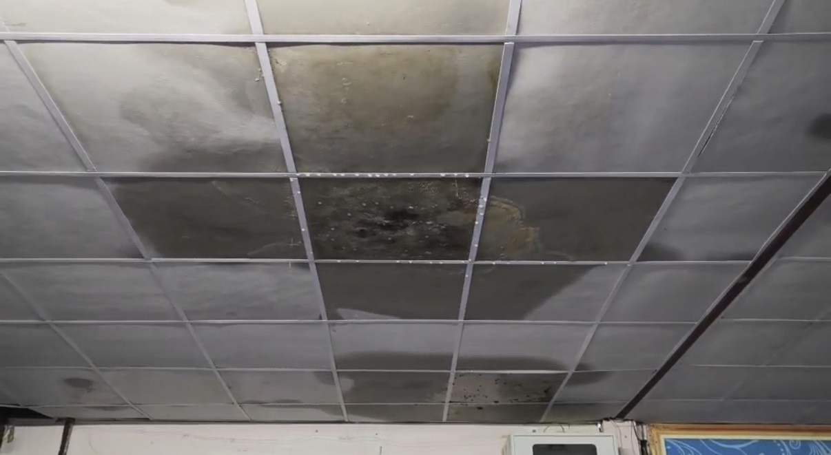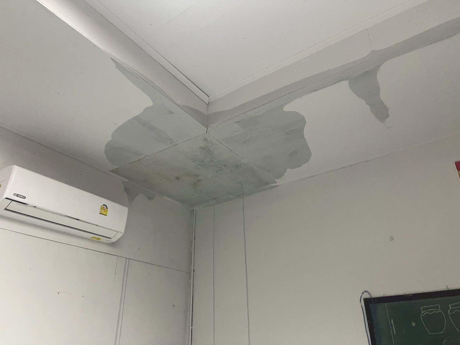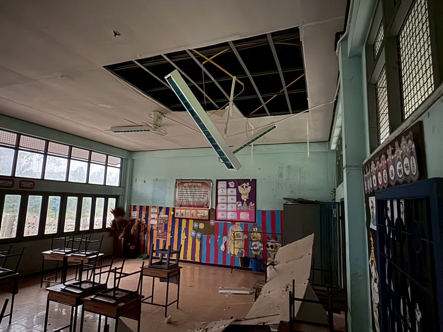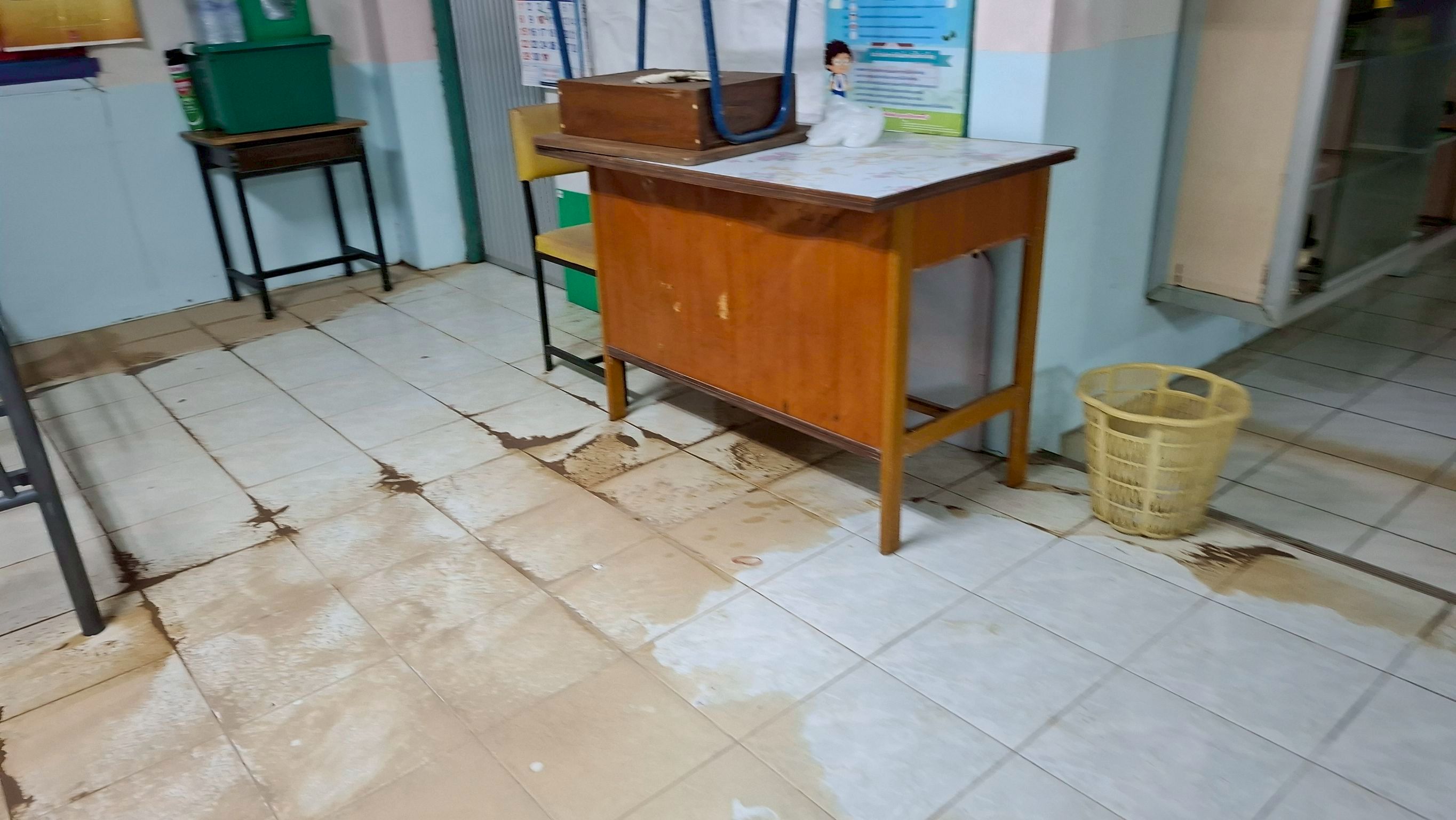 ภาพความเสียหายจากฝนตกหนักเป็นเวลานาน ฝนสาด ทำให้ห้องเรียนมีน้ำขัง เพดานมีรอยหลุดลอก