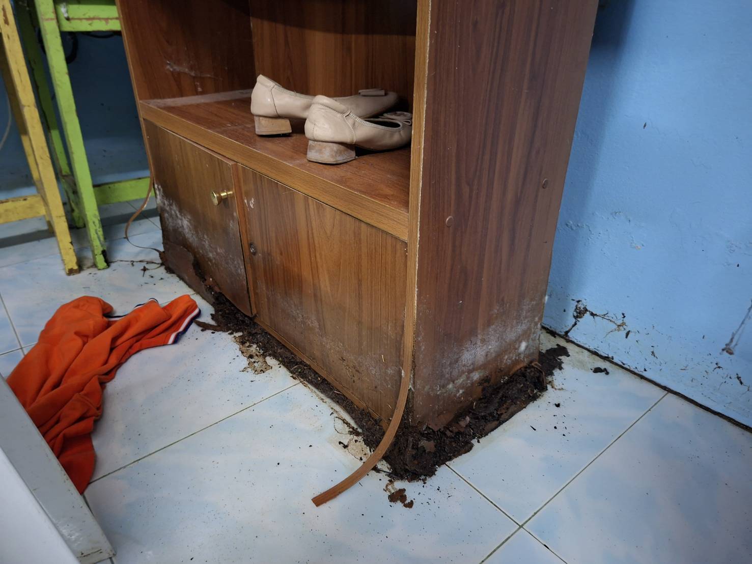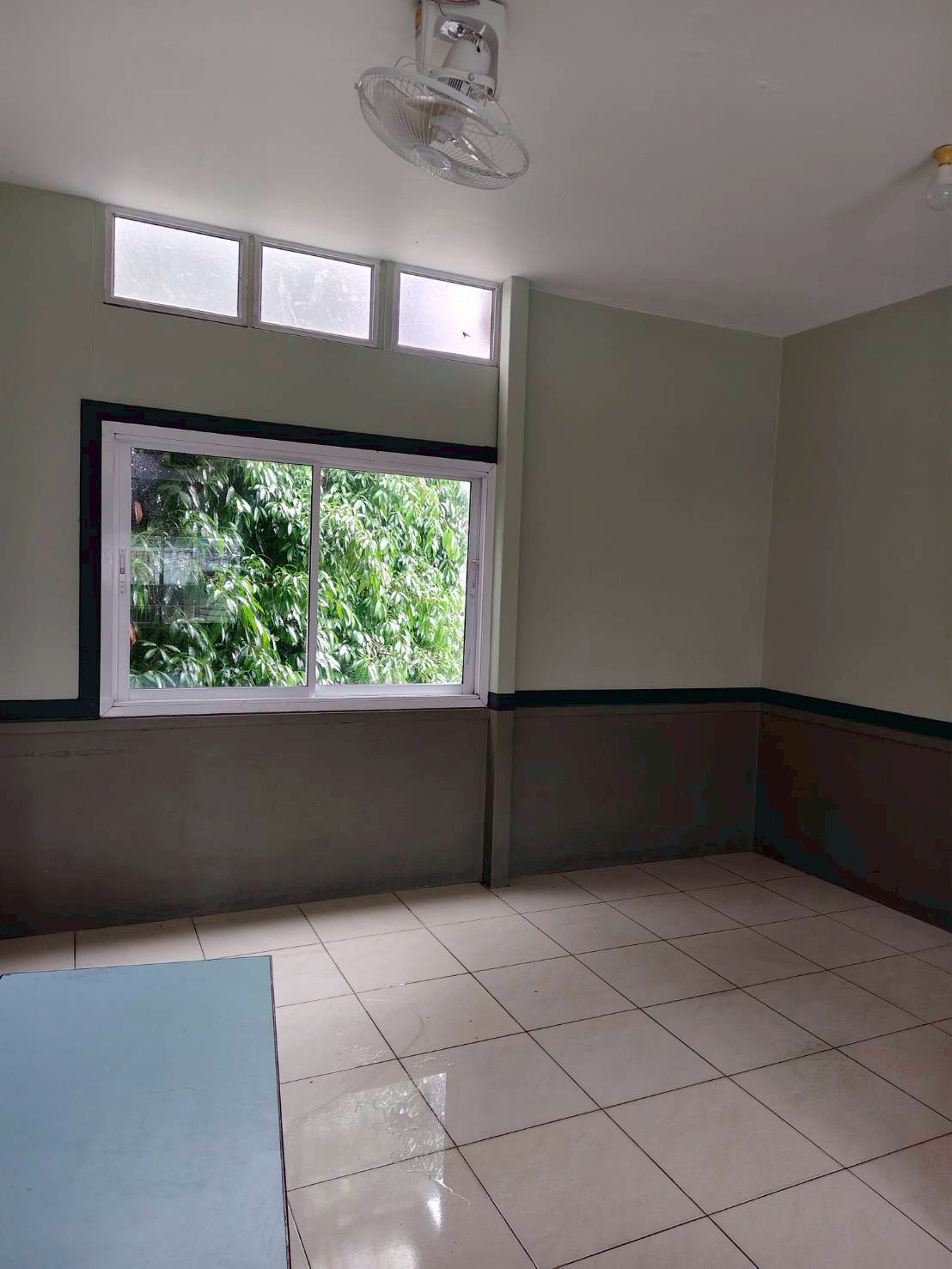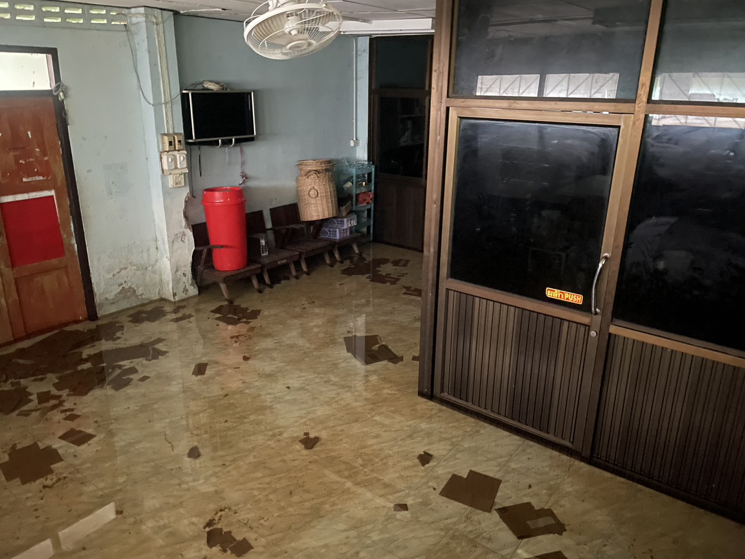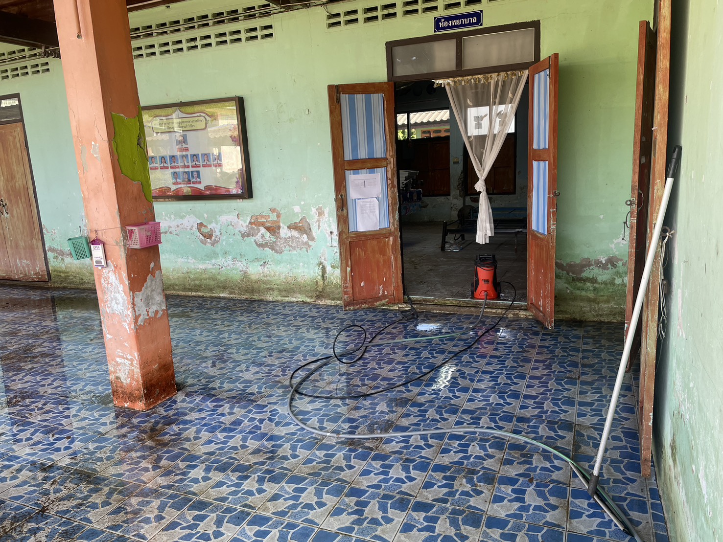 ภาพความเสียหายจากฝนตกหนักเป็นเวลานาน ฝนสาด ทำให้ห้องเรียนมีน้ำขัง เพดานมีรอยหลุดลอก