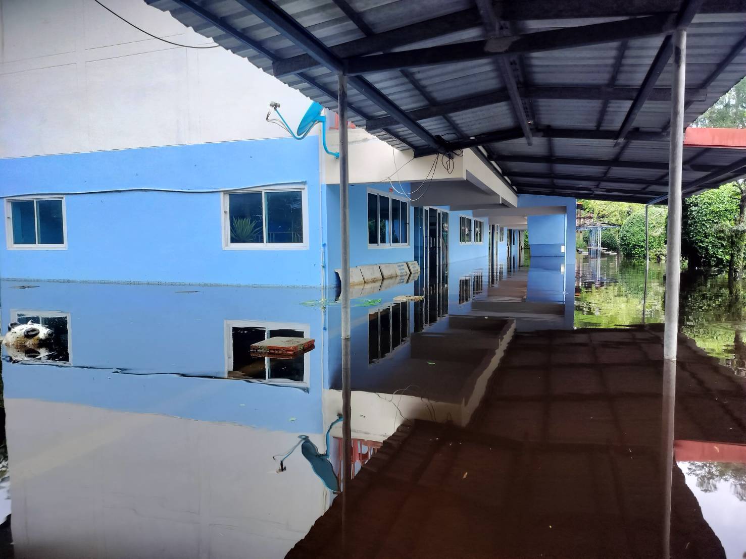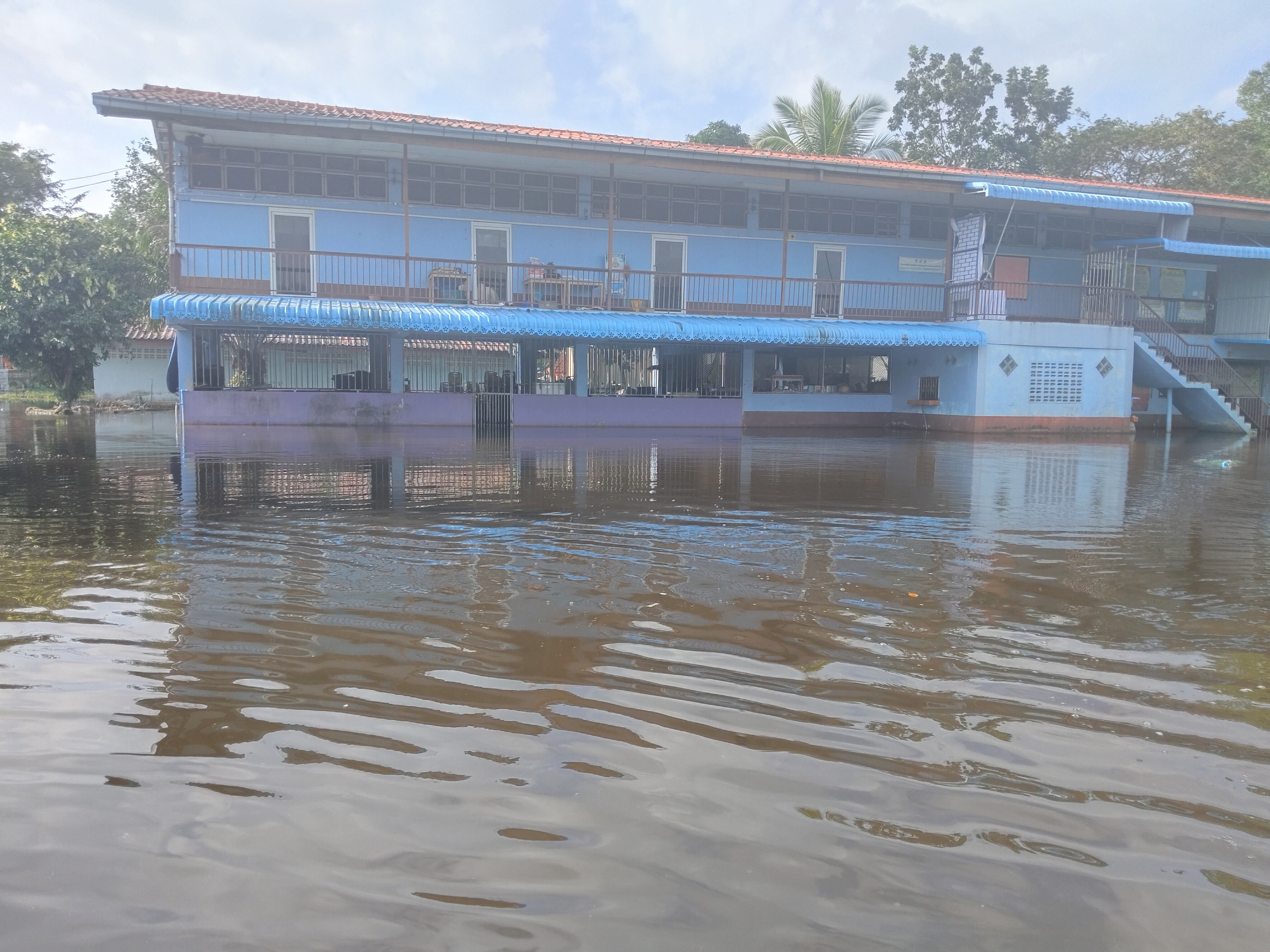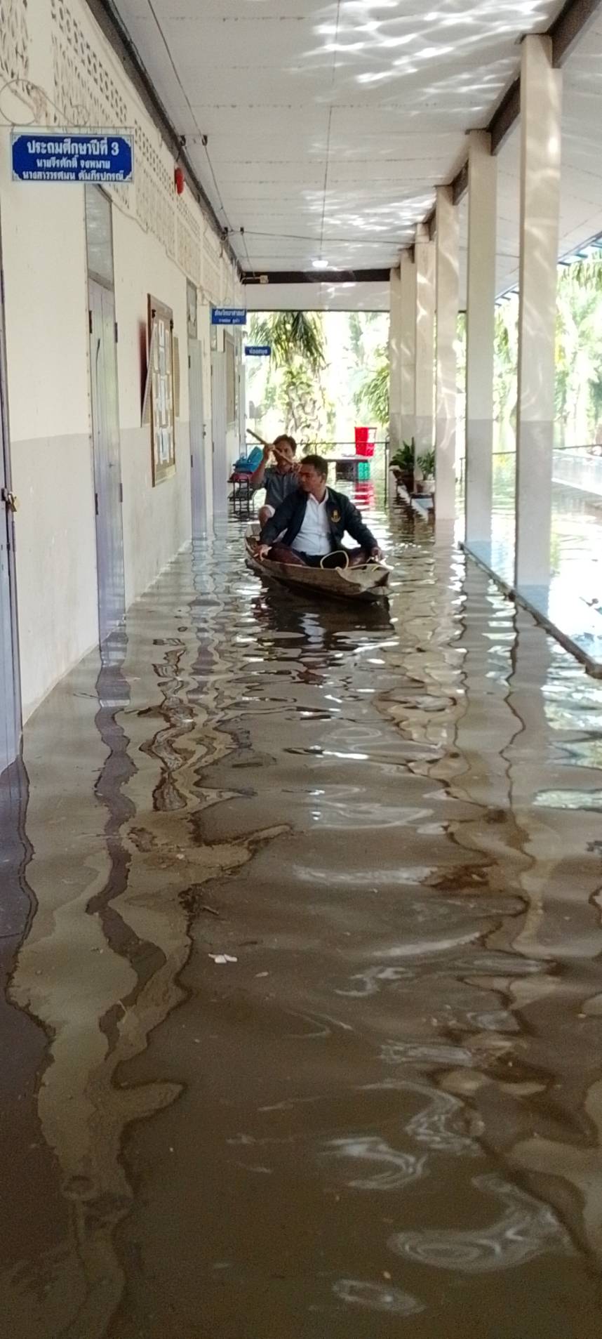 | สถานการณ์ :- น้ำท่วมจังสูงขึ้นเรื่อย ๆ ในพื้นที่หลังอาคารอเนกประสงค์ซึ่งติดกับลำคลองสูงกว่า50เซนติเมตร ฝ้าเพดานอาคารเรียนร่วงหล่นลงมาเรื่อย ๆ กระเบื้องหลังคาแตกร้าวน้ำรั่วซึมทำให้ไม้ที่รอวรับกระเบื้องผ?ุเริ่มเสียรูปโค้งลงมา ฝ้าเพดานผุร่วงลงมาทั้งสองขั้นทั้งฝ้าไม้เดิมและฝ้าปูน ระบบไฟฟ้าขัดข้องหลายจุดในห้องเรียนบนอาคาร พื้นอาคารอเนกประสงค์ทรดตัวลงมาก็จึ้น ฝาผนังร้าวแตกมีรอยแยกห่างออกมากกว่าเดิม ปูนฝาผนังแตกหักหลุดออกเหล็กโครงสร้างเสาผุกร่อน สัตว์มีพิษหนีน้ำเจ้ามาอาศัยบนฝาผนัวและที่ต่าง ๆ น้ำเริ่มเน่าเสีย ส่งกลิ่นเหม็นและก่อให้เกิดอาการคันมือเท้า โถส้วมถูกแรงน้ำดันขึ้นและหลุดลอยกับน้ำ โต๊ะเก้าอี้ขาเหล็กสำหรับนั่งรับประทานอาหารของนักเรียนเป็นสนิม