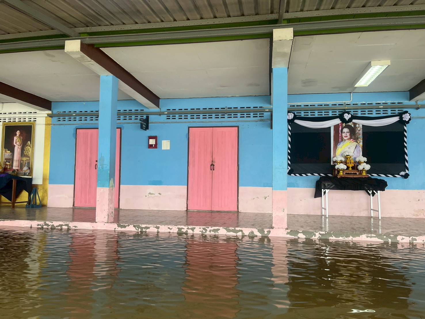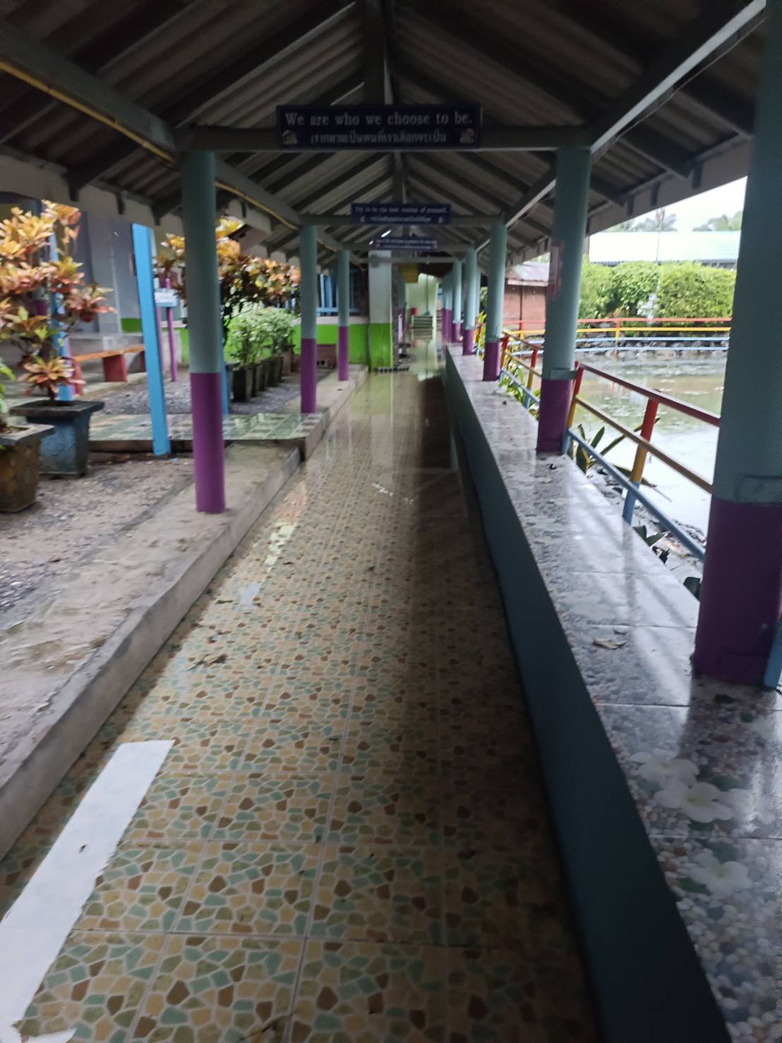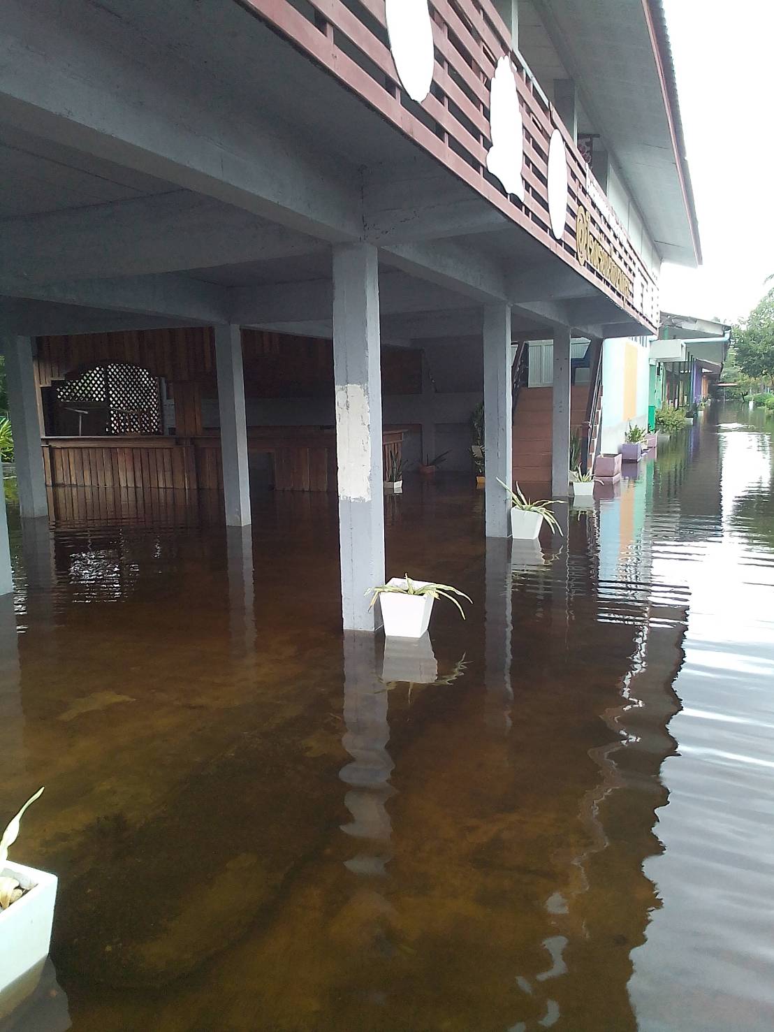 | สถานการณ์ :- น้ำท่วมจังสูงขึ้นเรื่อย ๆ ในพื้นที่หลังอาคารอเนกประสงค์ซึ่งติดกับลำคลองสูงกว่า50เซนติเมตร ฝ้าเพดานอาคารเรียนร่วงหล่นลงมาเรื่อย ๆ กระเบื้องหลังคาแตกร้าวน้ำรั่วซึมทำให้ไม้ที่รอวรับกระเบื้องผ?ุเริ่มเสียรูปโค้งลงมา ฝ้าเพดานผุร่วงลงมาทั้งสองขั้นทั้งฝ้าไม้เดิมและฝ้าปูน ระบบไฟฟ้าขัดข้องหลายจุดในห้องเรียนบนอาคาร พื้นอาคารอเนกประสงค์ทรดตัวลงมาก็จึ้น ฝาผนังร้าวแตกมีรอยแยกห่างออกมากกว่าเดิม ปูนฝาผนังแตกหักหลุดออกเหล็กโครงสร้างเสาผุกร่อน สัตว์มีพิษหนีน้ำเจ้ามาอาศัยบนฝาผนัวและที่ต่าง ๆ น้ำเริ่มเน่าเสีย ส่งกลิ่นเหม็นและก่อให้เกิดอาการคันมือเท้า โถส้วมถูกแรงน้ำดันขึ้นและหลุดลอยกับน้ำ โต๊ะเก้าอี้ขาเหล็กสำหรับนั่งรับประทานอาหารของนักเรียนเป็นสนิม