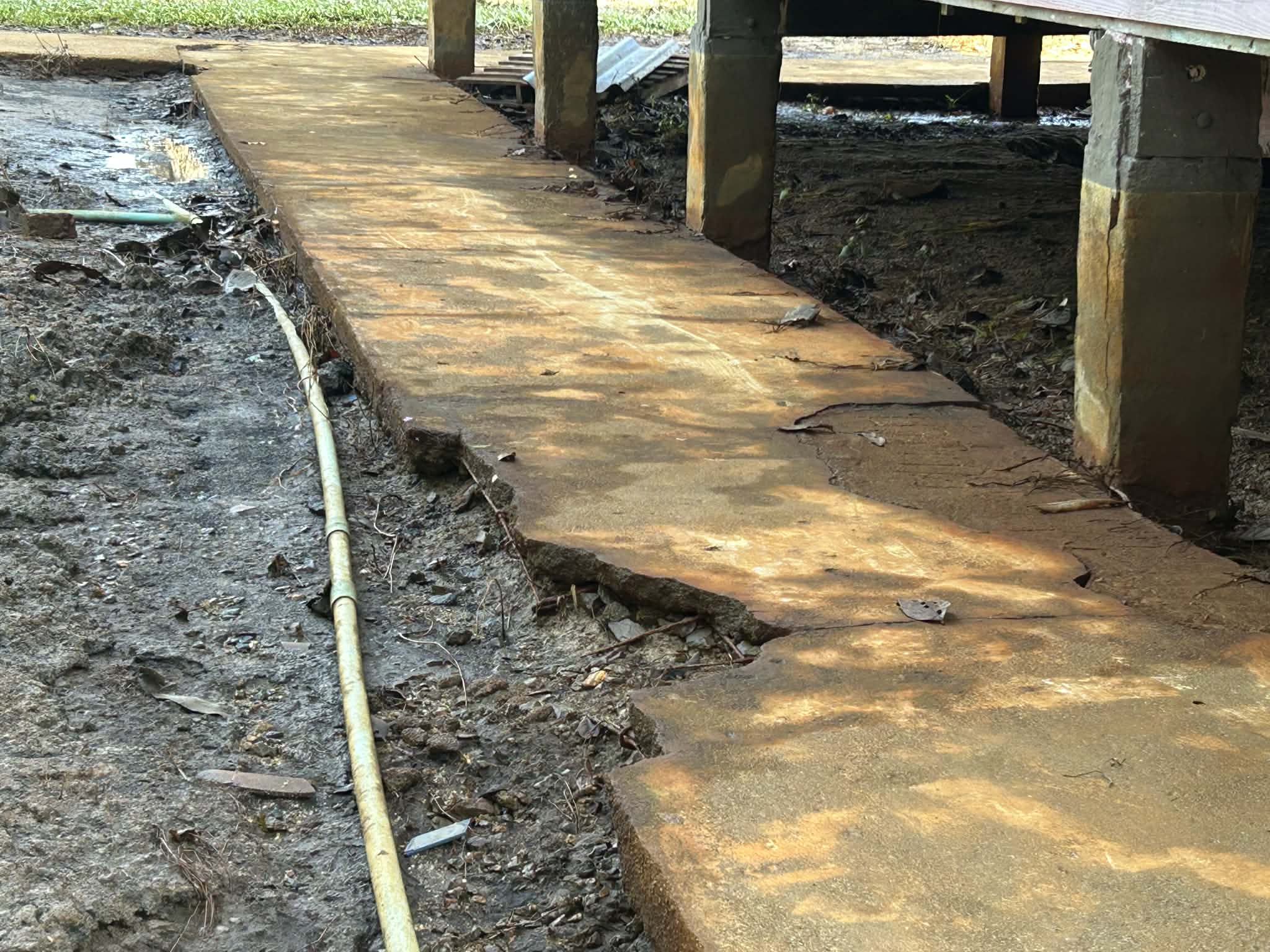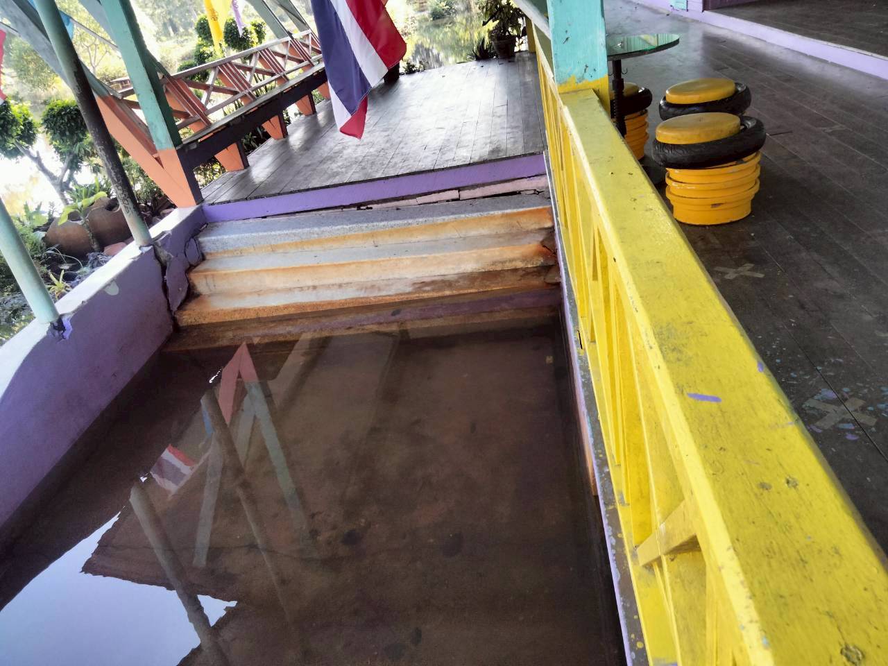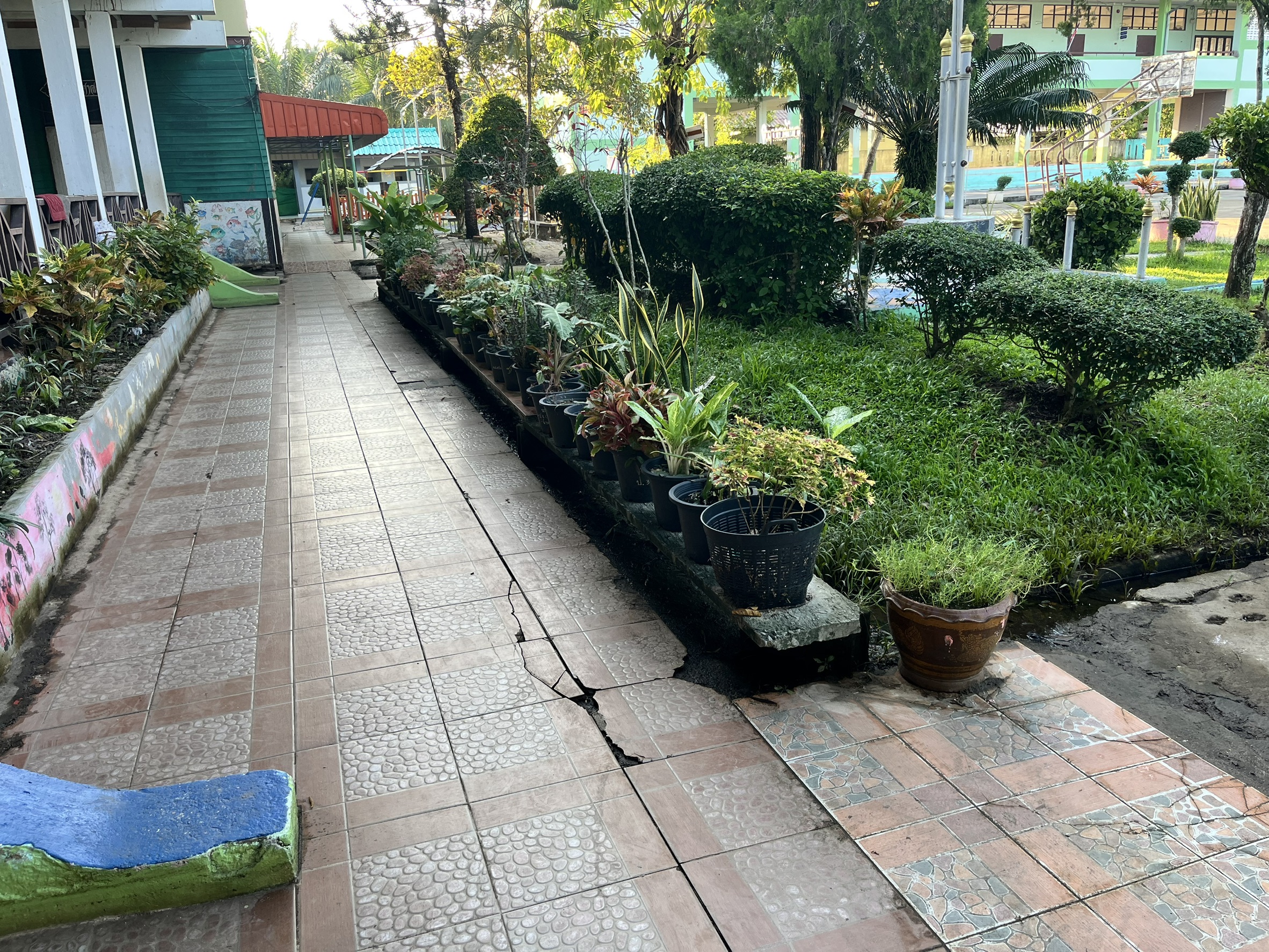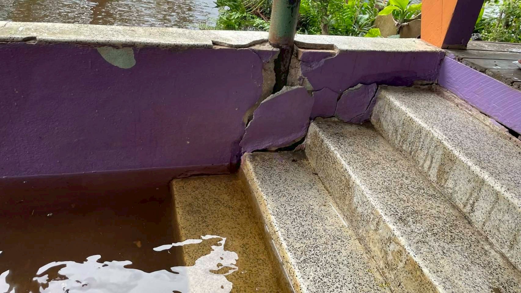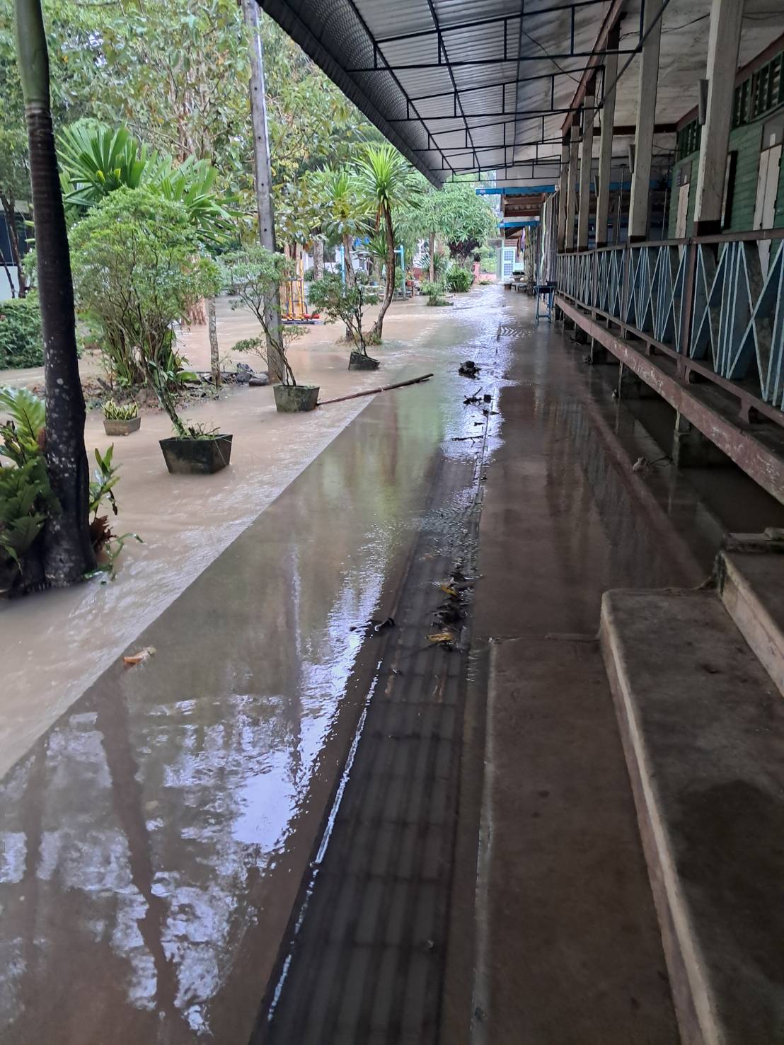 บันไดอาคารเรียนทรุดตัว ถนนในโรงเรียนโดนน้ำกัดเซาะเป็นหลุมบ่อ เครื่องเล่นชำรุด โรงเรียนไม่สามารถเปิดทำการเรียนการสอนได้