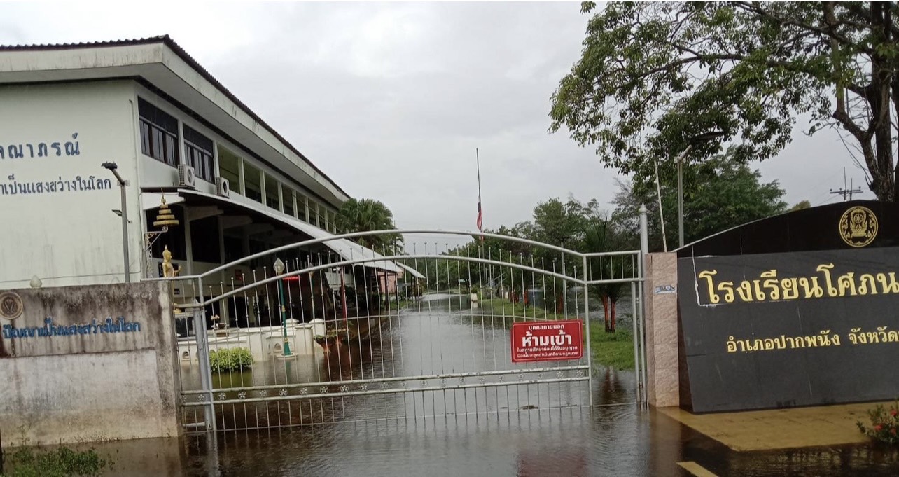| 159 | โศภนคณาภรณ์ สำนักงานคณะกรรมการการศึกษาขั้นพื้นฐาน (สพม.นศ.) | สถานการณ์ :- เนื่องจากสถานการณ์ฝนตกหนักอย่างต่อเนื่อง ส่งผลให้เกิดน้ำท่วมบริเวณโรงเรียนและชุมชนใกล้เคียง ทำให้การเดินทางมาโรงเรียนของนักเรียนไม่ได้รับความสะดวกและอาจเกิดอันตราย โรงเรียนจึงจัดการเรียนการสอนในรูปแบบ ออนไลน์ เป็นการชั่วคราว เพื่อความปลอดภัยของนักเรียนเป็นสำคัญ **ทั้งนี้ ฝนที่ตกหนักและลมพัดแรงยังส่งผลให้หลังคาโรงอาหารได้รับความเสียหายเปิดออก และพื้นอาคารเกิดการทรุดตัวเป็นบริเวณกว้าง