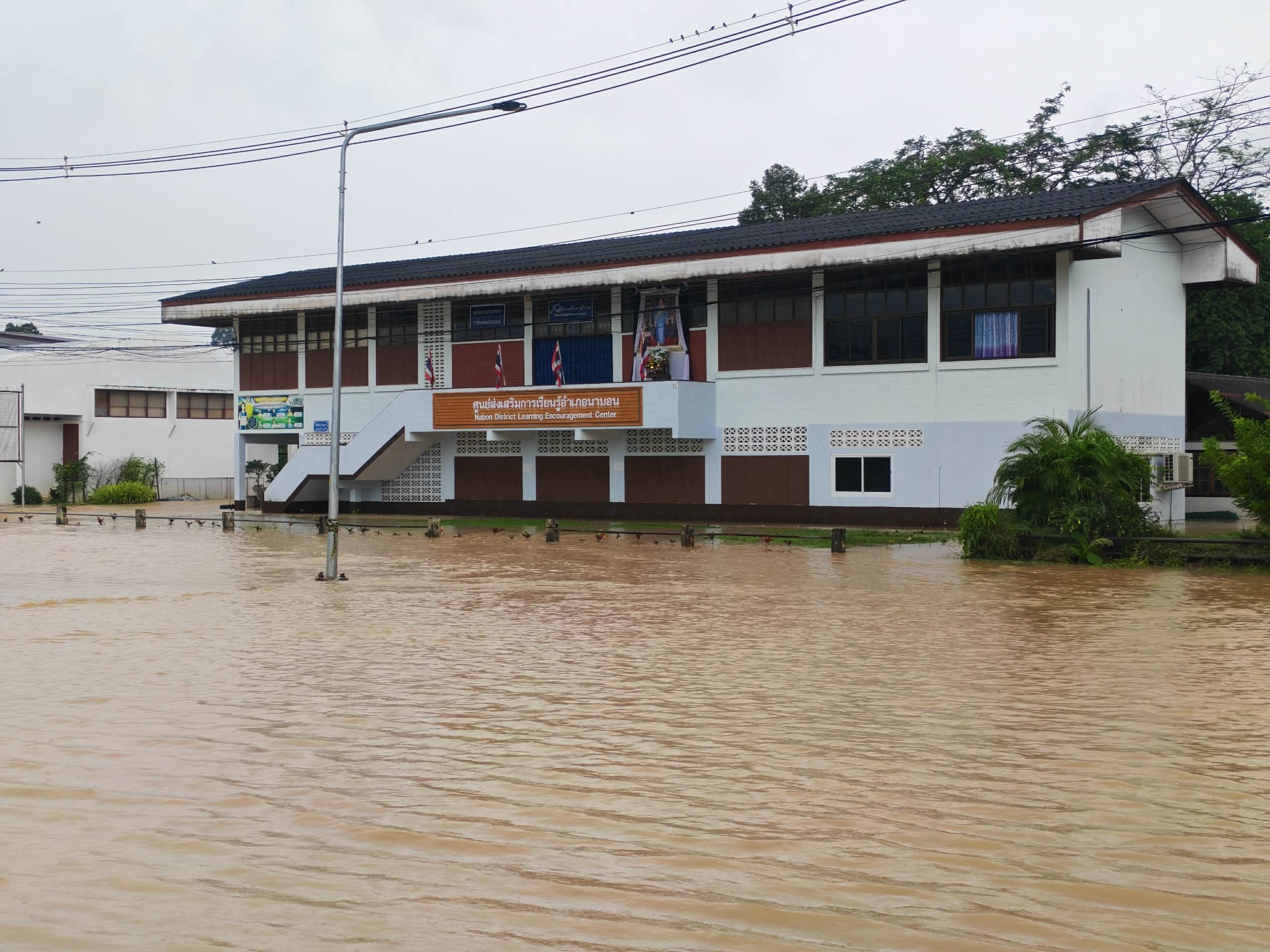 | 5 | สกร.อำเภอนาบอน กรมกรมส่งเสริมการเรียนรู้ | สถานการณ์ :- วันที่ 26 พ.ย.68 ปริมาณน้ำในคลองหลังสำนักงานได้เพิ่มปริมาณจนล้นตลิ่ง ประกอบกับมีฝนตกหนักอย่างต่อเนื่องเป็นระยะๆ มีน้ำไหนเข้ามาทางด้านหลัง ไหลผ่านชั้นล่างของสำนักงาน(ห้องเรียน ศรช.เทศบาลตำบลนาบอน) และยังคงขังอยู่ ระดับความสูงของน้ำอยู่ที่ประมาณ 20 เซนติเมตร ในส่วน ศกร.ระดับตำบลแก้วแสน ศกร.ระดับตำบลทุ่งสง และศกร.ระดับตำบลนาบอน ไม่มีน้ำท่วมขังแต่ได้รับผลกระทบ