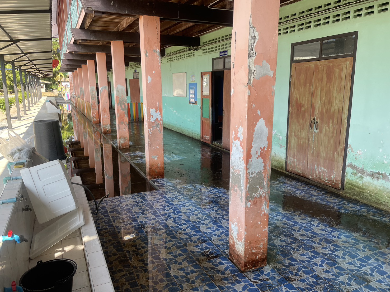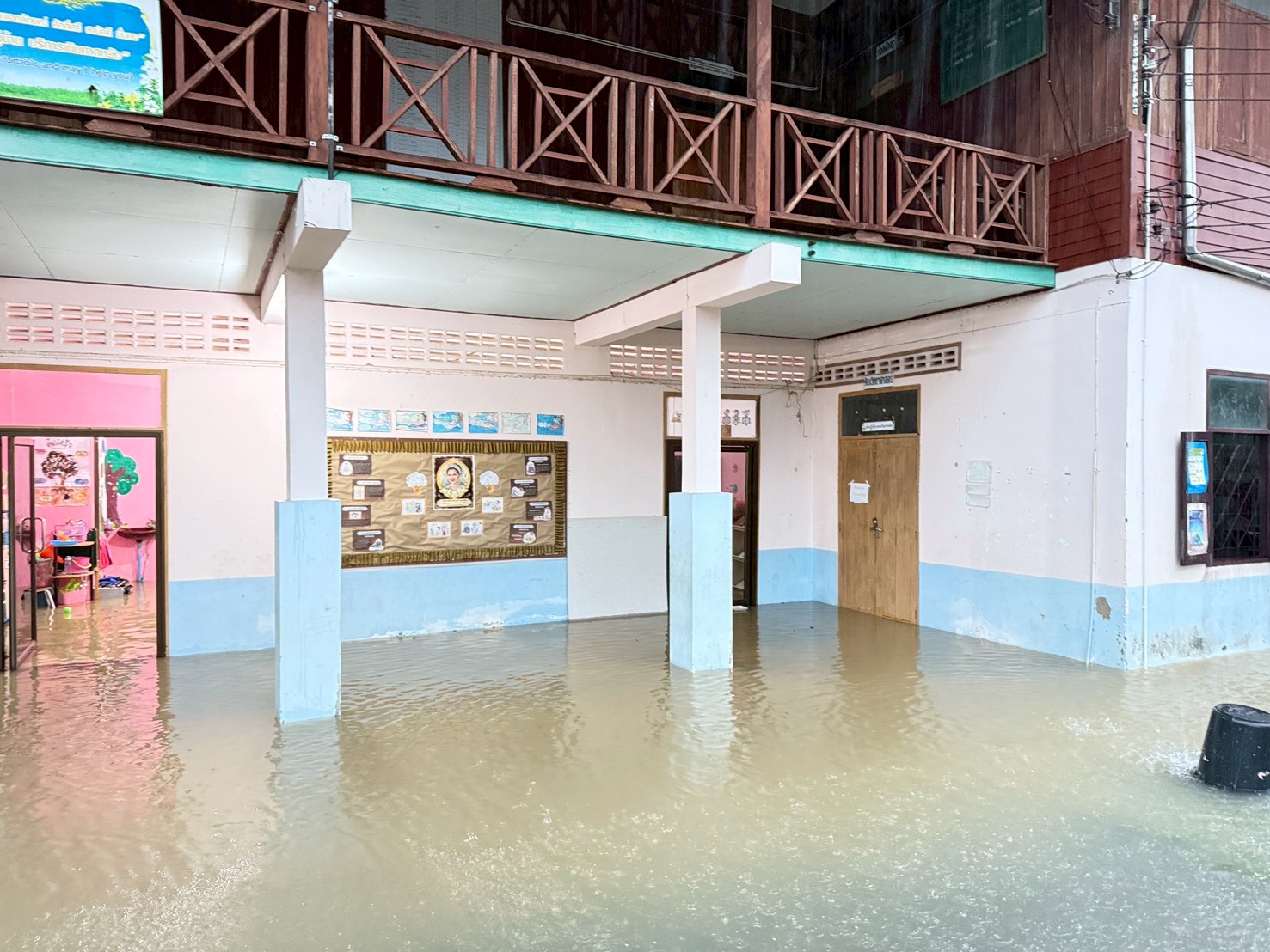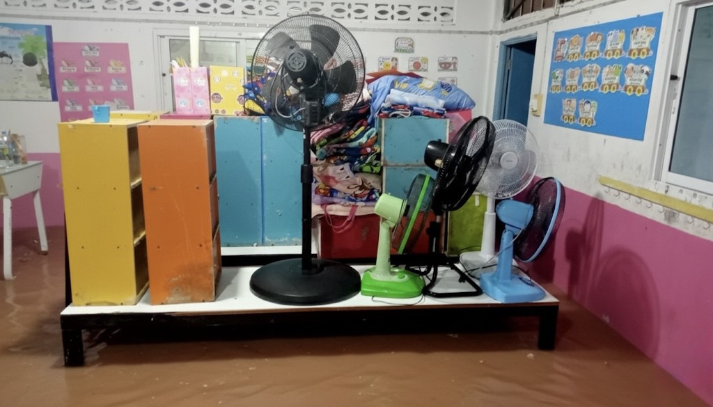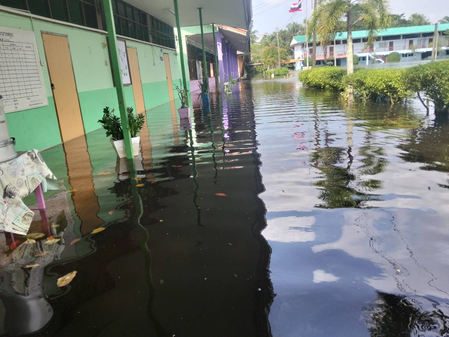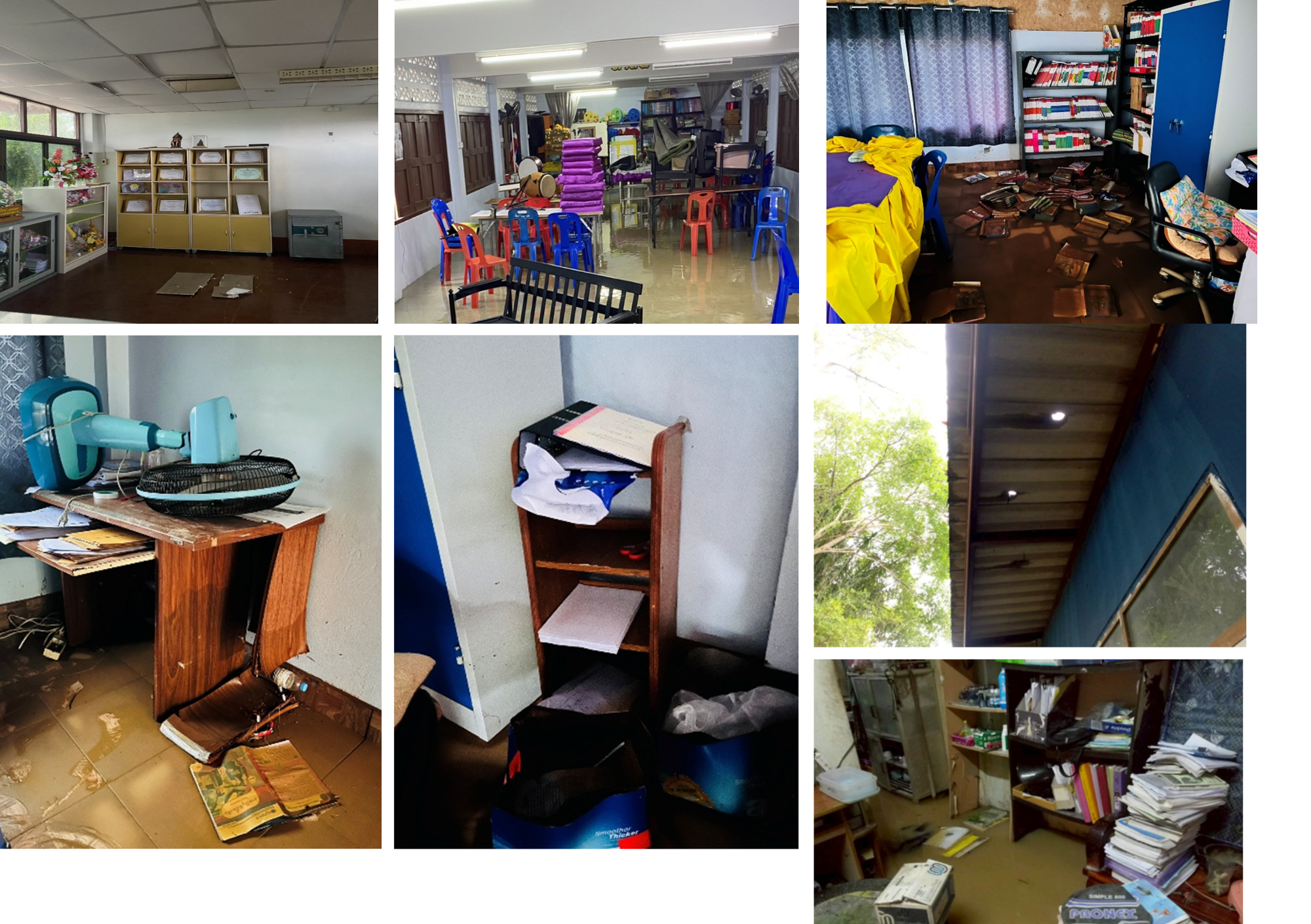 2. น้ำได้เข้าท่วมภายในอาคารหลายหลัง ได้แก่ อาคารสำนักงาน งานธุรการ งานการเงิน ห้องพักครูบางส่วน รวมถึงห้องเรียนบางห้อง ทำให้ไม่สามารถใช้งานพื้นที่ได้ตามปกติ