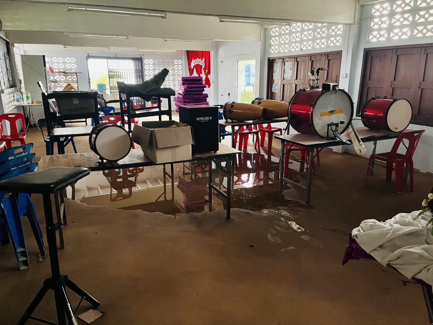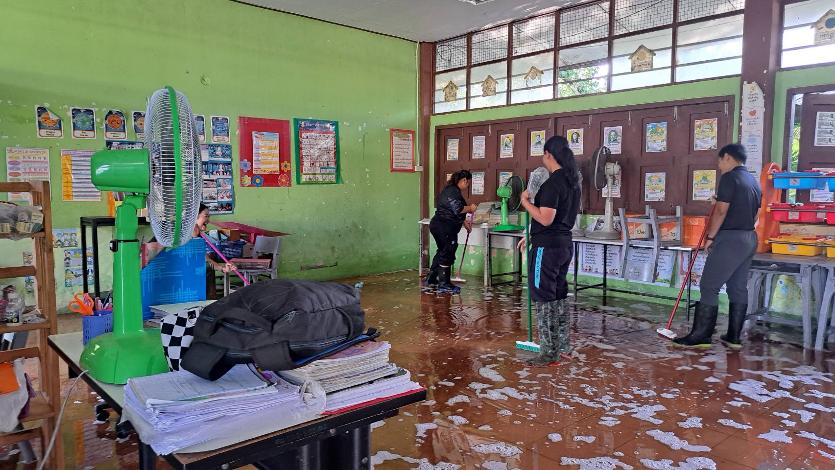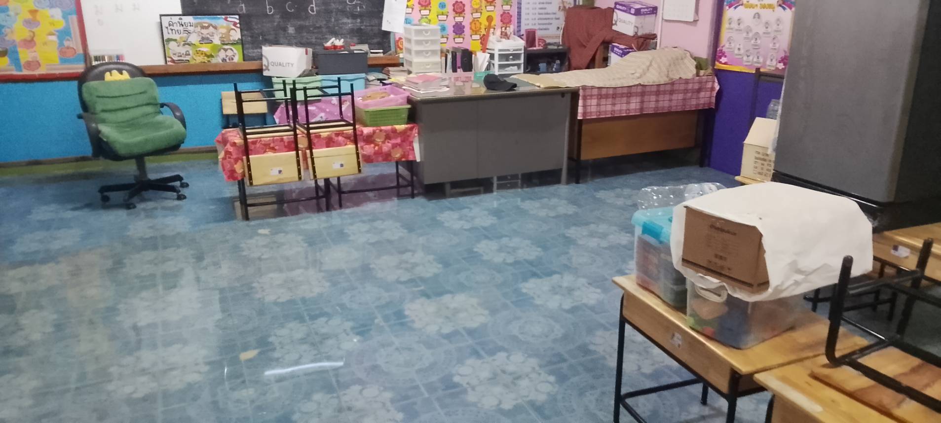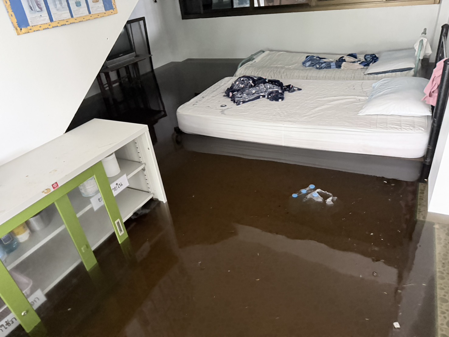 2. น้ำได้เข้าท่วมภายในอาคารหลายหลัง ได้แก่ อาคารสำนักงาน งานธุรการ งานการเงิน ห้องพักครูบางส่วน รวมถึงห้องเรียนบางห้อง ทำให้ไม่สามารถใช้งานพื้นที่ได้ตามปกติ