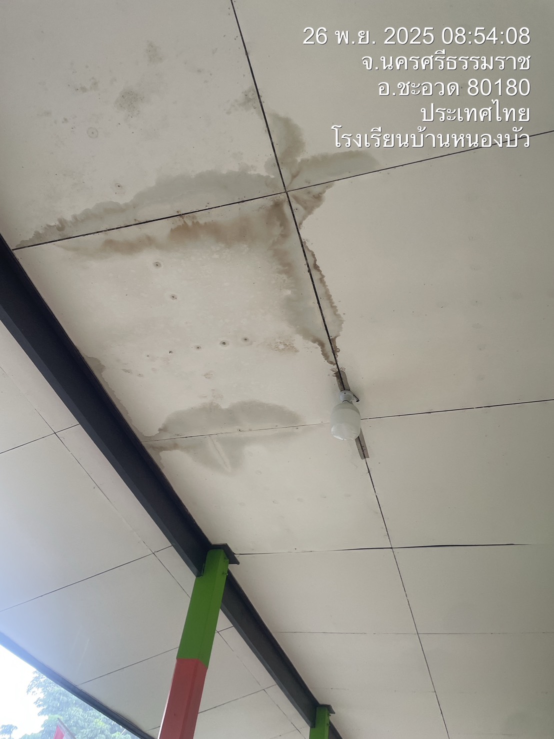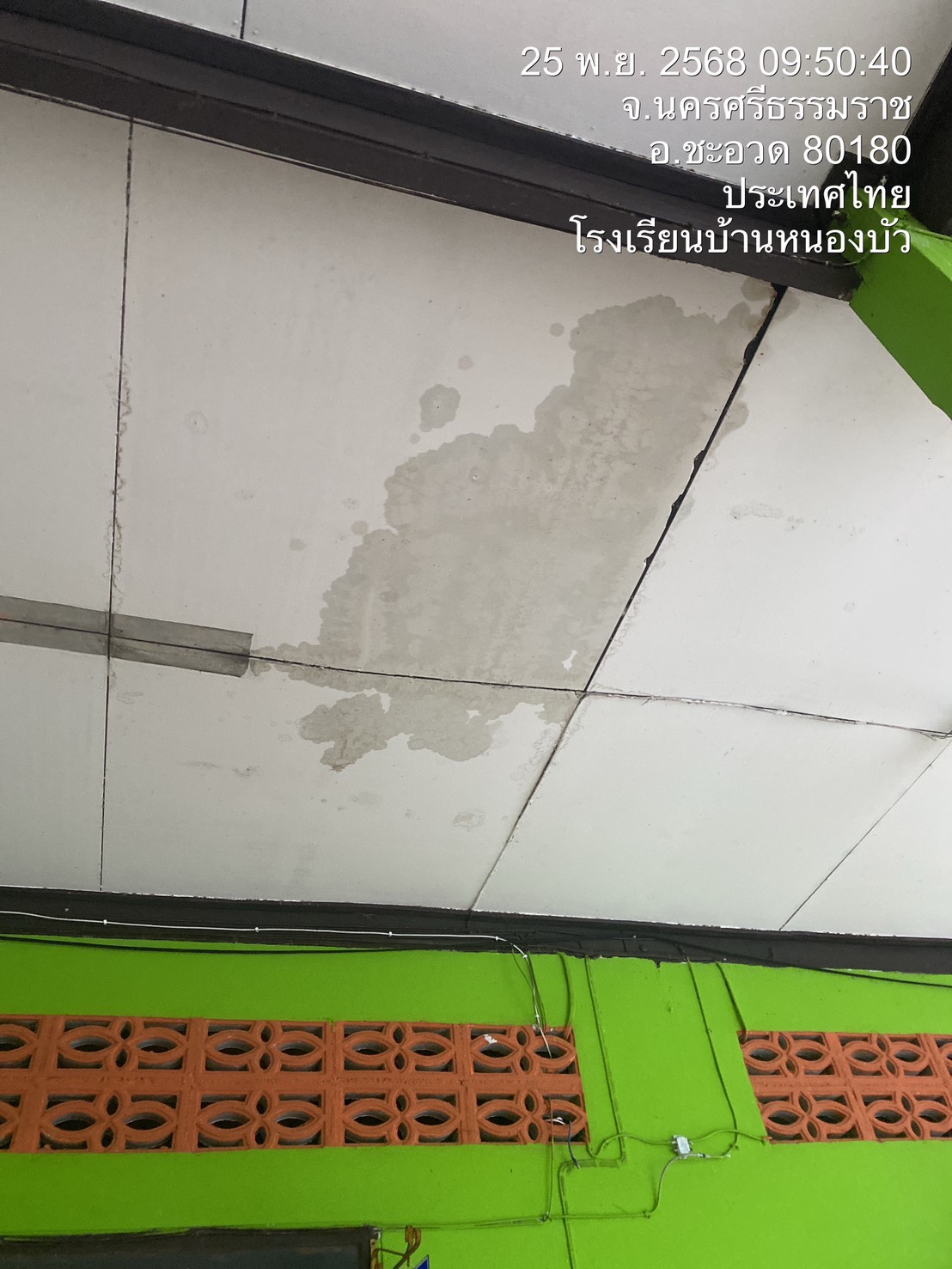 | 65 | บ้านบางพระ สำนักงานคณะกรรมการการศึกษาขั้นพื้นฐาน (สพป.นศ.3) | สถานการณ์ :- เนื่องจากสถานการณ์ฝนตกหนักอย่างต่อเนื่อง ตั้งแต่วันจันทร์ ที่ 17 พฤศจิกายน 2568 ส่งผลให้มีน้ำท่วมขังบริเวณโรงเรียนบ้านบางพระ จึงปิดเรียนด้วยเหตุพิเศษเพื่อความปลอดภัยของนักเรียน ในวันพฤหัสบดี ที่ 20 ถึง วันศุกร์ ที่ 21 พฤศจิกายน 2568 และเปิดเรียนตามปกติ ในวันจันทร์ ที่ 24 พฤศจิกายน 2568 พบความเสียหาย กระเบื้องหลังคาห้องน้ำ ชาย หญิง และอาคาร 2 แตกและมีการเคลื่อนตัว ฝาเพดาน อาคาร 2 มีการรั่วซึมเป็นจำนวนมาก